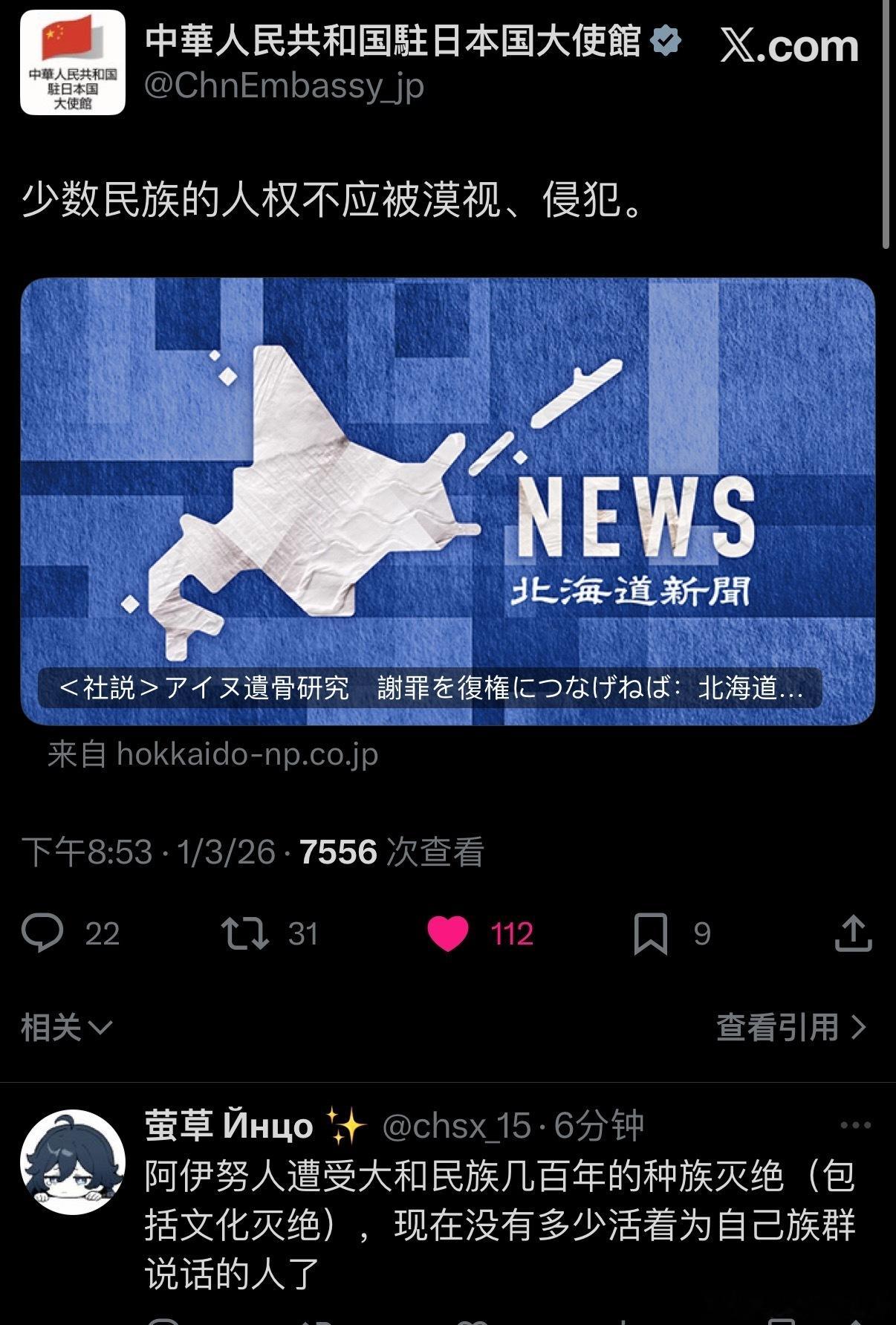 新的一年,继续锤,中国驻日本大使馆转发北海道媒体发布的有关阿伊努人的新闻。热点观点烽火问鼎计划
