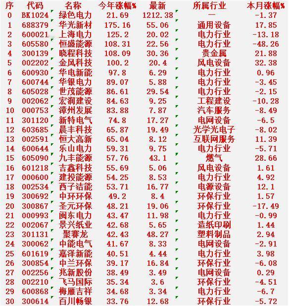 绿色电力概念,2025年以来涨幅最多的30名单 绿色电力:今年涨幅 +21.69%,本月涨幅 -1.37% 华光新材:今年涨幅 +175.16%,最新价 55.06元,本月涨幅 +17.85% 上海电力:今年涨幅 +125.20%,最新价 20.02元,本月涨幅 -13.18% 恒盛能源:今年涨幅 +108.31%,最新价 22.56元,本月涨幅 -48.26% 晓程科技:今年涨幅 +108.09%,最新价 30.36元,本月涨幅 +21.88% 金风科技:今年涨幅 +100.20%,最新价 20.40元,本月涨幅 +32.38% 华电新能:今年涨幅 +97.80%,最新价 6.29元,本月涨幅 +0.96% 华银电力:今年涨幅 +89.07%,最新价 5.88元,本月涨幅 -3.45% 世茂能源:今年涨幅 +86.61%,最新价 29.54元,本月涨幅 -2.15% 宏润建设:今年涨幅 +84.63%,最新价 9.25元,本月涨幅 -10.28% 漳州发展:今年涨幅 +83.88%,最新价 7.87元,本月涨幅 -8.49% 新特电气:今年涨幅 +74.80%,最新价 17.27元,本月涨幅 -6.50% 晨丰科技:今年涨幅 +65.87%,最新价 19.49元,本月涨幅 -8.02% 恒大高新:今年涨幅 +65.04%,最新价 8.12元,本月涨幅 +11.39% 乐山电力:今年涨幅 +59.31%,最新价 9.75元,本月涨幅 -5.71% 九丰能源:今年涨幅 +57.76%,最新价 43.10元,本月涨幅 +28.66%