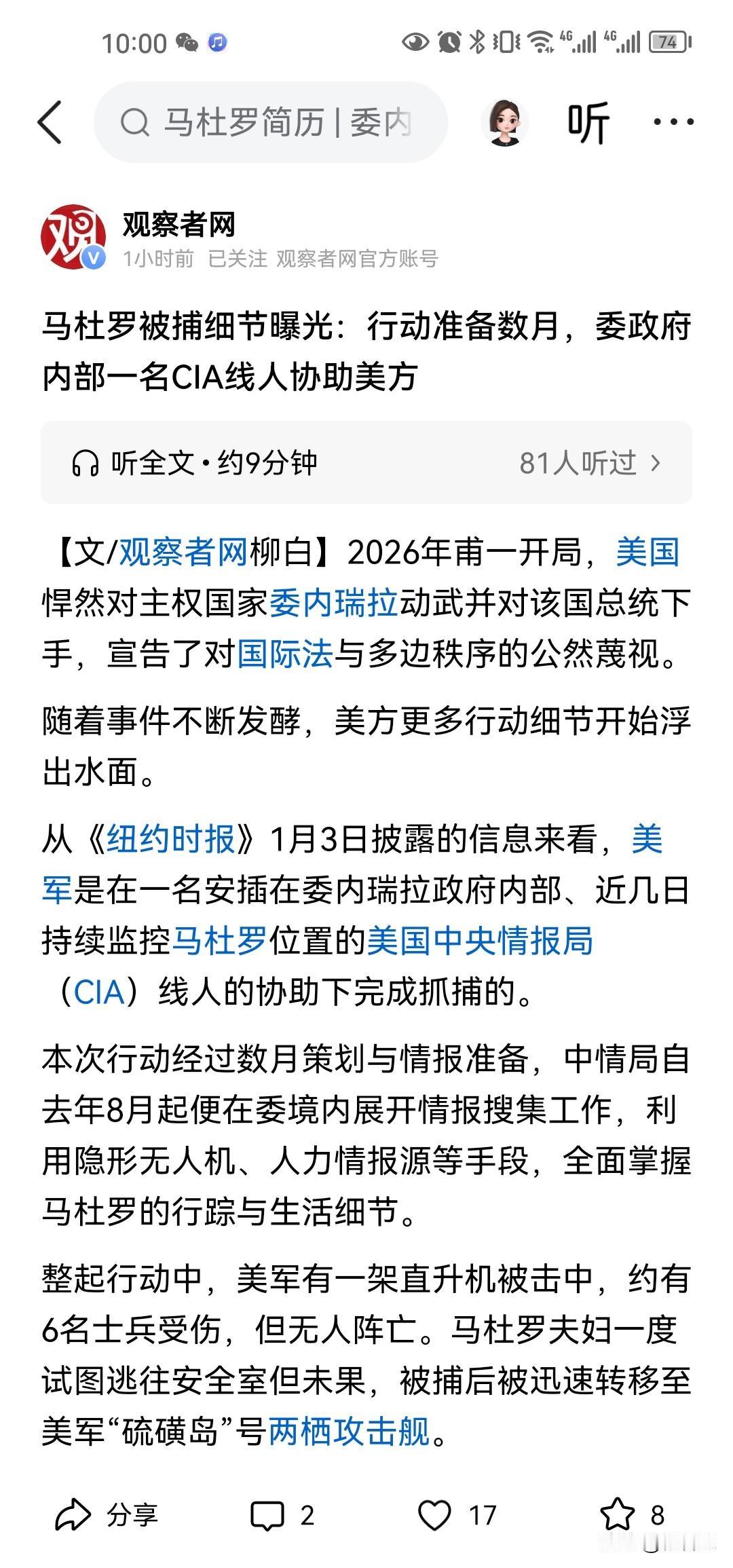 果然是有内奸,马杜罗被捕细节曝光,美国行动准备数个月,委内瑞拉政府内部有一名CIA的线人协助美方。我不得不承认,不管是情报还是决策行动,美国这次确实很牛逼的。特朗普都说了,这次行动是展现美国最强的军事实力与震撼力的条件之一。 美国防长很嚣张说,在委内瑞拉的行动,任何一个国家都没有美国这种能力。我们扪心自问,如果我们周边的小国对中国利益构成了威胁,我们有这种能力吗?我相信我们有能力,有实力。但我们有这种勇气吗?这个很关键。 我们也可见委内瑞拉这个国家早就被渗透成筛子了,美元开到道,攻击力甚强,咱们看到这个情况,要举一反三,都提前好好查查,引以为戒。特别是我们一些特殊部门,他们有留美经历,留洋经历的,这种人在重要岗位上一定要慎重,哪怕他没有留洋经历,他出过国的也不得不防,其实现在要查一名间谍很容易的,现在是大数据时代。只要查,一切都有迹可循。 美国如此肆无忌惮侵犯一个国家,把一国元首强行抓描令人发指,但他确实做了,也对他无可奈何,你看西方的舆论感觉就风平浪静,这就是美元霸权的好处,美国只要随便用点钱就可以收买别国的人和媒体,这样代购价很低。对我们一样,美元霸权地位不倒,全世界人民都受其剥削或者说都是受害者。 说回这个马杜罗事件,委内瑞拉已经落到了美国的手中了,特朗普说组成团队管理委内瑞拉,相当于委内瑞拉成为美国的囊中之物。中国在那边的利益能不能保住?我们要做好准备。