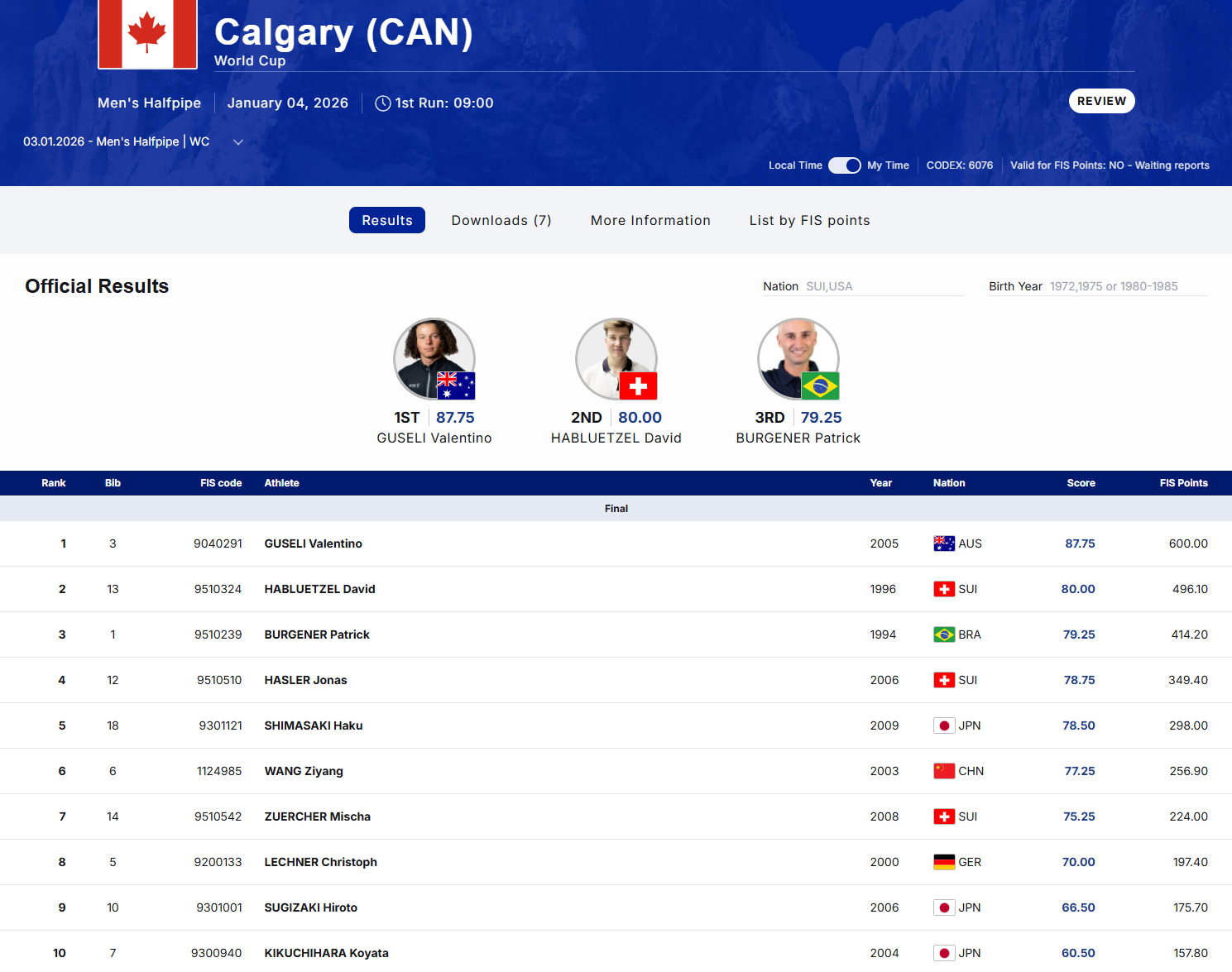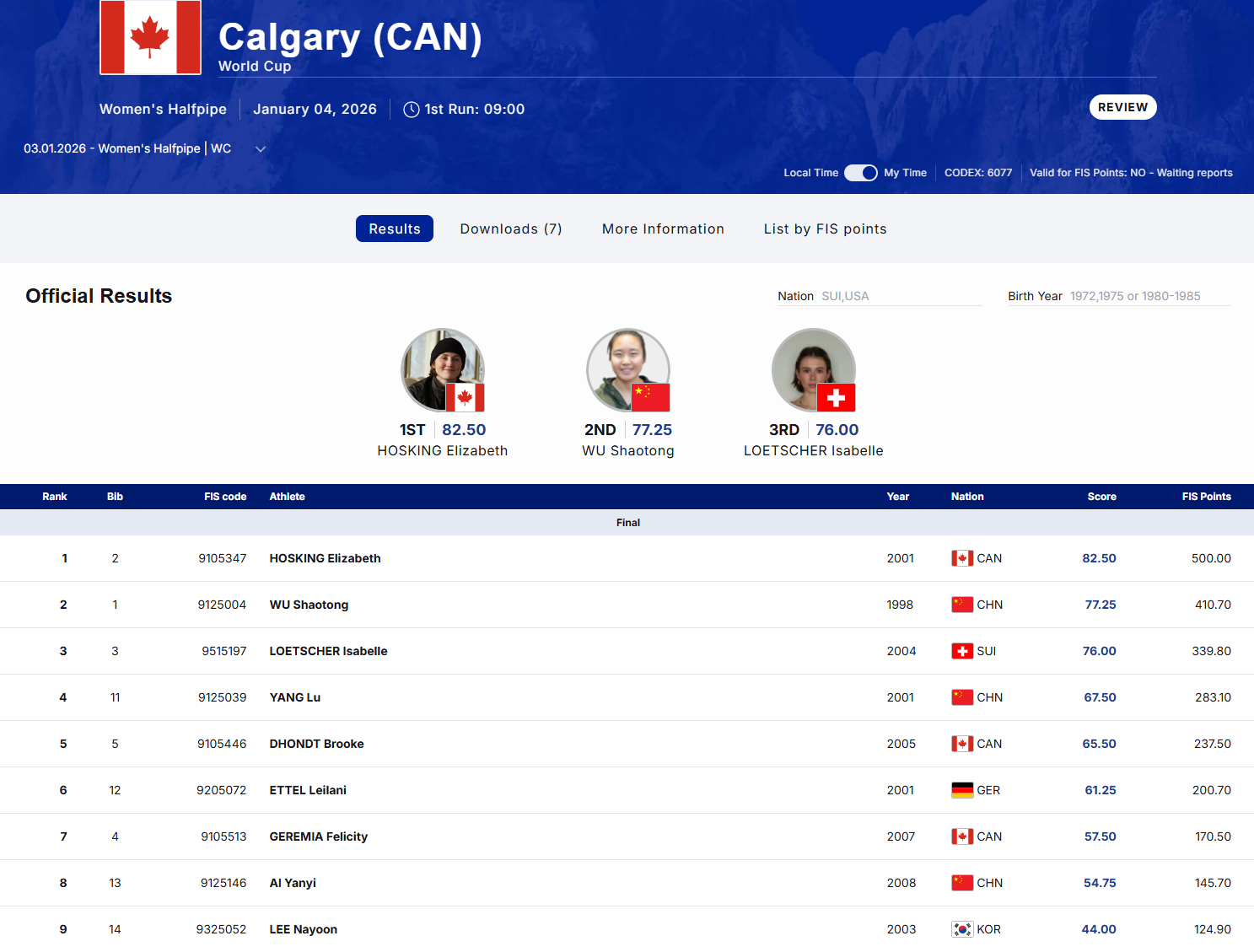 #武绍桐世界杯U池银牌# 单板滑雪世界杯U型池加拿大卡尔加里站结束男女决赛女子组:中国选手武绍桐77.25分夺得银牌,杨露、艾妍伊排名第四和第八男子组:中国选手王梓阳排名第6#看冰雪上咪咕#