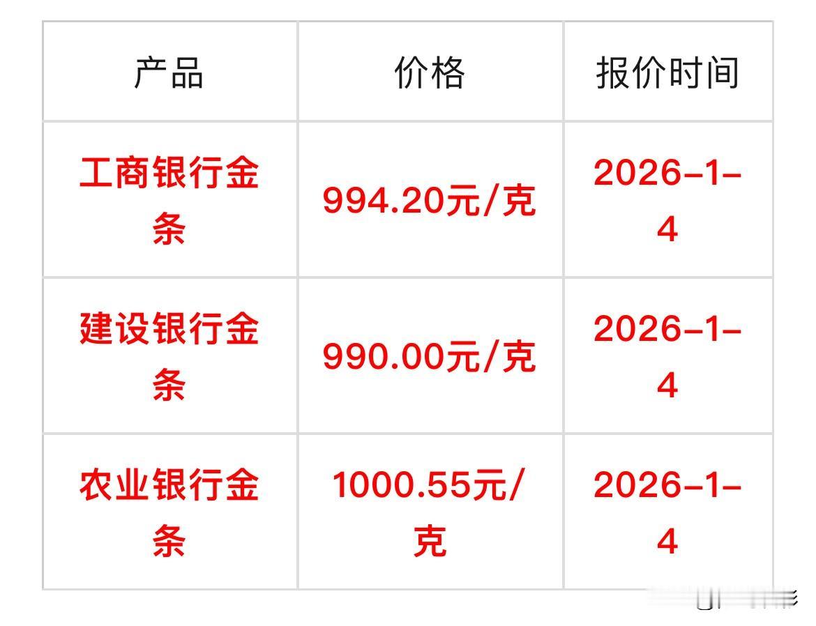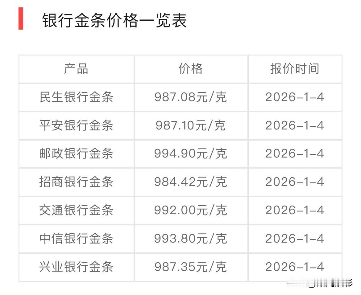快看! 各大银行金条价格可以查看了! 那么,来看看!今天各大银行金条价格有没有涨价呢? 工商银行金条994.20元/克, 建设银行金条990.00元/克, 农业银行金条1000.55元/克, 邮政银行金条994.90元/克。 同比于昨天各大银行金条价格有所下降了,工商银行金条价格下降了4.08元/克,建设银行金条价格下降了4.2元/克,邮政银行金条价格与农业银行金条价格保持不变。 银行购买金条需要注意事项: 第一:外包装不要损坏,千万不要,否则影响以后的回收!切记! 第二: 三码合一,也就是金条上的钢印,证书的证书号,提货单上的产品编码,必须一一对应。 无论银行工作人员怎么解释说没事,也多为自己防范一下,要求他们做到三码合一。 另外,买前多比较,不同银行价格不一样,可以货比三家,这样不吃亏。还有多关注国际黄金价格,选择金价最低点时买入。还有量力而行,不要将所有的资金都投入黄金。 所有信息,都只是提供参考价值! 购买黄金有风险,投资需要谨慎小心,不要盲目跟风! 投资金条金价 金条行情 银行金条 黄金一克小金条 银行金条价 普通人买金条 金条避坑