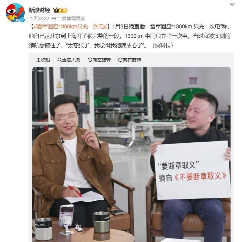 雷军回应1300km只充一次电 正常表达续航里程吧,非要玩这么多的心眼,也不想想为什么风评转低?你怎么不表达只充两次电,就接近2000公里呢?新华社,““大字吸睛、小字免责”,这样的小把戏该退场了”雷军称小米车轮子撞掉是丢轮保车,雷军确认小字营销要改,雷军回应两百公里瞬间刹停,热点观点