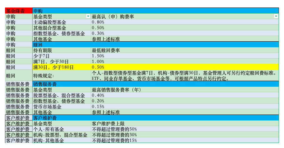 公募基金销售环节的降费文件发布了,大概有这么几个影响:1、申购费按照0.8%,0.5%,0.3%来收费,因为申购都打折了,所以影响不大。2、赎回费里面要求场外主动基金持有6个月以上才能免赎回费,基民可能就不买场外主动产品了,要么就买LOF上市的主动产品,比如兴全合润这样有场内份额的主动基金。或者就干脆买指数基金+行业基金,自己手搓一个主动组合。3、以前大家爱买C类产品,销售服务费是0.6%,现在直接限制不高于0.4%,这个还是比较友好的。4、机构申购的产品,进一步降低分润,以后机构的价值就降低了,对于销售机构来说可有可无了。