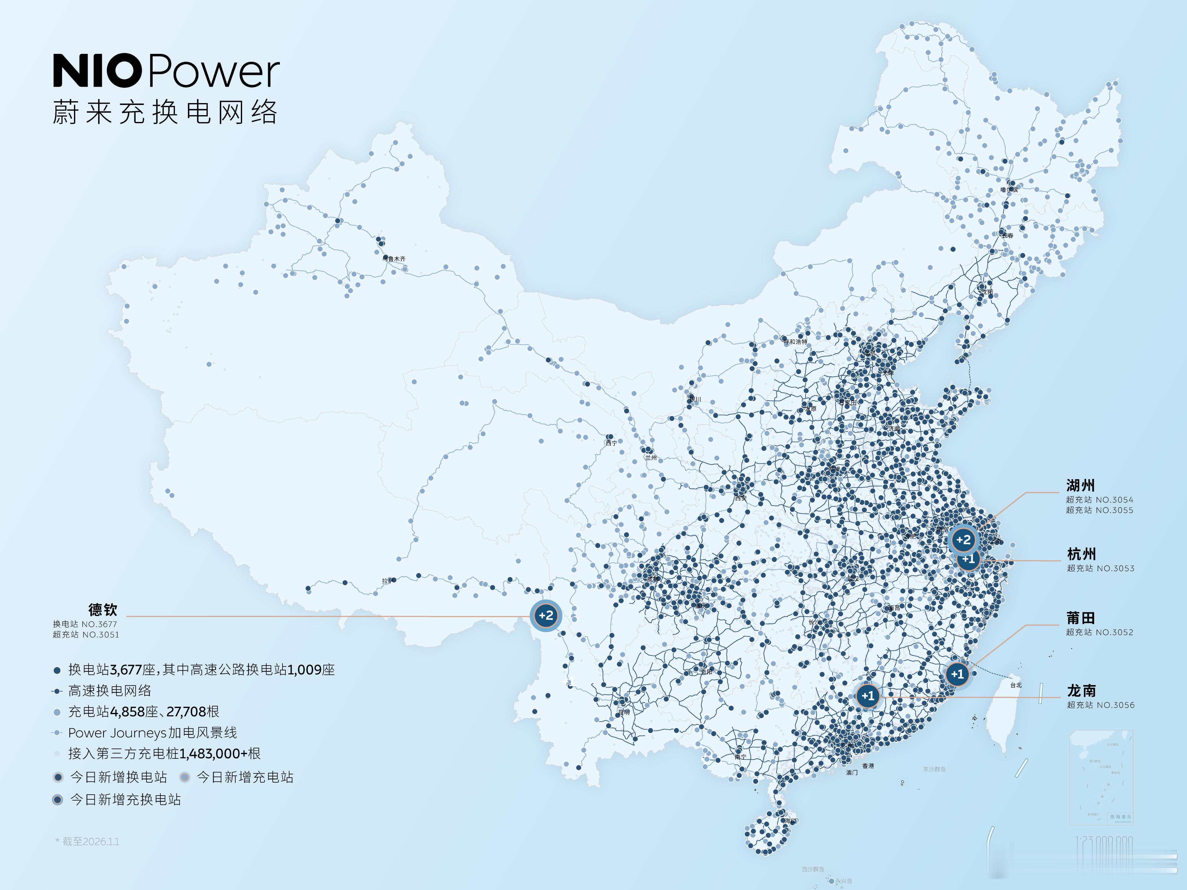 1月1日 NIO Power 7站上线NO.3677 蔚来换电站 | 德钦梅里雪山NO.3051 蔚来超充站 | 德钦梅里雪山NO.3052 蔚来超充站 | 莆田天龙世纪广场NO.3053 蔚来超充站 | 杭州石桥路西子孚信NO.3054 蔚来超充站 | S13练杭高速德清服务区杭州方向NO.3055 蔚来超充站 | G50沪渝高速长兴服务区上海方向NO.3056 蔚来超充站 | 龙南凯里亚德酒店持续布局-让加电比加油更方便