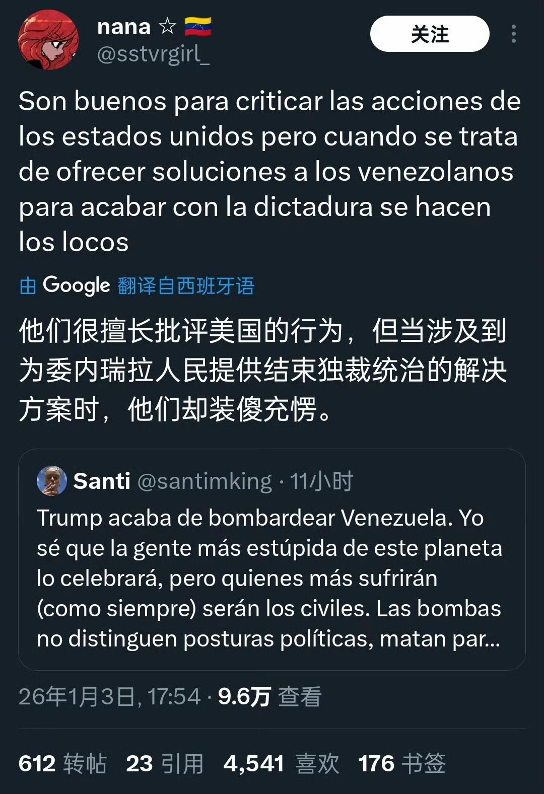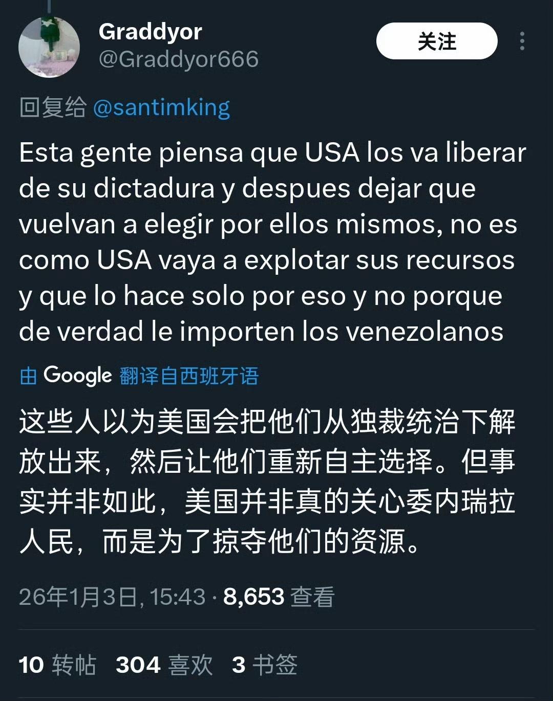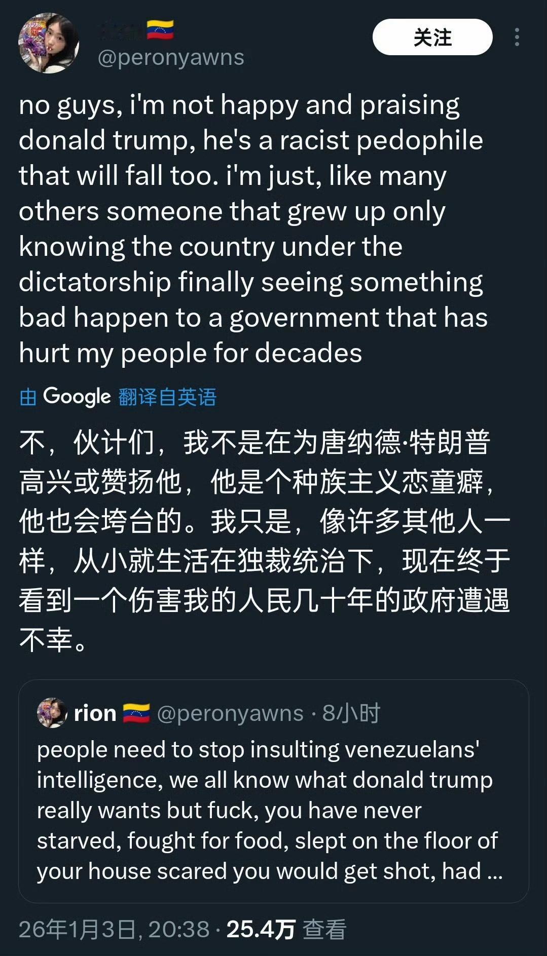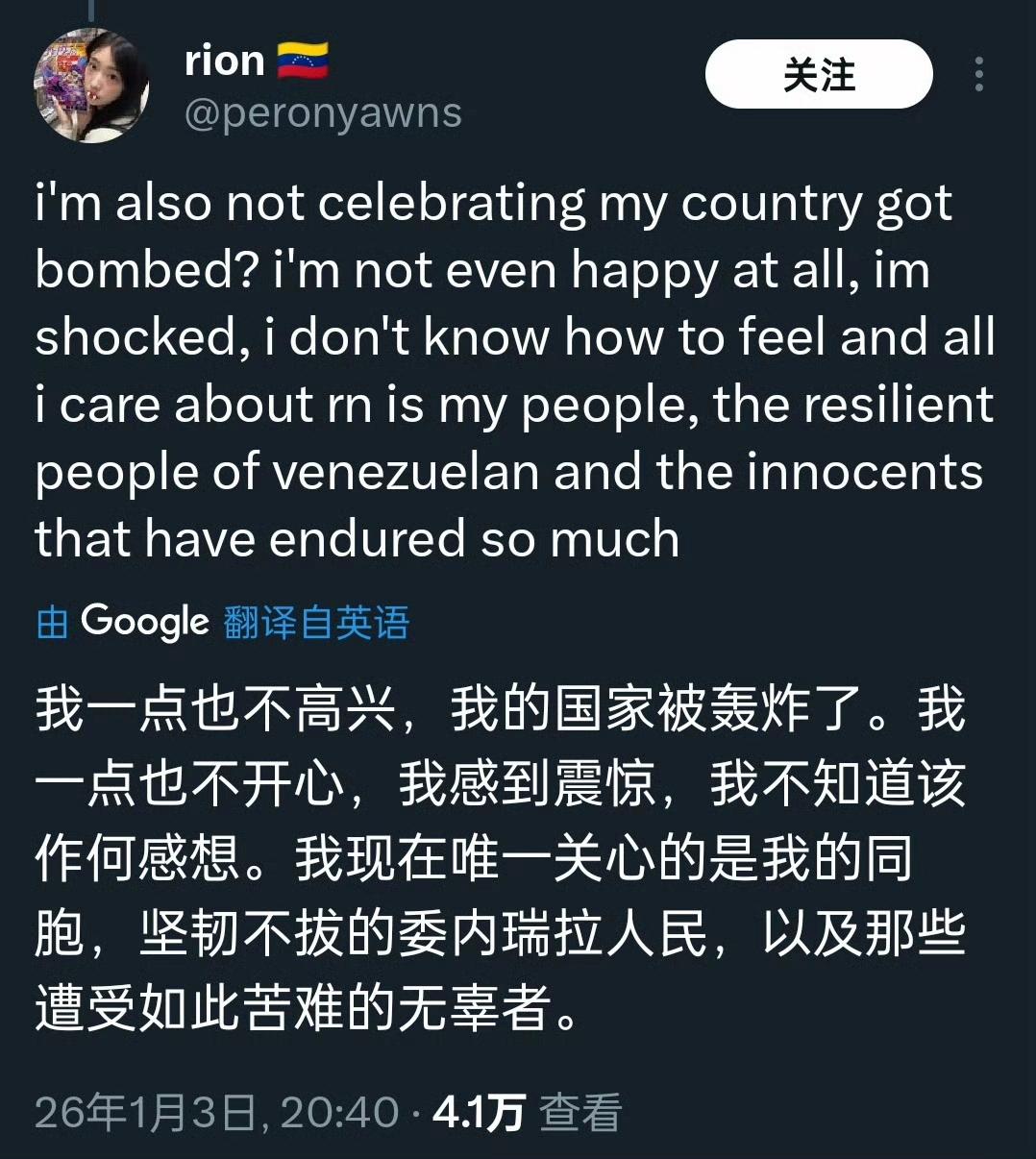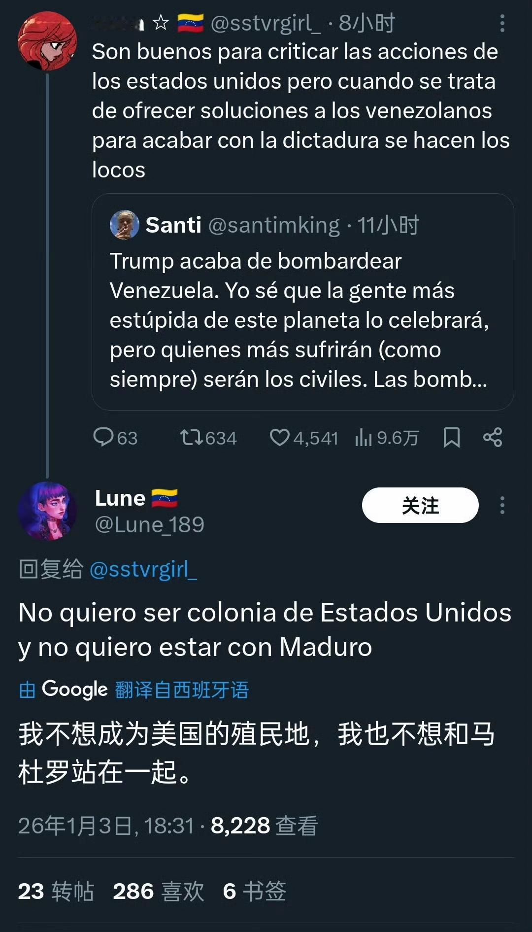 委内瑞拉网友对马杜罗被美国抓走的想法与争论[灵光一闪] 有兴高采烈的,也有愤慨不安的,但更多的恐怕是透露着对未来的迷茫和焦虑,这就是拉美小国的无奈与悲哀,身处美国门罗主义的巨大阴影之下,命运往往无法掌握在自己手里,任由城头变幻大王旗,最终受苦的总是百姓