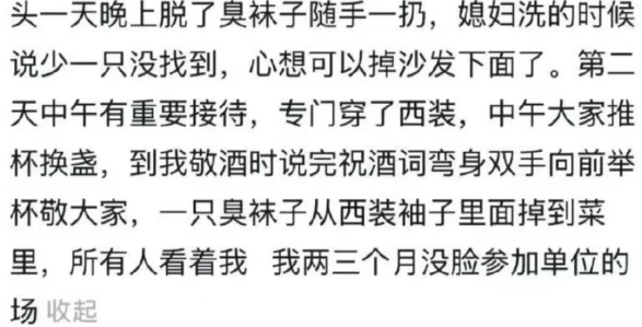 中午大家推杯换盏,到我敬酒时说完祝酒词弯身双手向前举杯敬大家,一只臭袜子从西装袖子里面掉到菜里,所有人看着我,我两三个月没脸参加单位的场