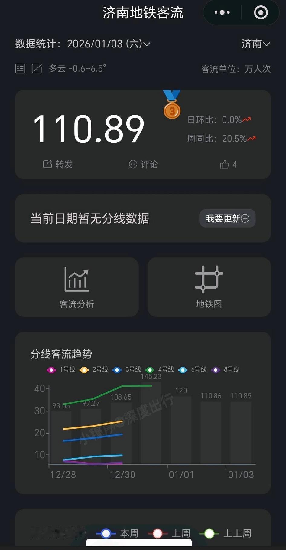 2026年元旦最后一天假期青岛和济南地铁客流量对比,双方已经很接近了。 1.3号青岛地铁客流是126万,济南则是11万。目前济南地铁客流比青岛地铁客流只少15万。 但是青岛地铁运营里程要比济南地铁运营里程高出170公里。而且济南地铁几条线是新开的,还在客流培育期。 目前青岛地铁工作日平均客流量在140万左右,这个数据已经持续了很长时间,可以说比较成熟了。济南这边数据比较少,还在客流培育期,但开通后两个工作日客流量都突破百万。 如果济南地铁客流量培育的比较好的话,那么日均客流量增加个四五十万没啥问题。到时候济南地铁客流量会超过青岛。 目前而言,济南地铁客流强度已经超过了青岛。