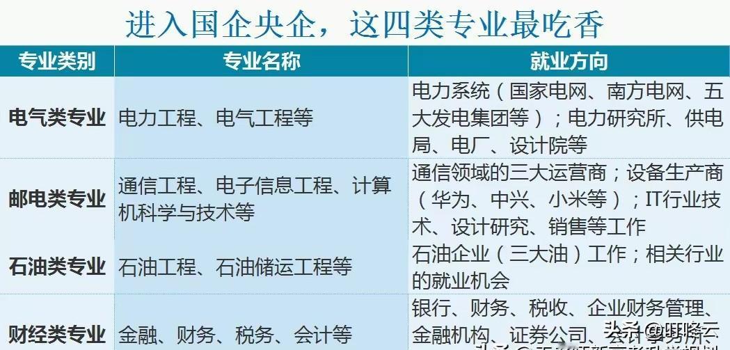 什么专业容易进央企国企? 这四类专业进国央企最容易,专业对口最受欢迎!分别是:1.电气类专业,就业对口电力能源类央国企;2.电子类专业,就业对口四大运营商,通讯设备制造商,IT企业等等;3.石油类专业,就业对口三大石油企业;4.财经类专业,就业对口银行、税务等等企业。速速围观揭秘详细内容! 欢迎关注@叮咚云 将优先为粉丝职业规划指导,1对1咨询是付费服务,为你定制最适合的就业择业方案!欢迎留言交流讨论。[来看我][来看我] 免责声明:图片来自网络,仅供参考! 央国企求职 央国企招聘 央国企求职条件十大吃香专业