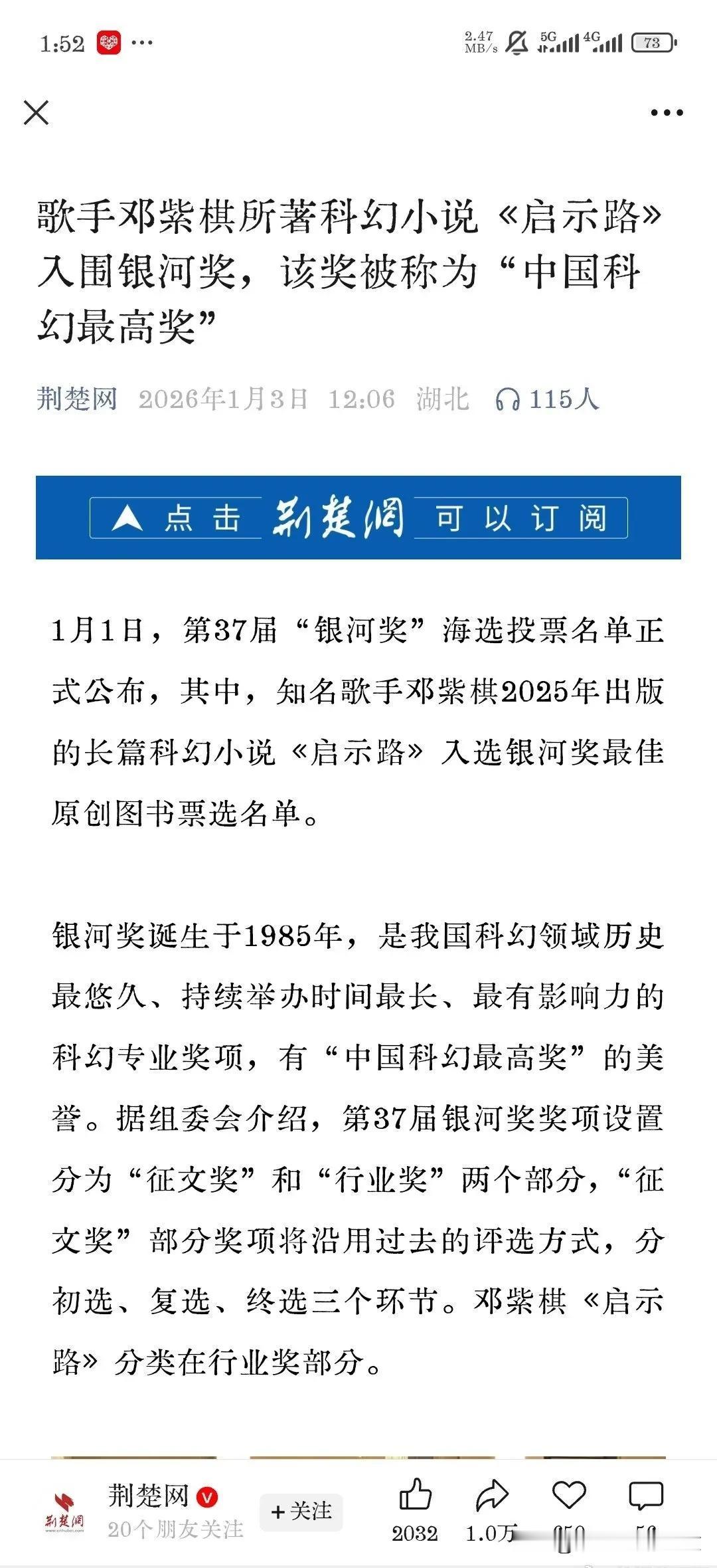 《启示录》,邓紫棋的一部长篇科幻小说? 关于“邓紫棋长篇科幻小说《启示录》”,这其实是一个常见的误解。邓紫棋并没有出版过名为《启示录》的科幻小说。 这个混淆主要来源于她于 2022年推出的同名音乐专辑《启示录》。这是一张极具科幻色彩和完整世界观的概念专辑,其形式非常独特,很容易让人联想到一部小说或一部电影。 这不是一部小说,而是一个“音乐连续剧”形式的专辑项目。它构建了一个完整的末世科幻故事,其复杂程度和叙事性堪比一部影视作品或小说。 1. 核心形式与创新: · 音乐连续剧:全专辑14首歌,每首歌都配有一部高质量的音乐MV,这些MV按顺序讲述了一个完整的故事。 · 元宇宙世界观:故事发生在一个末日后的未来世界,人类生活在名为“乐土”的虚拟元宇宙中。 2. 故事剧情梗概: 故事主角 Gloria(歌莉雅) 和 Evan(爱凡) 是一对在“乐土”中相识的恋人。 · Gloria 在现实中因外貌自卑,但在虚拟世界中与Evan相爱。 · Evan 渴望在现实中也见到Gloria。 · Gloria 因为一场意外,在现实中陷入了昏迷。 · 于是,Evan 决定踏上跨越虚拟与现实的冒险,试图唤醒Gloria。 整个故事探讨了爱、真实与虚幻、自我认同、科技与人性的关系等深刻主题。 3. 为什么会被误认为是“小说”? · 强烈的叙事性:专辑本身就是一个完整的故事,有清晰的人物、背景、起承转合。 · 视觉化呈现:高品质的MV将故事视觉化,观看MV就像追一部剧集。 · 丰富的文本设定:邓紫棋为这个“启示录”世界创作了大量的背景设定和人物小传,这些文本内容与音乐相辅相成,共同构建了宏大的世界观。 4. 相关衍生内容(最接近“小说”形式的部分): 虽然不存在官方小说,但邓紫棋和团队为了丰富世界观,发布过一些图文故事、角色设定、世界观解析等。粉丝也会根据MV剧情整理出详细的“剧情解析”和“时间线”,这些阅读起来颇有科幻故事的质感。 总而言之,邓紫棋的《启示录》是一个突破性的音乐叙事项目,它用音乐和影像“写”出了一部动人的科幻寓言。虽然它不是一部传统意义上的小说,但其故事的内涵和广度,绝对能满足科幻故事爱好者的期待。
