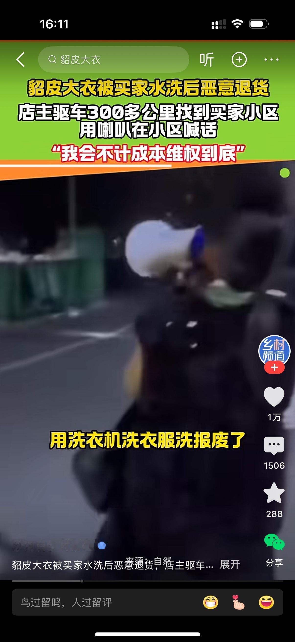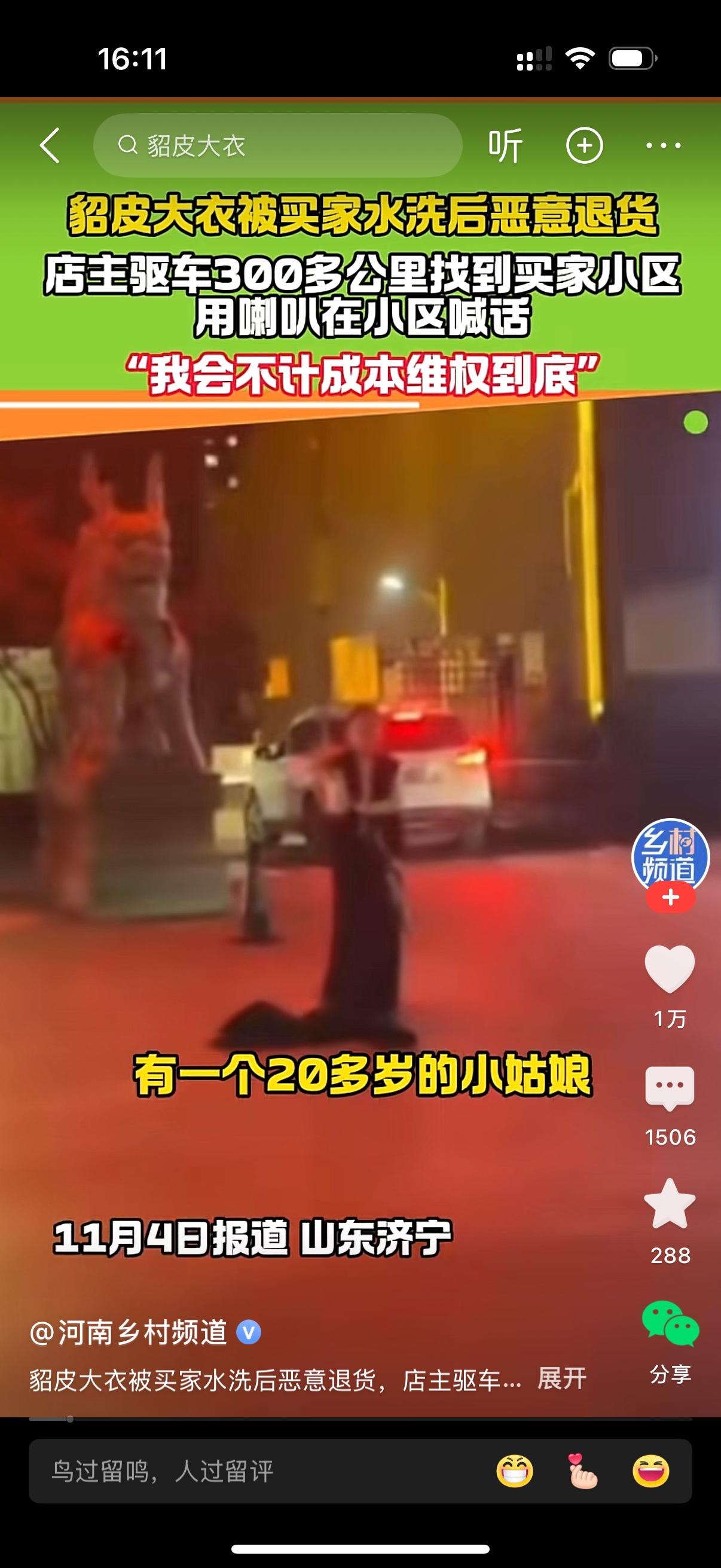 貂皮大衣被买家水洗后恶意退货。店主驱车300公里找到买家小区,并用喇叭在小区喊话,你们这里有一个20多岁的小姑娘,用洗衣机把衣服洗坏了,却说我发给她就这样的,恶意退款。店主持续喊话,那个女子也迟迟没有出现。她肯定没有想到店家这么彪悍,居然直接找上门来了。这样的女子确实不厚道,该曝光她。