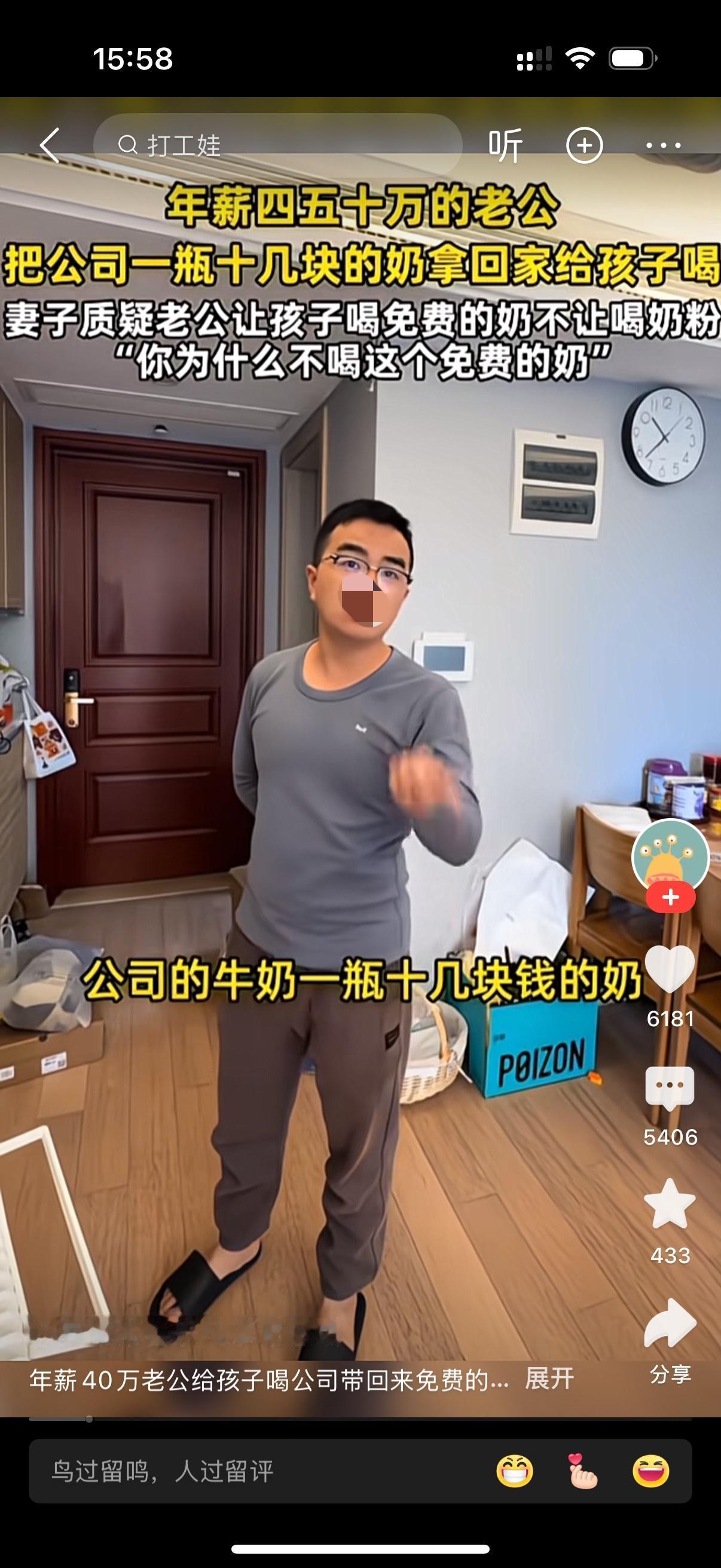 年薪四五十万的老公把公司十几块钱一瓶的奶带回去给孩子喝。妻子却质疑男人让孩子喝免费的奶不让喝奶粉。妻子问,你为什么不喝这个免费奶?男人解释这十多块钱一瓶的奶肯定是好奶,自己不喝就是为了带回来给孩子喝,这样省钱。妻子却固执的认为你都不喝的免费奶,为啥给孩子喝?哎,这样的女人还要做甚,好心当驴肝肺。年赚50万的男人还受这种窝囊气?
