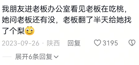 我朋友进老板办公室看见老板在吃桃,她问老板还有没,老板翻了半天给她找了个梨