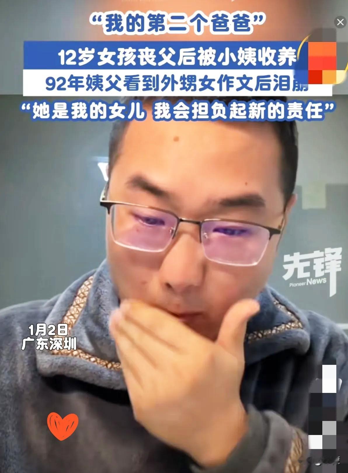 一句“第二爸爸”,暖透了这个冬天 泪目了!1月2日,广东深圳92年小伙危一冲上热搜,原因是他发布的一条视频里说,自己领养了12岁的外甥女佳佳,而女孩在作文里,把这位姨父称作了“第二爸爸”。 这条视频没什么华丽的剪辑,也没有煽情的文案,就只是危一拿着佳佳的作文本,笑着念出那句“第二爸爸”,镜头扫过女孩趴在桌边写作业的背影,暖得让人鼻头一酸。网友们的评论区直接集体破防,有人说“这才是亲情最好的样子”,有人感慨“善良真的会发光”,还有人想起了自己成长路上那些默默撑腰的亲人。 大家为啥会被这件事戳中?因为这几年听多了亲戚之间为了利益撕破脸的故事,看多了血缘关系也抵不过现实冷漠的例子。多少人嘴上说着“血浓于水”,真遇到事儿了却跑得比谁都快。佳佳的原生家庭遭遇变故,小小年纪就面临无依无靠的困境,这时候危一站出来,不是一时兴起的怜悯,而是实打实的责任担当。他给了佳佳一个家,让她不用再看别人的脸色,不用再害怕天黑之后的孤单。 最打动人的从来不是惊天动地的壮举,而是藏在细节里的温柔。危一说,佳佳刚来的时候很内向,不爱说话,吃饭都只敢夹自己面前的菜。他没有急着去改变孩子,只是每天放学接她回家,周末带她去逛公园,晚上陪着她写作业,遇到不会的题就耐心讲解。他从不说“我养你”这种沉重的话,却用日复一日的陪伴,让佳佳慢慢敞开心扉。作文里那句“第二爸爸”,哪里是简单的称呼,分明是孩子从心底里认可的依赖和信任。 这事儿也让很多人反思,到底什么才是真正的亲情。有人觉得,亲戚之间就该明算账,不该多管闲事,免得给自己惹麻烦。这种想法听着现实,其实透着一股子凉薄。血缘是天生的缘分,但亲情从来不是靠血缘绑定的,是靠真心换真心的付出。危一和佳佳没有父女名分,却有着比很多亲生父女更深厚的感情。他用行动告诉我们,爱不是一种义务,是一种选择,选择对一个孩子负责,选择给她一份迟到的父爱。 还有人拿这件事和那些“精致的利己主义者”对比,显得格外讽刺。现在不少人活得太精明,做什么事都要先算一笔账,看看自己能得到什么好处。遇到需要伸手帮忙的人和事,第一反应不是同情,而是权衡利弊。他们怕麻烦,怕吃亏,怕自己的生活被打乱,却忘了人与人之间最珍贵的,就是那份不计回报的善意。危一领养佳佳,没有想过要得到什么,他只是不忍心看着孩子颠沛流离,这份纯粹的善良,才是最难得的品质。 更让人觉得温暖的是,佳佳没有因为原生家庭的变故变得自卑敏感,反而在危一的照顾下,长成了一个爱笑的女孩。她在作文里写,姨父会记得她爱吃的菜,会在她难过的时候讲笑话,会在她考不好的时候摸摸她的头说“下次加油”。这些细碎的瞬间,拼凑成了一个孩子最安稳的童年。原来,一个被爱包围的孩子,真的会闪闪发光。 这个世界从来都不缺锦上添花的热闹,缺的是雪中送炭的温暖。危一用一个拥抱,一份陪伴,给了佳佳一个完整的家;佳佳用一句“第二爸爸”,一份信任,回应了这份沉甸甸的爱。这双向奔赴的亲情,比任何热搜都更有意义。 各位读者你们怎么看?欢迎在评论区讨论。