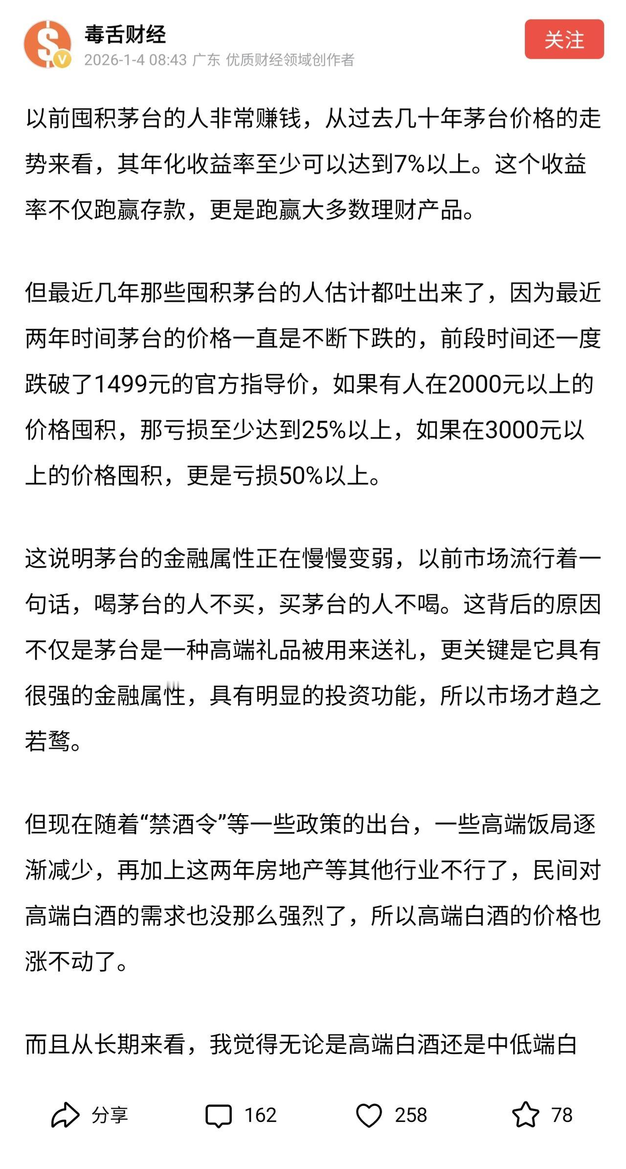 囤积茅台的黄牛们把几年赚的钱都吐出来,正如网友所说,出来混迟早是要还的。 前几年茅台价格场面多疯狂大家都知道,市场上飞天茅台一度炒到三千多元一瓶,囤茅台的散户黄牛赚的是盆满钵满。 可是恶果谁承担了,消费者承担了,我们知道酒无非是水和粮食组成,水的价格和粮食价格已经不用说了,茅台酒一瓶一千多元也认了,毕竟有的时候品牌溢价确实存在。但是酒的基础毕竟是水和粮食,他不是黄金,所以你把它当成黄金来囤货赚钱,那就要承担相应的风险。 要我说,不是幸灾乐祸,黄牛们应该赔钱,而且要多赔一些才会让市场回归正轨,茅台酒还是好酒,但它仅是酒,不是彩票。