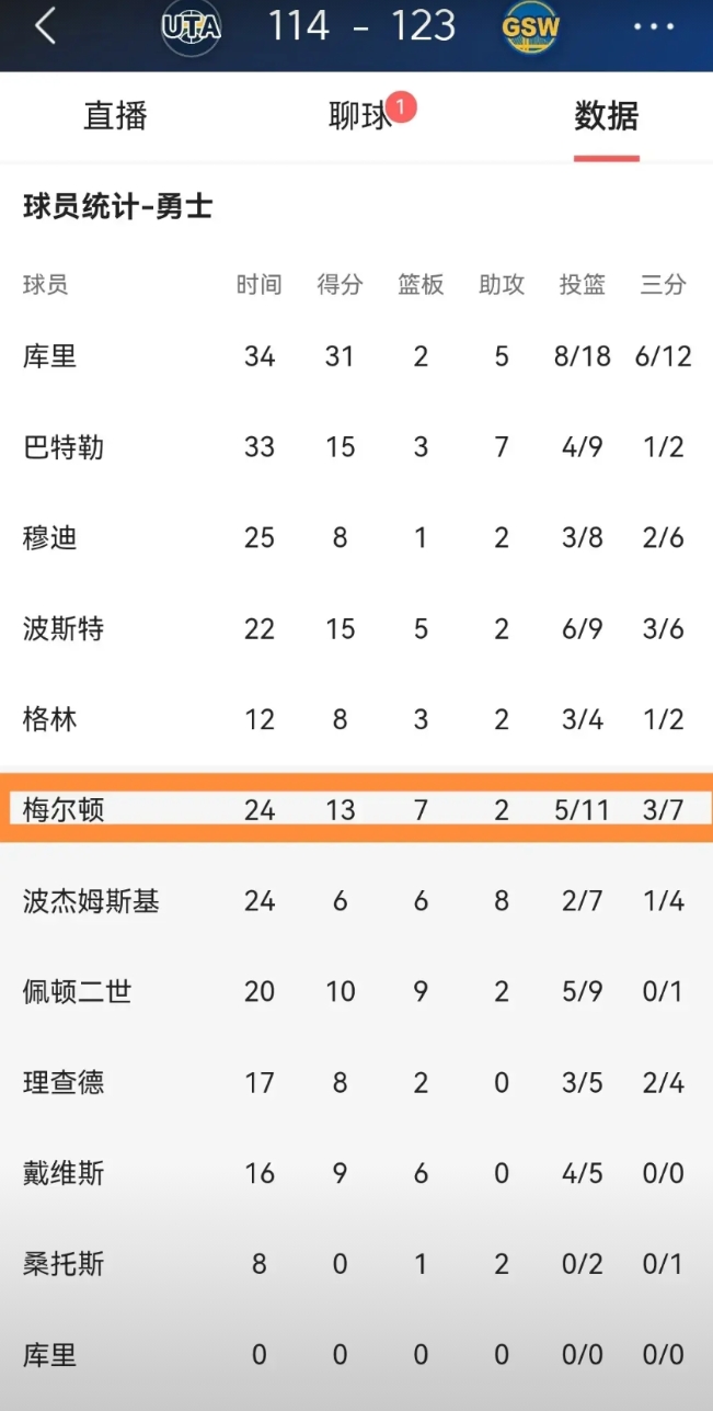我忍不住要怒赞勇士大将梅尔顿!在今天勇士主场以123:114战胜爵士的比赛中,梅尔顿在攻防两端都打出了无可争议的表现,全场比赛下来,梅尔顿替补出战24分钟,投篮11中5,其中三分球7中3得到13分7篮板2助攻2抢断。