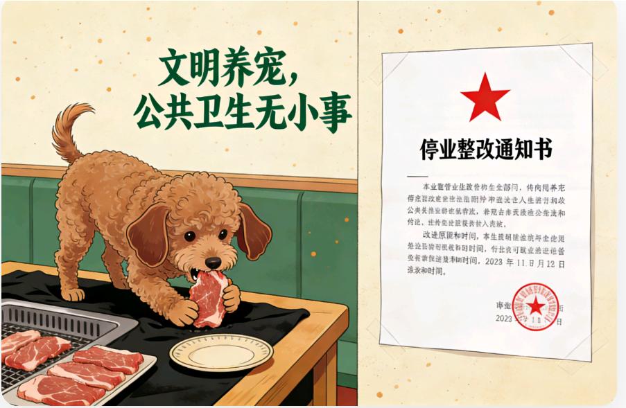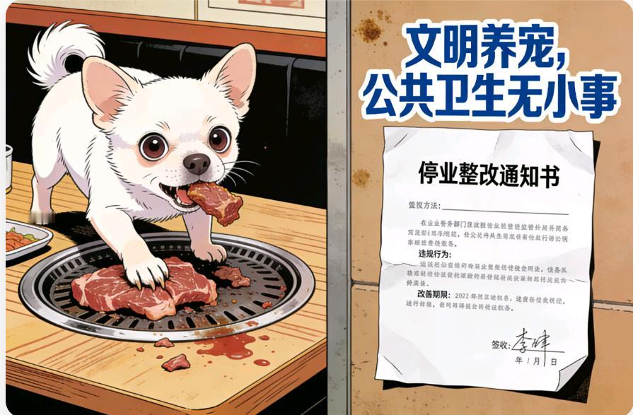 离谱!宠物狗上桌啃生肉 烤肉店竟停业三天😱 谁能想到,一只宠物狗的操作,直接让烤肉店喜提三天停业大礼包! 有顾客爆料,某烤肉店用餐时,撞见有人带狗进店,还把生肉直接放桌上给狗啃🐶。这波操作直接看呆邻桌,生肉是要给人吃的啊喂!卫生问题直接拉满警报! 后续市场监管部门火速出手,认定店家违反公共场所卫生管理规定,责令停业整改三天⏳。店家欲哭无泪,网友却吵翻:有人说狗主人没素质,有人怪店家监管不到位。 咱就是说,文明养宠真不是嘴上说说,公共场合守规矩,别让你的爱好,变成别人的噩梦,更别坑了无辜商家啊! (狗狗自助餐 带狗烤肉 宠物烤肉 狗上桌事件