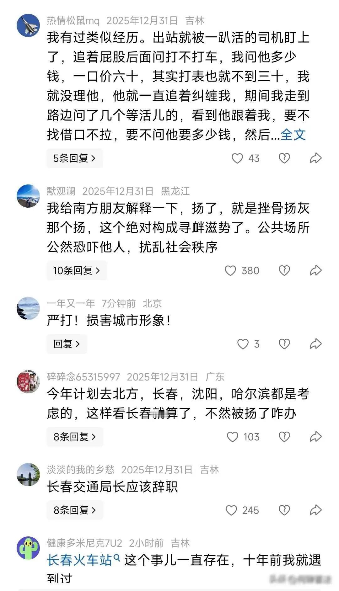 长春火车站,男子叫嚣“扬了你”,乘客却安全离开 那天晚上,长春火车站出站口的人挺多,有个叫张威的男子和一位女学生谈车费没谈妥,他当场就生气了,说谁要是拉她就收拾谁,还让那女生买烟给他,不过他没有动手拦人,女学生和朋友后来自己打车离开了,有人把这件事拍了下来,红星新闻发布了视频,交通执法队当天就把张威带走了,现在还在调查中。 这件事表面是吵架,实际上很严重,他在公开场合威胁别人,按照治安法规属于扰乱公共秩序,还涉及人身安全威胁,执法部门已经立案处理,不会简单了结,如果这个人没有出租车运营资格却在火车站拉客,那就构成非法营运行为,可能面临两万元罚款,要是他长期这样反复闹事,法律上可以按寻衅滋事追究责任,甚至进入刑事程序。 网上很多人提到“这事儿十年前就有”,说明它不是偶然发生的,火车站外面有人拉客、压价、吓唬人,早就形成了一条灰色产业链,大家说“长春丢脸”,但哈尔滨和沈阳这些地方也有类似情况,执法通常靠突击检查,没有系统监控,公安和城管也没有一起管,深圳那边用AI听声音、设置电子围栏加一键举报,八分钟就能响应,而长春还没听说有这种手段。 有人把这件事跟地域黑联系起来,说“东北人就这样”,其实不是这样,郑州东站和武汉站在去年也发生过类似的事,当时吵得很厉害,后来没人提了,这不是哪个地方的问题,是全国火车站普遍管理跟不上,大家一窝蜂骂长春,反而把制度上的漏洞给掩盖了。 我希望大家能记住12318这个电话,这是交通投诉电话,如果遇到此类事件,可以打这个电话处理,希望大家在新年不要遇到这种事,新的一年顺顺利利