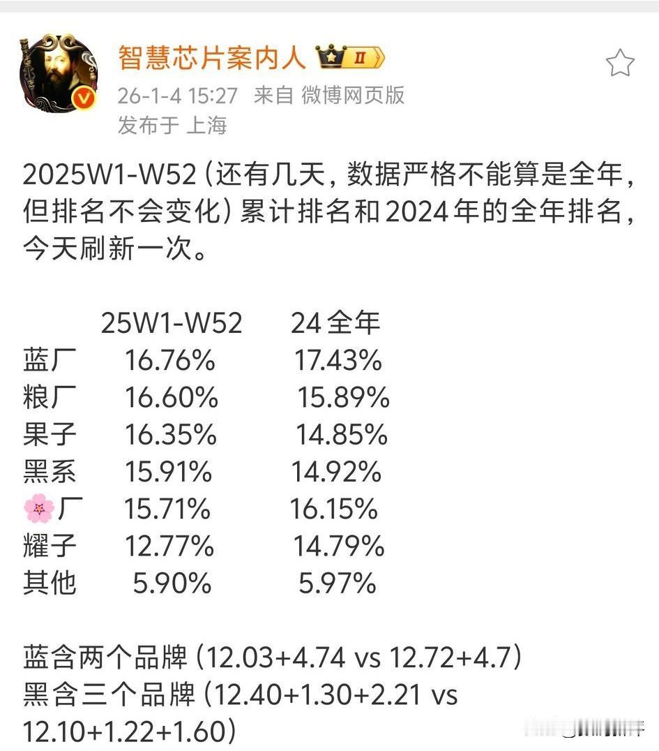 25年累计52周市场份额排名来了[灵光一闪]依旧是vivo、小米、苹果,全年前三名差不多就是这样了,vivo小优势领先小米拿下第一,iPhone在有国补支持下对比去年进步很大![笑哭]去年份额才14.85%,有国补情况下份额涨了不少,而且iPhone17系列表现也很强,OPPO算上真我的情况下排名第四,华为第五