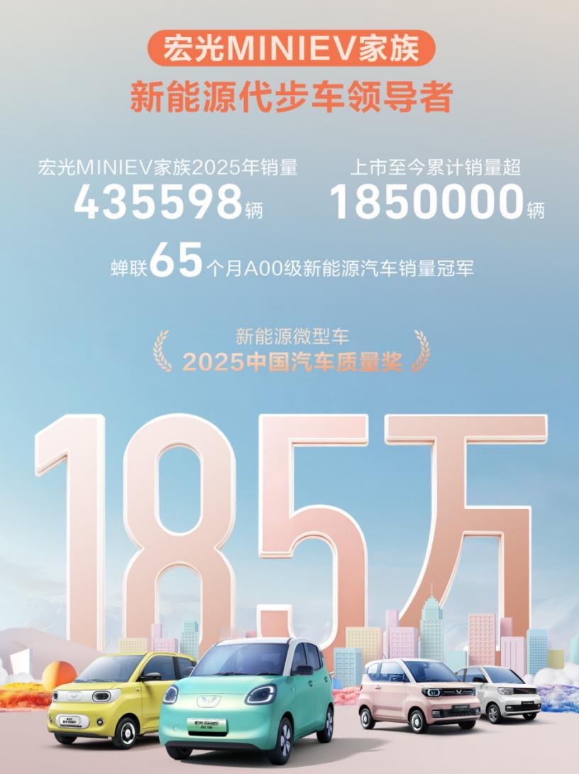 单年卖出435598台,宏光MINIEV又卖爆了。 最近,五菱可谓是好消息不断,一边是热门新能源购置税兜底,厂家补贴一半;一边是企业销量再创新高,宏光MINIEV也迎来好成绩,2025年全年销量超43万台,累计销量突破185万台,连续65个月蝉联A00级新能源汽车销量榜首,是全球微型新能源车累计销冠。 卖得好是得益于宏光MINIEV价格实惠,产品实力过硬。它是既有三门4座可选,也有更大空间的四门版可选,除了精致时尚的外观,也能让双排出入都便捷自由,让A00级的后座不再是儿童专属。同时,对于想要开代步车出游的用户,或者是拉上一大堆年货去走亲访友,宏光MINIEV既有301km长续航+标配快充来解决里程焦虑问题,也有745L后备厢最大容积让年货、大件都能轻松装下。 不仅如此,宏光MINIEV甚至连双液晶屏、倒车影像、Autohold+ESC电子车身稳定系统等等都准备好了,笼式车身的高强钢占比也高达67%,A00级有的它都有、A00级没有的它也有,这样的综合产品傍身,再看看开头我提到的优惠权益,宏光MINIEV真可以下手了。