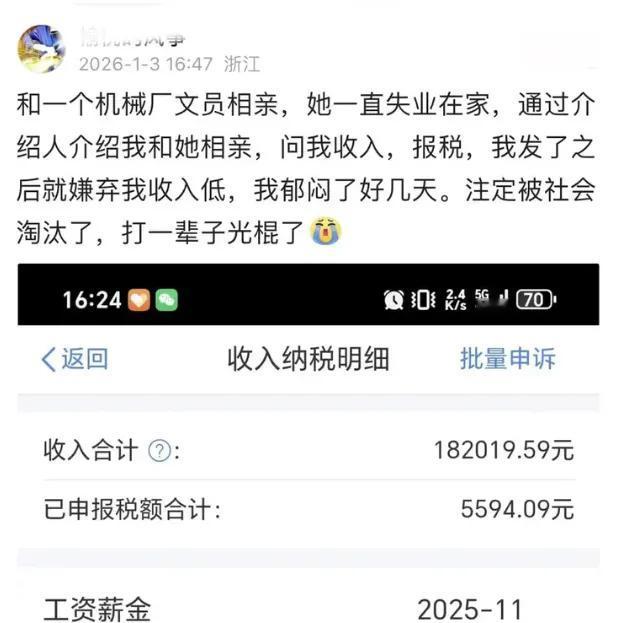 我月入1.65万,相亲时被一个失业姑娘怼收入太低!浙江小伙的吐槽帖最近刷屏了,评论区直接炸锅!有人笑他凡尔赛,更多人却沉默了。这哪是嫌弃他穷?分明是现实太贵! 仔细算笔账,这收入在全国能跑赢90%的打工人,但在浙江,一套房动辄三四百万,孩子托班每月五六千,年入18万可能刚够生存,却扛不起一个家。更讽刺的是,婚恋市场早已变成资产审核现场。有人要求男方年薪20万+80万彩礼,甚至体制内普通员工也被嫌“赚得少”…… 但真相是月薪1万的三期士官,隐形福利远超1.3万的厂妹。月入3万的女性,也可能因你的钱是咱的,我的钱还是我的这种观念被拒。婚恋若只剩工资条比拼,再高的收入也填不满安全感黑洞。 或许正如网友所说,衡量一个人,不该只有收入这把尺子。他依法纳税,努力工作的担当,比账面数字更值得被看见。毕竟婚姻是两个人并肩作战,而不是一个人单扛风雨。