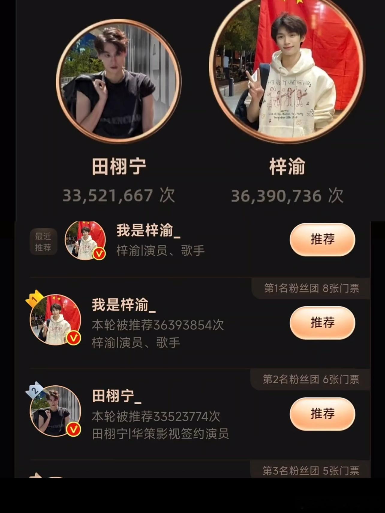 微博之夜年度推荐,梓渝的实力领跑真的太亮眼!初选断层登顶,进阶赛稳坐榜首,终选阶段依旧牢牢霸占第一宝座,全程断层领跑一路高歌,这份滚烫的人气与实力,当之无愧🔥!第一的荣耀,梓渝值得所有偏爱与荣光!