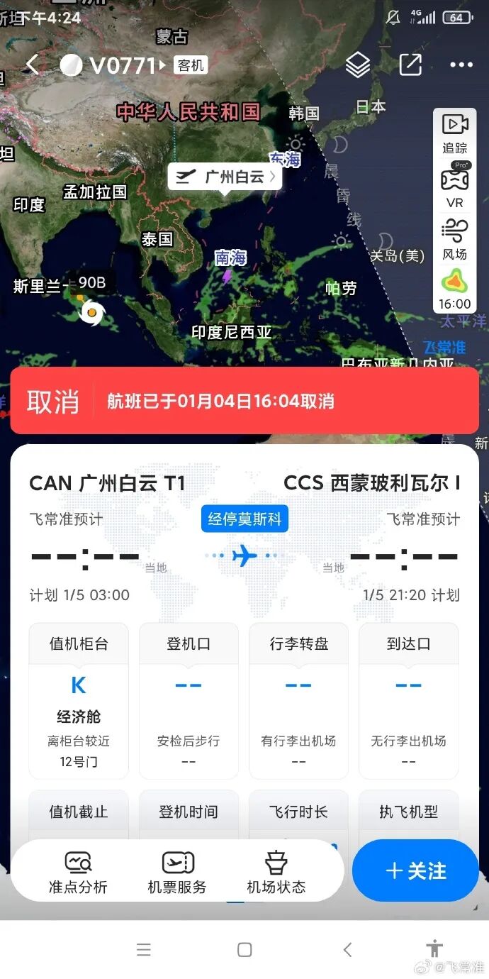 航班管家APP显示,广州往返加拉加斯的航线需经停莫斯科,全程约30个小时。1月5日起飞的V0771次航班为最新的一班,下次起飞将是1月19日。