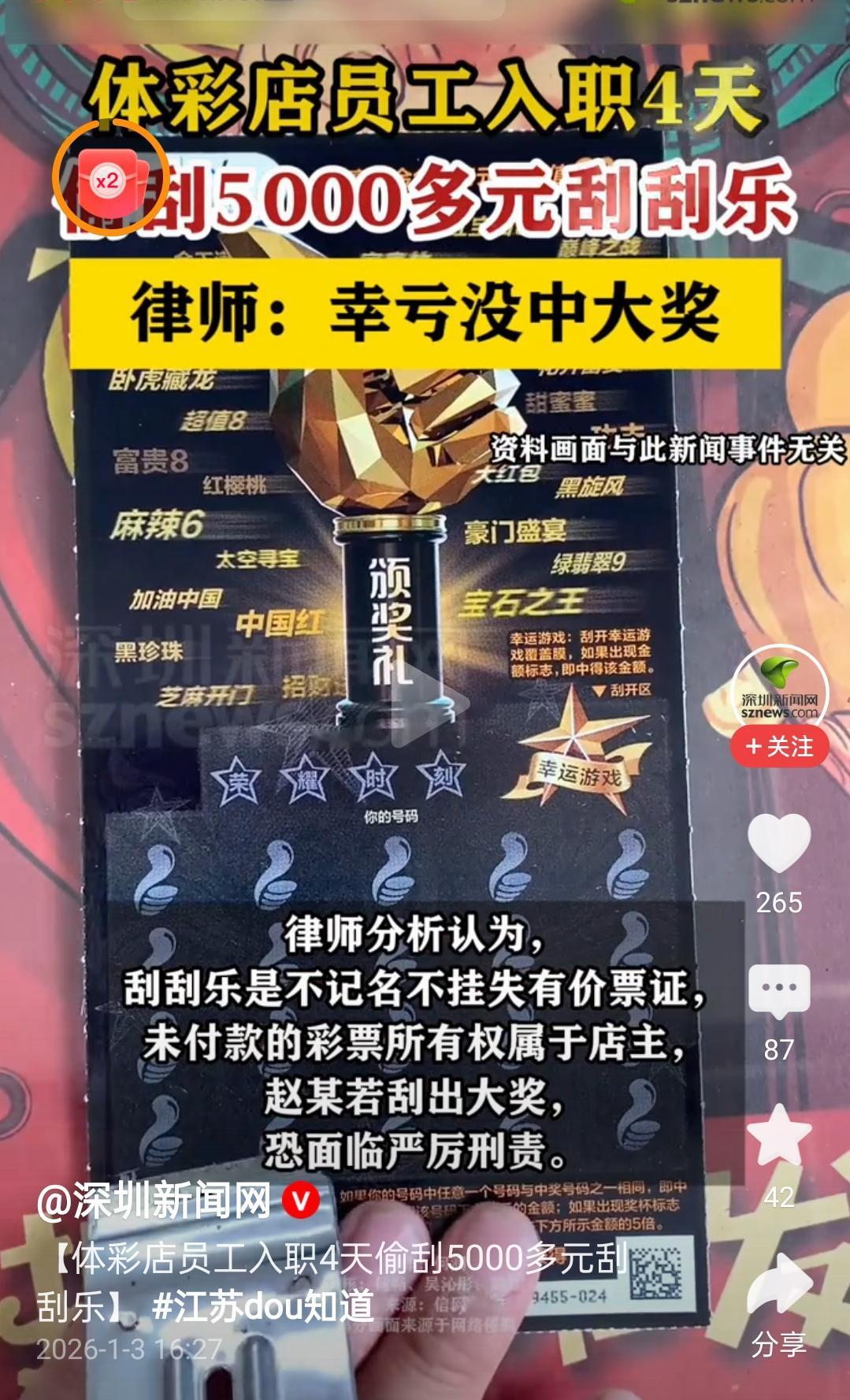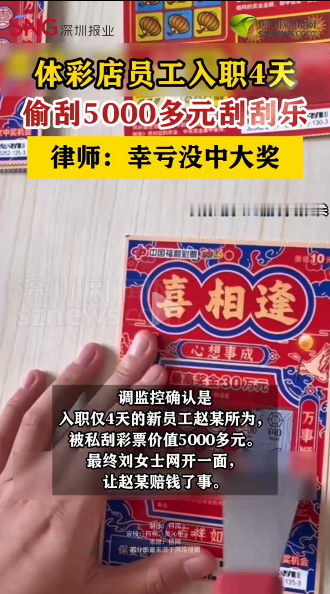 江苏淮安的体育彩票店老板刘女士发现,店内多款刮刮乐彩票有被刮过的痕迹。调取监控后最终确定,这些彩票被入职仅4天的新员工赵某私开,价值5000多元。发现此事后,她最终网开一面,让对方赔钱了事。律师分析认为,赵某应该庆幸未刮出大奖,否则可能面临严厉刑责。 这起发生在江苏淮安的事件,涉及到体育彩票店的员工赵某因私自刮彩票而引发的纠纷,确实令人深思。在短短的四天内,赵某便因贪念行动,导致了5000多元的损失,所幸刘女士选择了网开一面,给了他一个改正的机会。 刘女士作为体育彩票店的老板,在发现多款刮刮乐彩票有被刮过的痕迹后,并没有急于采取严厉的处罚措施,而是首先审核了监控情况,最终确认是新入职员工赵某私自开刮彩票。她的冷静处理方式体现了她的理智与果断,面对损失的同时,她也展现出了对于员工的宽容和善意。 从法律的角度来看,赵某虽然在短时间内的行为造成了显著的经济损失,但若未刮出大奖,他可以说是逃过了一劫。一旦刮出大奖,情节将会变得更加复杂,可能面临严厉的刑罚。对此,律师的分析让我们再一次认识到,贪欲的背后往往隐藏着不可预知的后果。对于赵某而言,这次事件无疑是一个惨痛的教训,不仅是经济上的损失,更是对职场诚信的深刻反思。 刘女士的宽容处理,也让我们看到了在商界中人性的一面。在面对错误时,给予了对方一个改正和成长的机会。她的做法反映了自己的大度,同时也让赵某意识到了自己的错误,承认并愿意赔偿损失,展现出一定的责任感。 这个故事让人想起了职场中的诚信与道德的重要性。无论是老板还是员工,在工作中都应保持对行业和他人的尊重,尤其是在涉及公共财富时,更要谨慎行事。希望赵某能从此次事件中吸取教训,未来能以更积极的态度投入工作,珍惜岗位带来的机会。 最后,也希望所有人在职场中都能意识到,诚信与责任心不仅是个人发展的基石,也是整个社会和谐的基础。正如刘女士的做法那样,宽容与理解并不代表纵容,而是在激励他人改正的同时,共同传递出正能量。对此您有什么想要说的么吗?欢迎评论区一起讨论!彩票店的员工私自刮彩票5000多 老板发现店内大量彩票有被人刮开