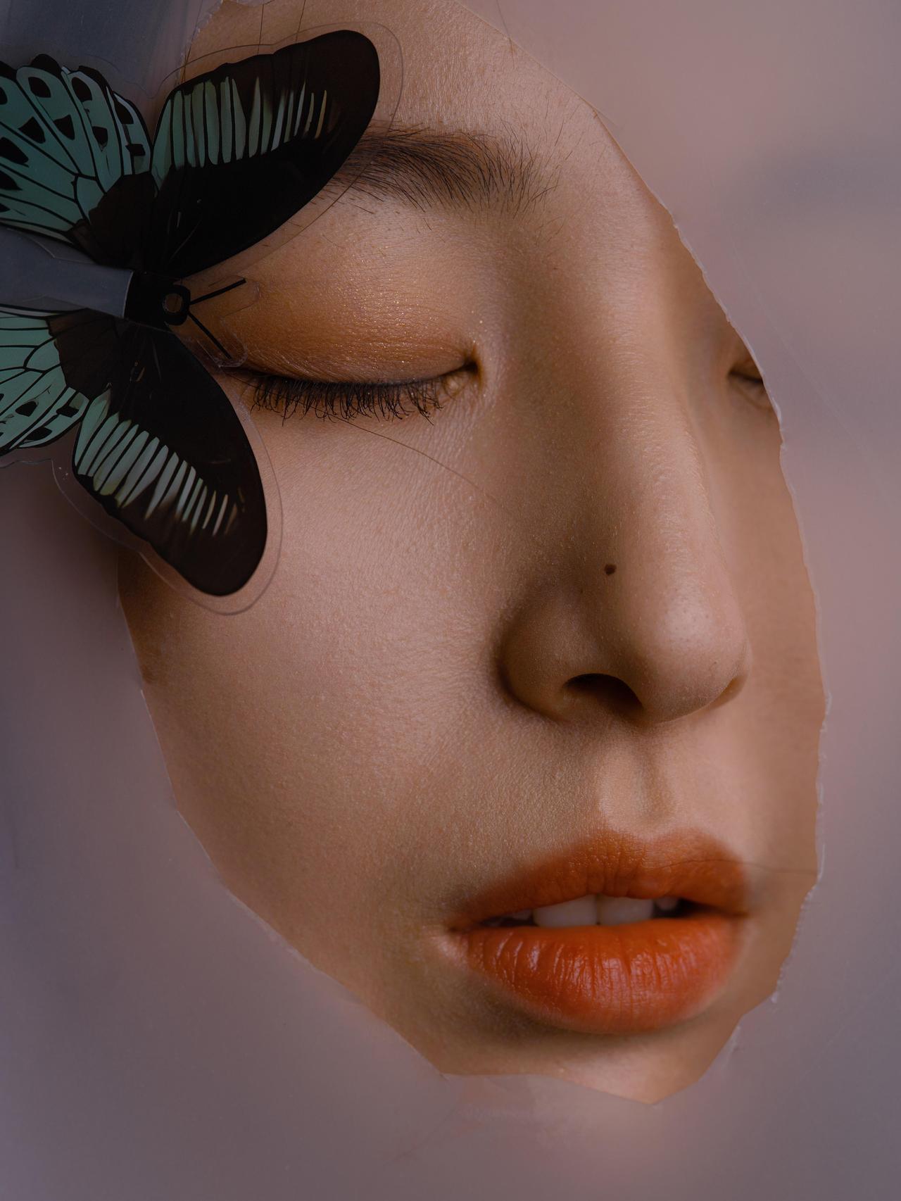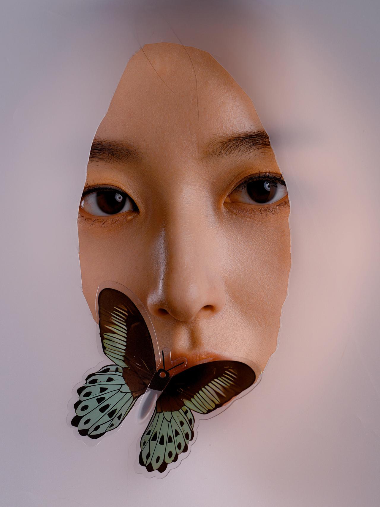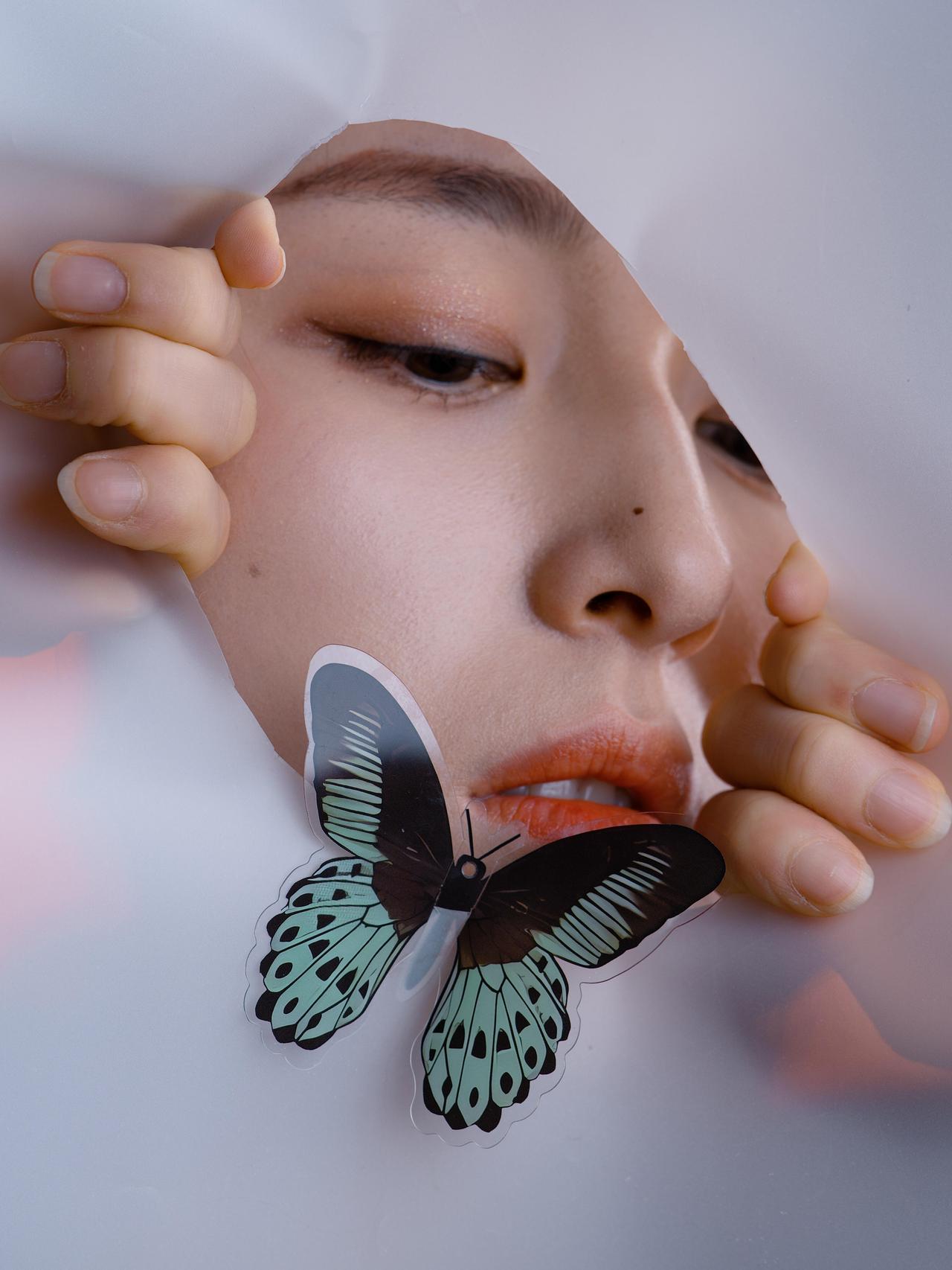 这组作品在创作手法上有明显的创新,将纸张作为创作介质融入人像拍摄,打破了传统人像摄影中背景与主体的分离状态,让背景成为叙事的一部分。蝴蝶道具与纸张、人物的结合,构建出超现实的视觉效果,贴合“梦魇”的虚幻主题。拍摄视角上采用平视与微仰的结合,既让人物的面部表情更具表现力,又避免了视角单一带来的视觉疲劳。但创作手法也存在一定局限,纸张的撕裂形式较为单一,多为直线型的撕裂,若能尝试不规则的、更具破碎感的撕裂方式,会让“梦魇”的破碎感更强烈;同时,蝴蝶的摆放位置虽有变化,但整体形式仍偏保守,若结合人物的面部动作做出更具动态的摆放,作品的创意性会进一步提升。