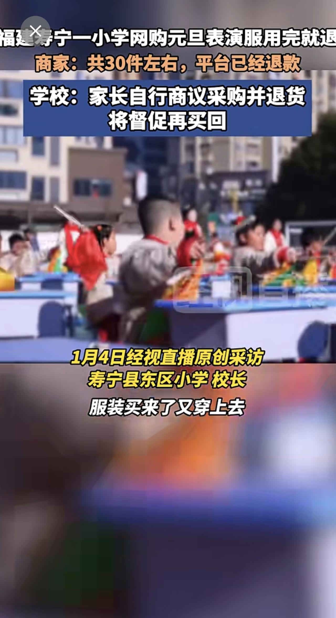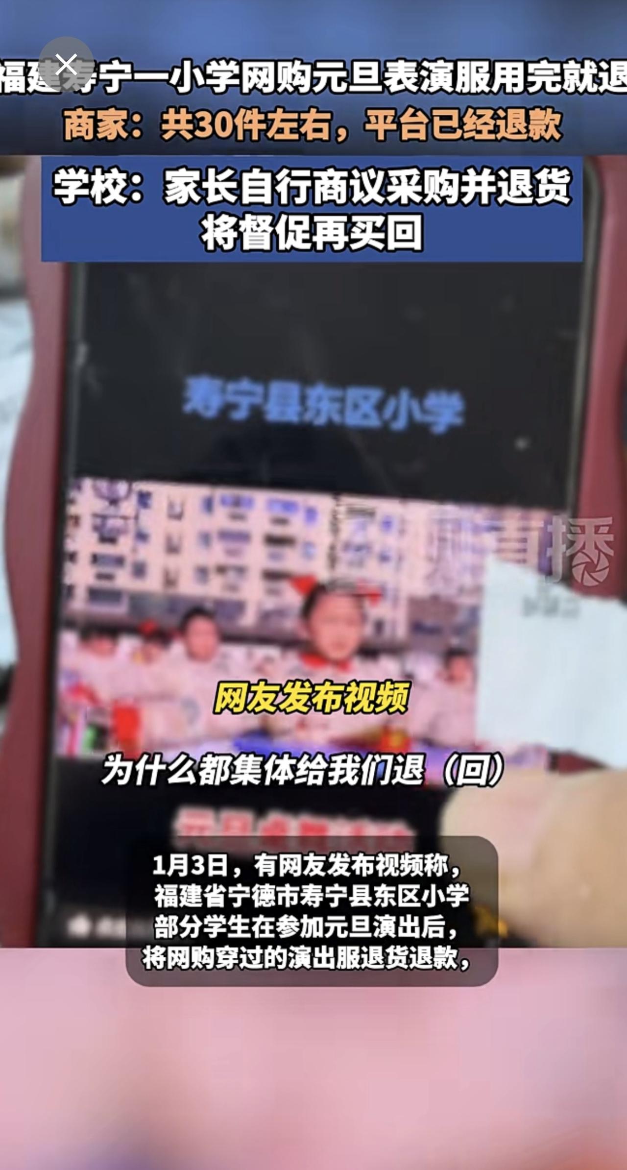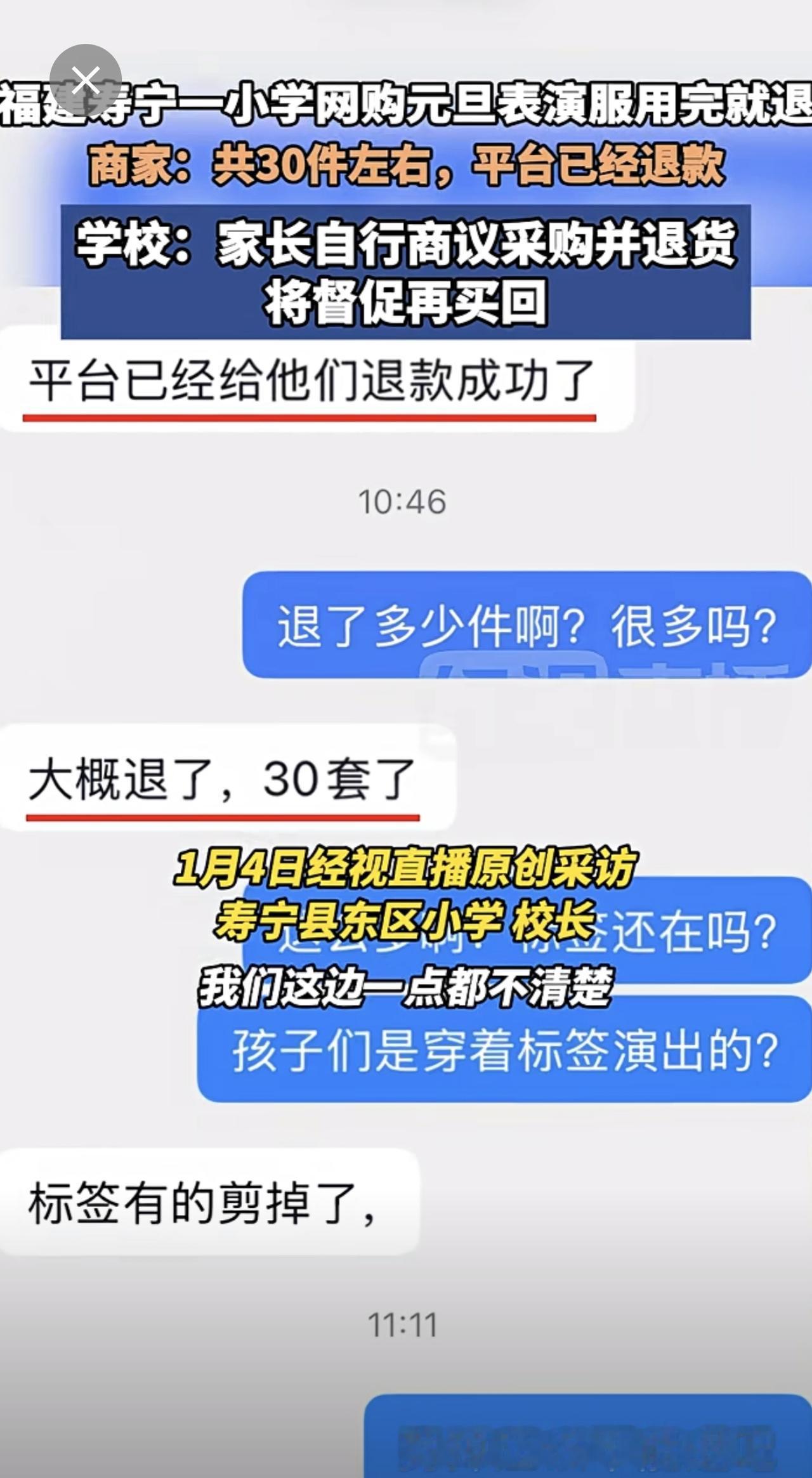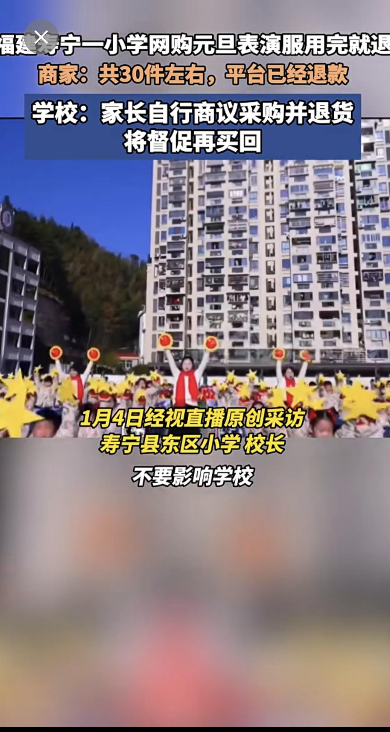 福建寿宁一小学网购元旦表演服用完就退。商家:共30件左右,平台已经退款。学校:家长自行商议采购并退货,将督促再买回。