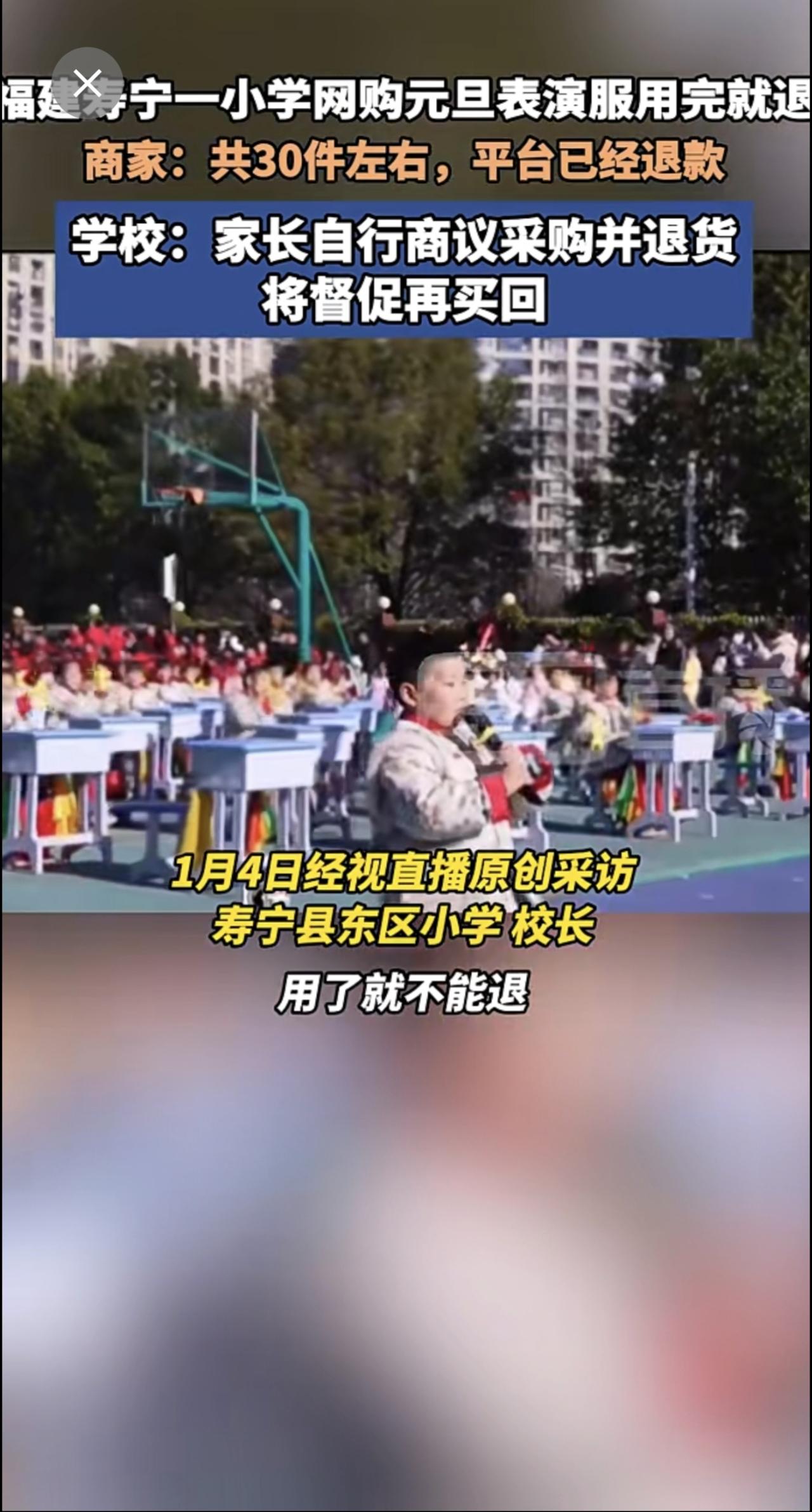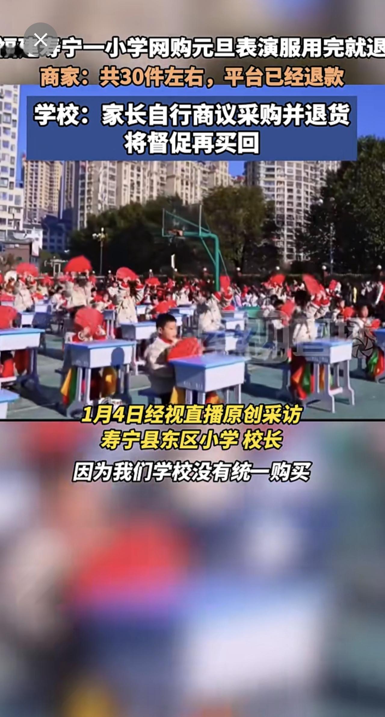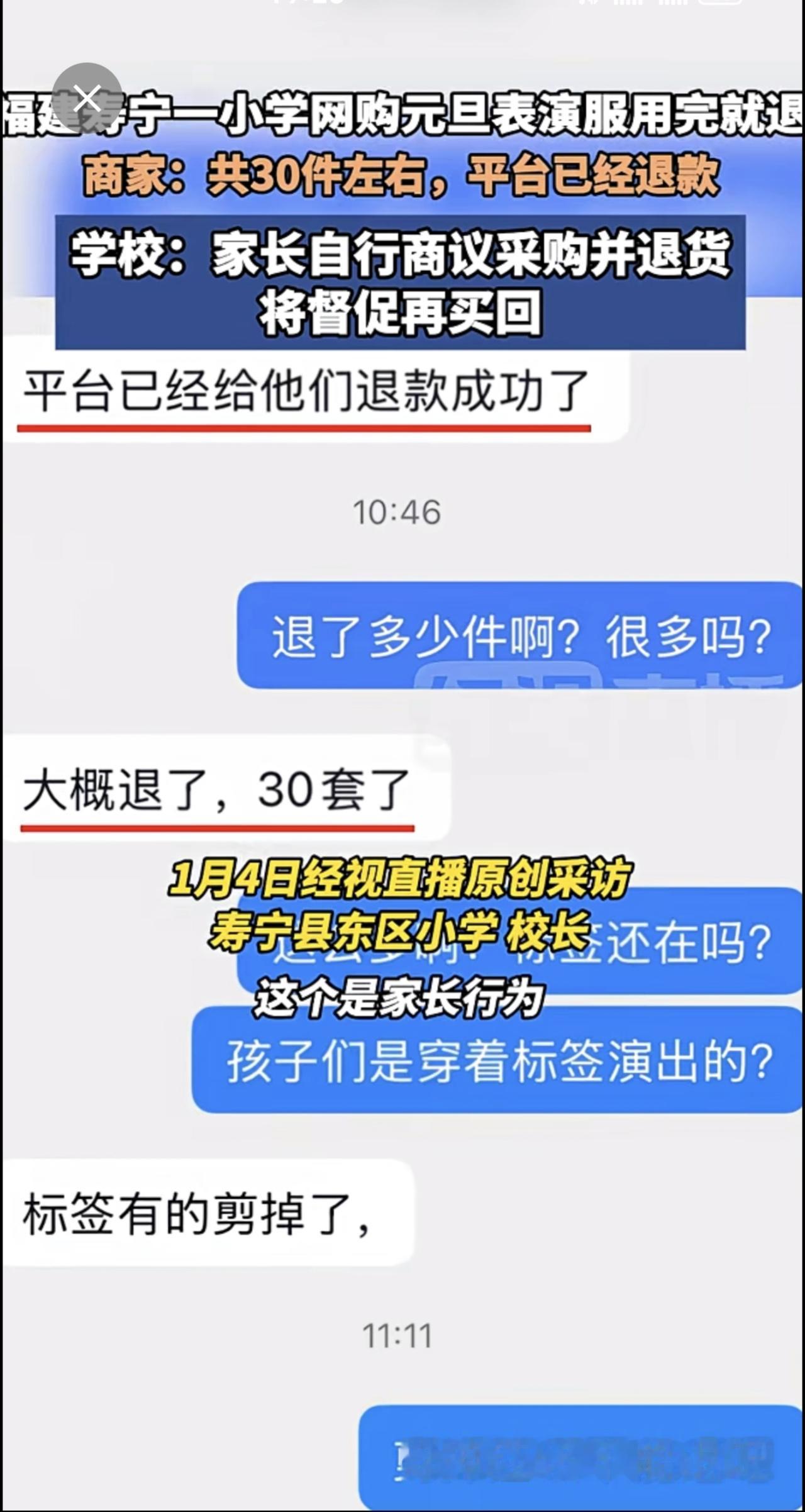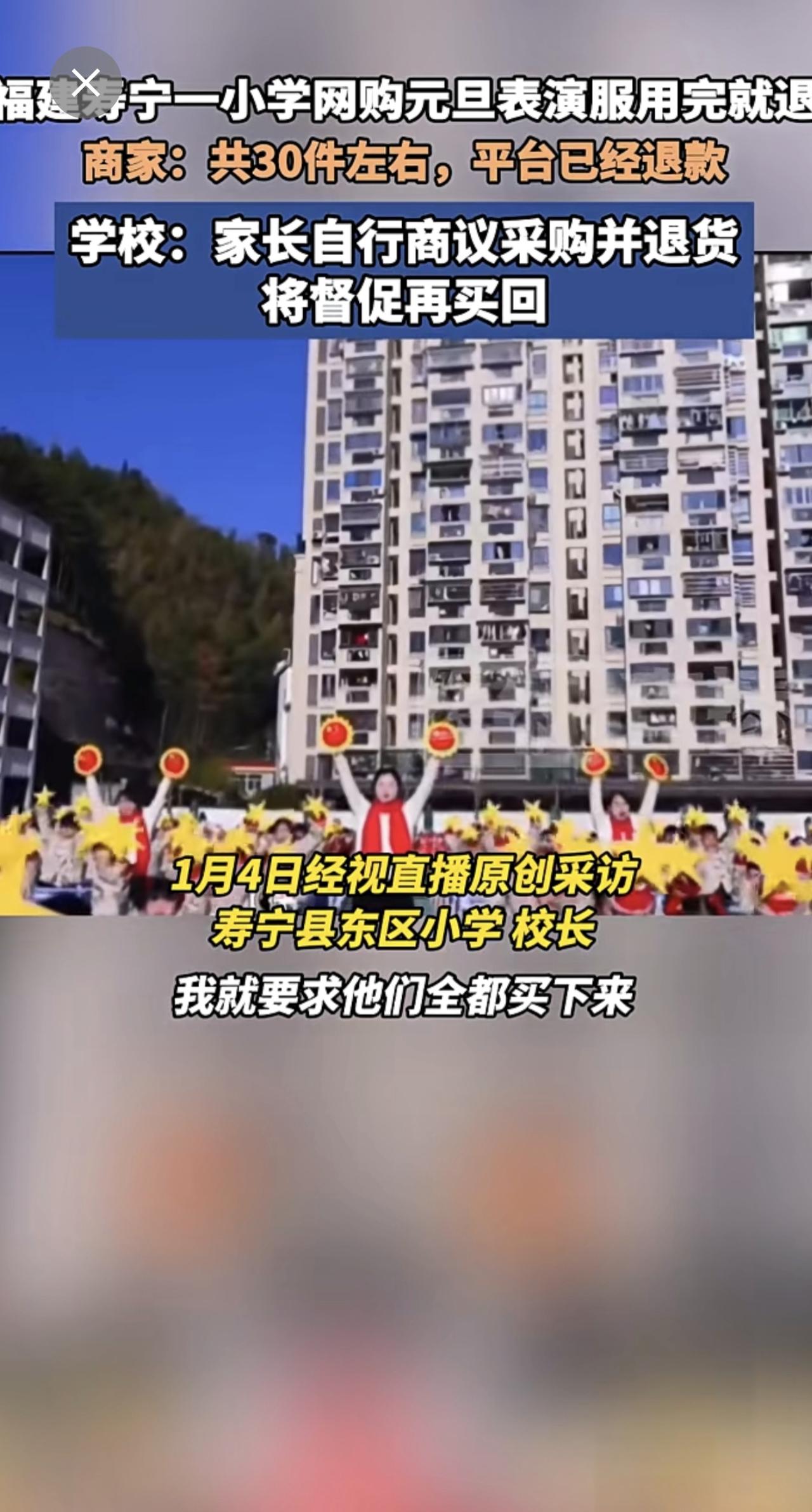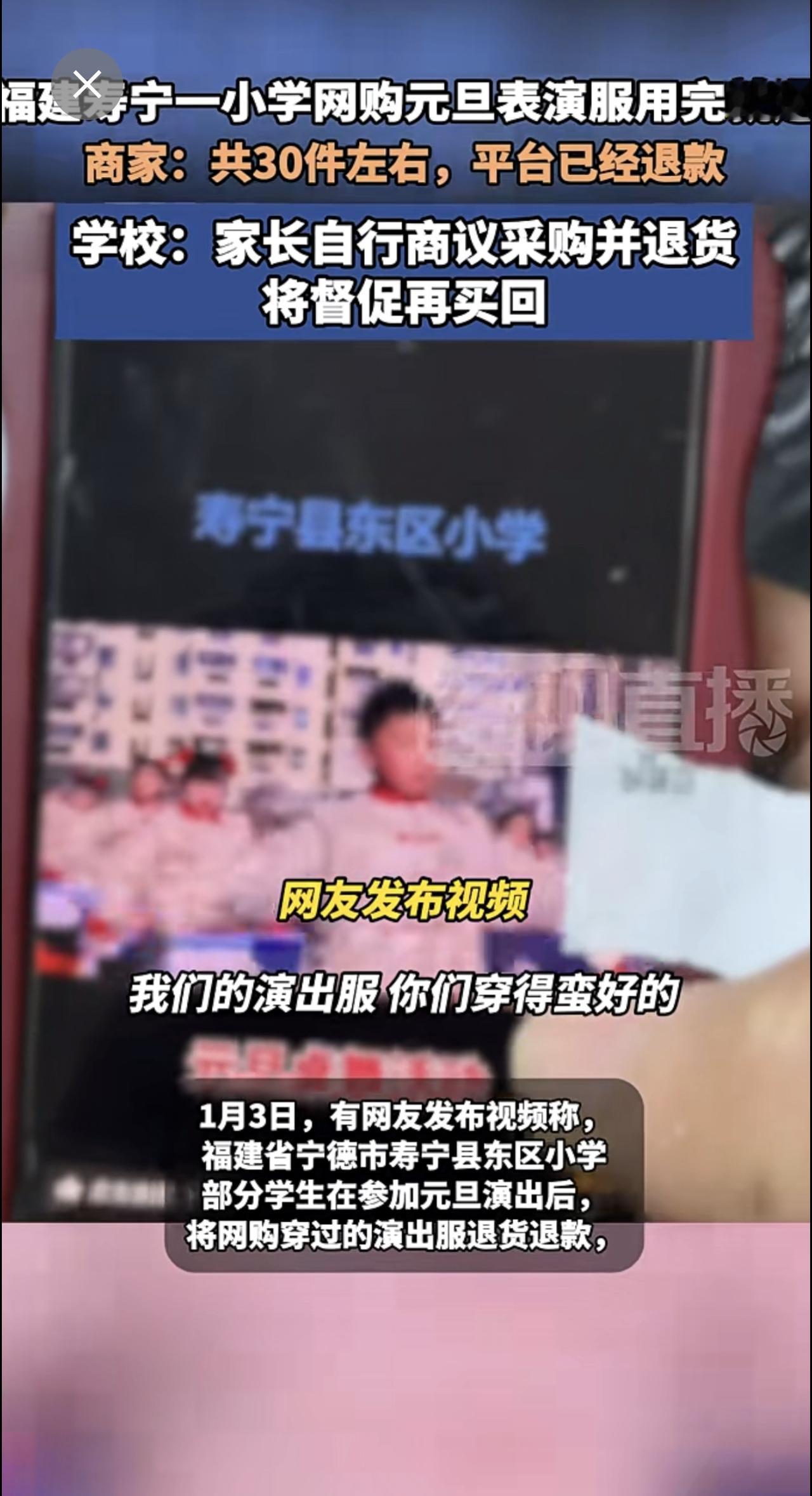 福建寿宁一小学网购元旦表演服用完就退。商家:共30件左右,平台已经退款。学校:家长自行商议采购并退货,将督促再买回。