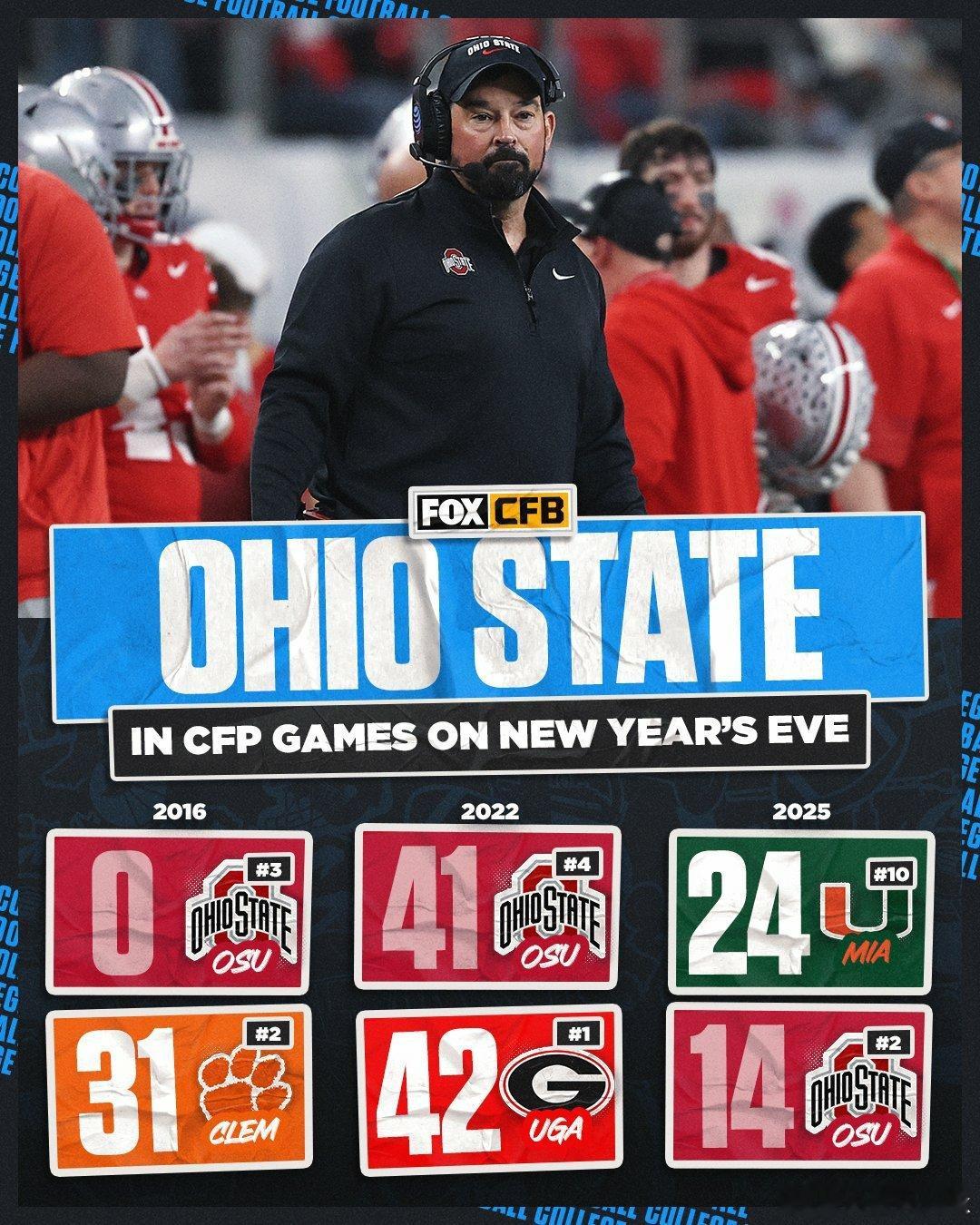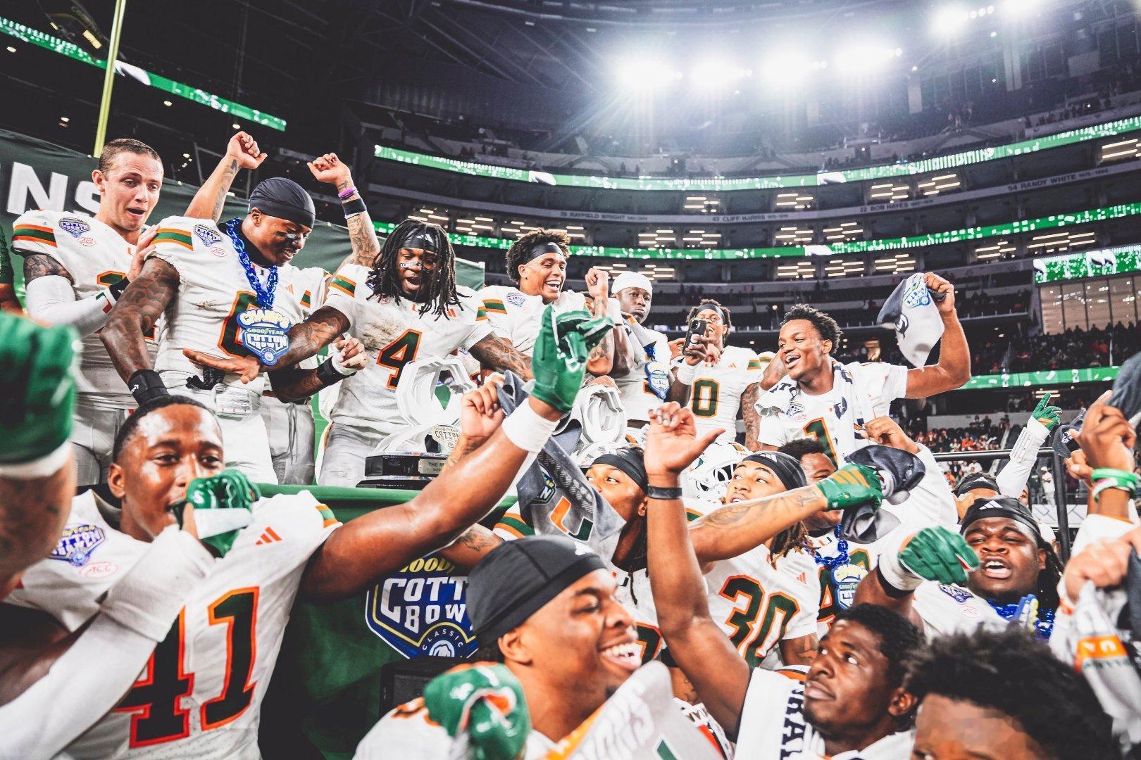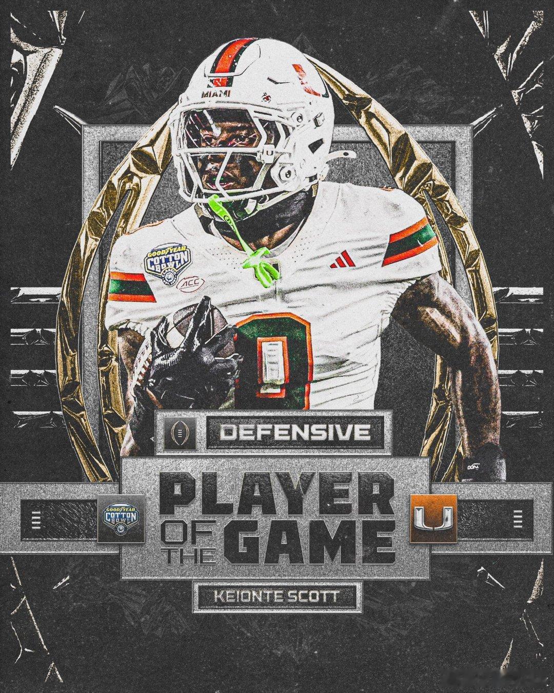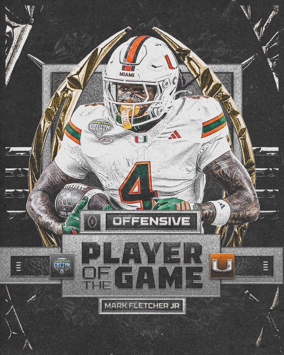 2025-2026赛季大学橄榄球季后赛Cotton Bowl棉花碗,迈阿密大学击败俄亥俄州立。飓风队四分卫Carson Beck26传19中,138码1达阵。跑卫Mark Fletcher Jr荣获进攻MVP,19次跑球90码,2次接球25码1达阵。跑卫CharMar Brown5次跑球26码1达阵。Kelonte Scott荣获防守MVP。Buckeyes队四分卫Julian Sayin35传22中,287码1达阵2次被抄截。跑卫Bo Jackson11次跑球55码1达阵。外接手Jeremiah Smith7次接球,157码1达阵。