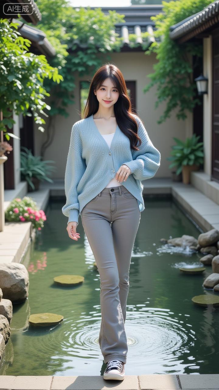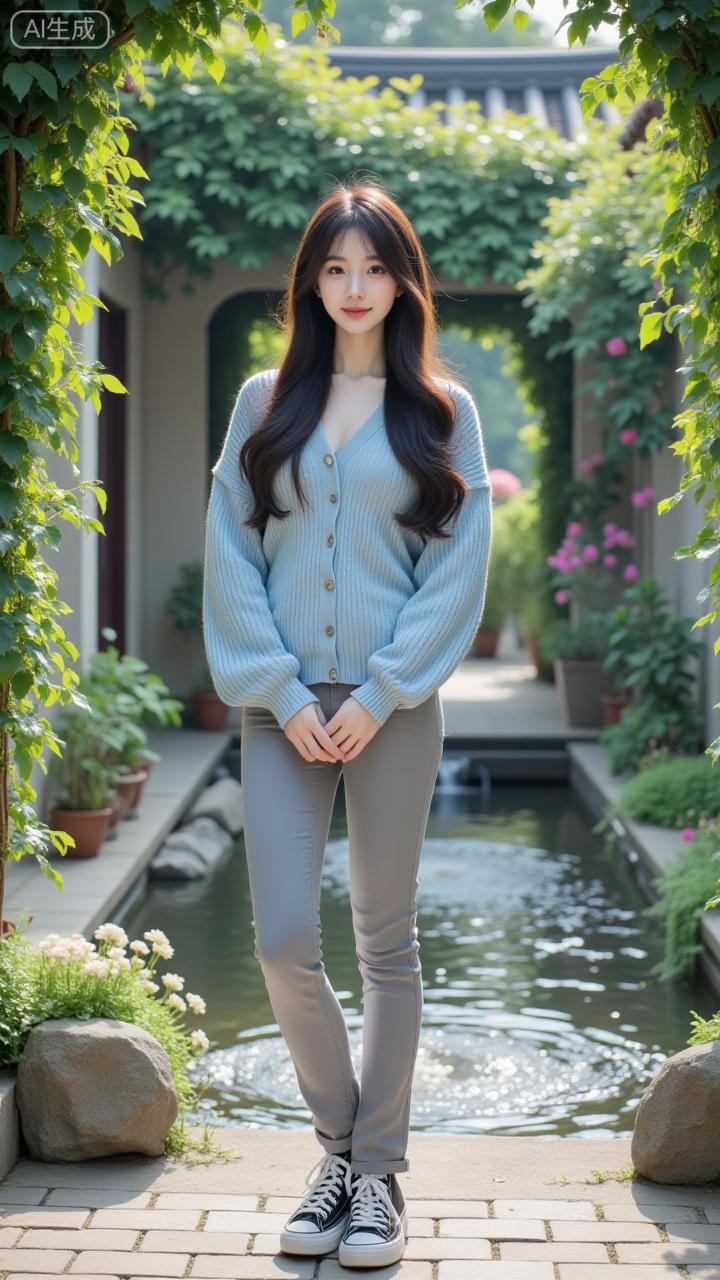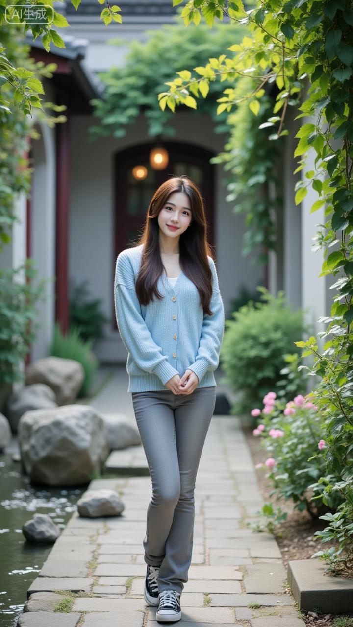 庭院里的清新松弛感穿搭 浅蓝开衫配灰调微喇裤,清爽又衬气质,庭院花影里的松弛感直接拉满~日常这么搭,舒服又耐看!浅蓝减龄穿搭
