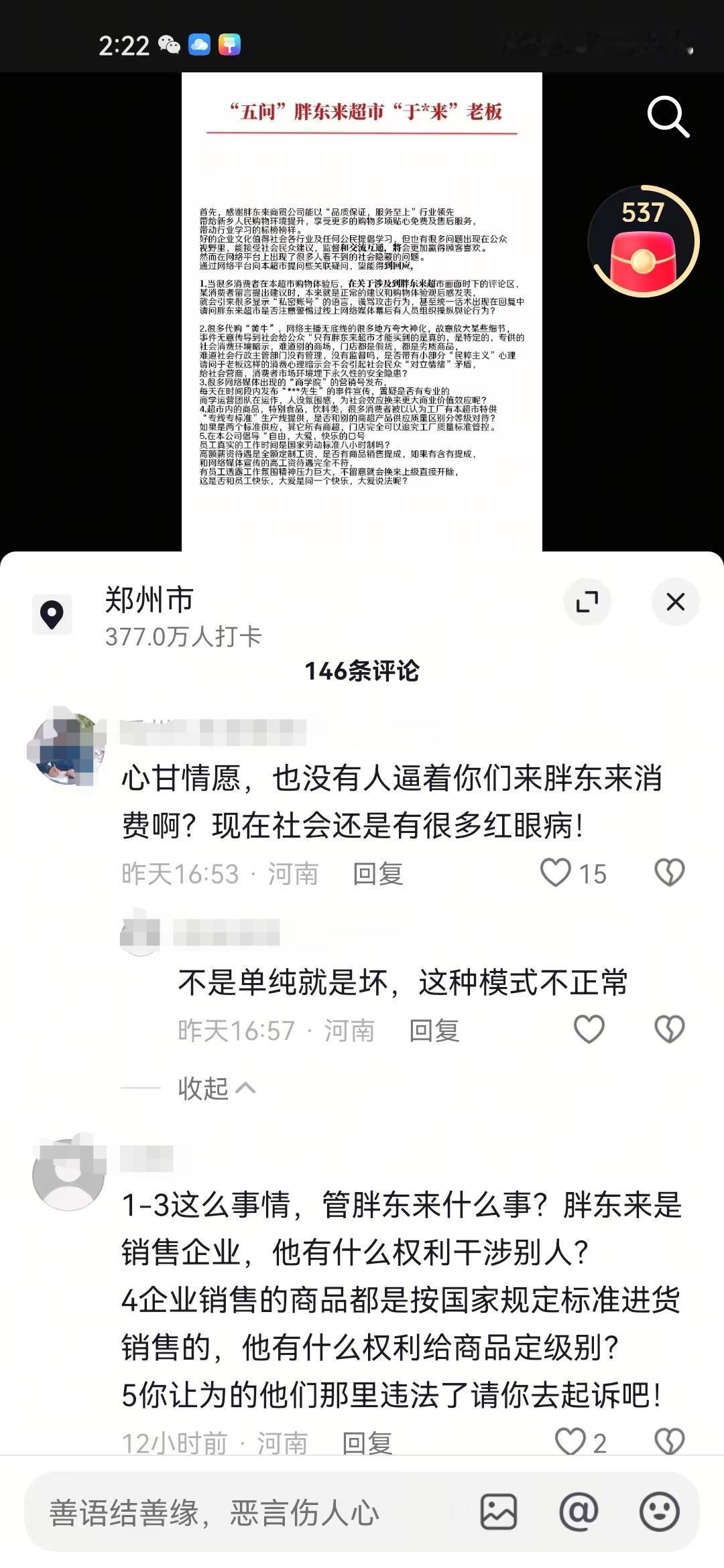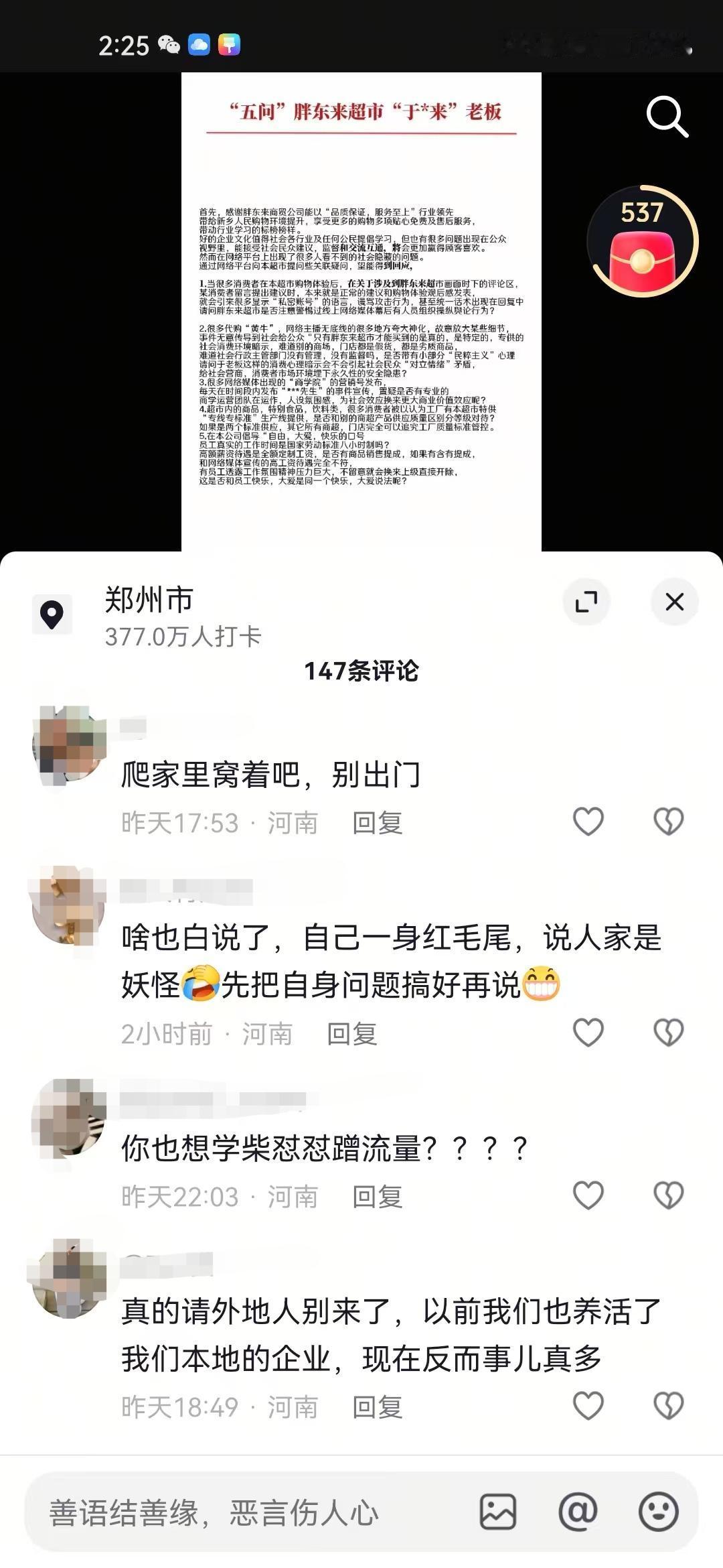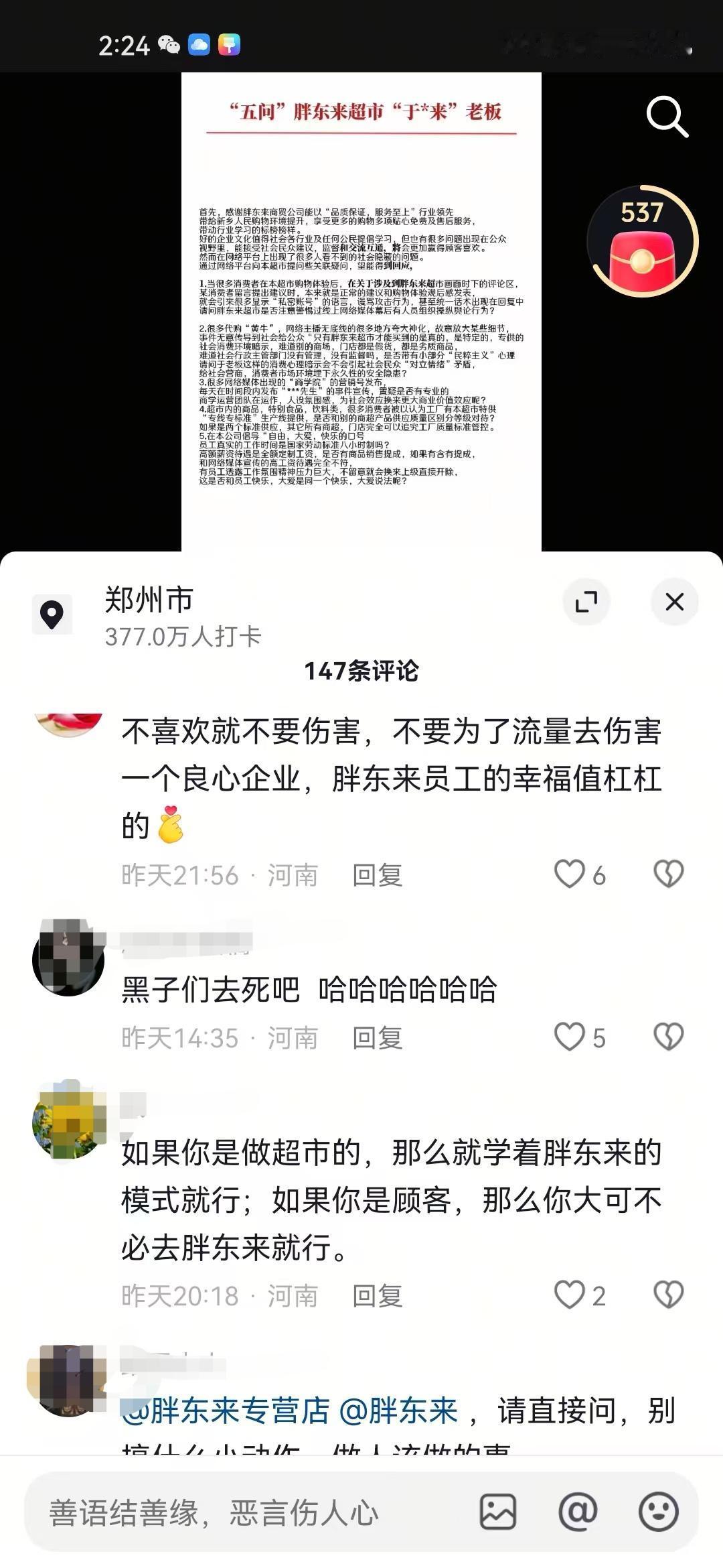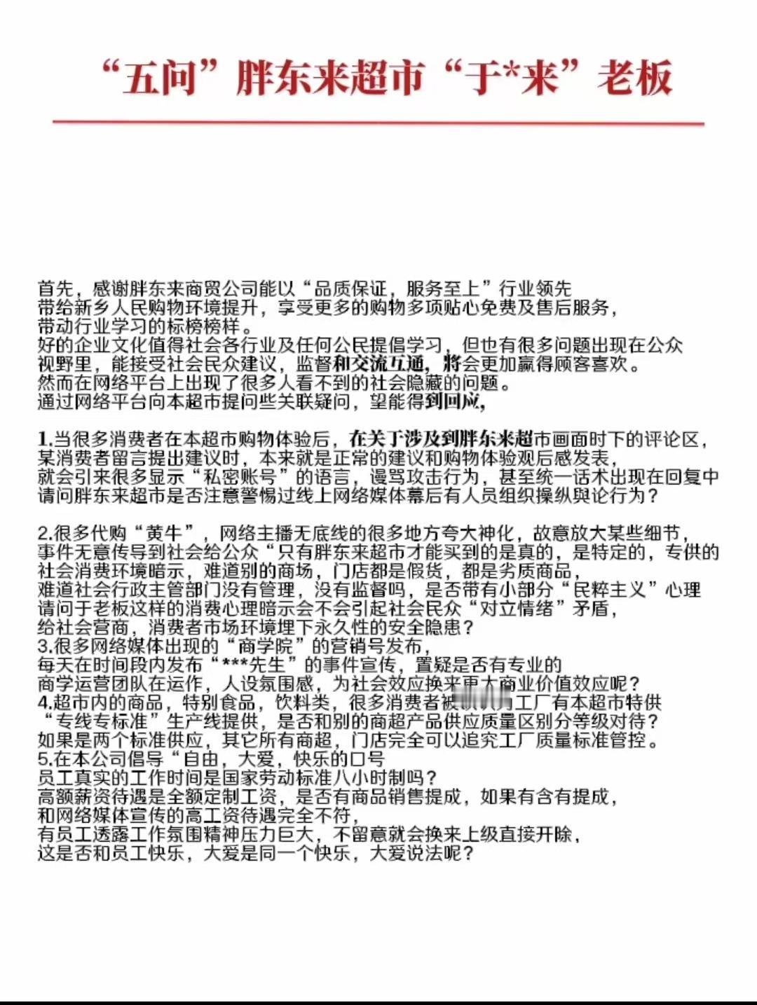 有网友在网上给胖东来提出五条疑问,说实话这五条疑问并没有太大不妥,也是不少网友的疑问,然而胖东来粉丝就不乐意了,直接将这个网友打成“黑子”“柴怼怼”之类标签的。 在网上看到有不少这位网友五条疑问中的事情,有不少网友就是单纯的把自己在胖东来买到的,出问题的商品发到了网上,结果被一堆当地IP的人说是“黑子”,什么“柴怼怼”“内裤姐”评论都来了。 还有不少代购和研学,每天发的视频基本上都是夸大宣传,什么胖东来的豆芽不用洗,怕自来水把豆芽洗脏了,什么胖东来韭菜都是自己买地荒废6年时间种的,诸如此类的。 另外说胖东来的商品都是开专线生产的评论也很常见,胖东来自营果汁单独开专线,胖东来自营油单独开专线,还有的说胖东来非自营的也会单独开专线。 个人认为这位网友提出的5条疑问并没有什么问题,网上对于胖东来视频底下的评论很常见,当地IP的人在网上也是极力维护胖东来,容不得半点不好的评论,就连这个网友的视频底下,也都是这种评论。
