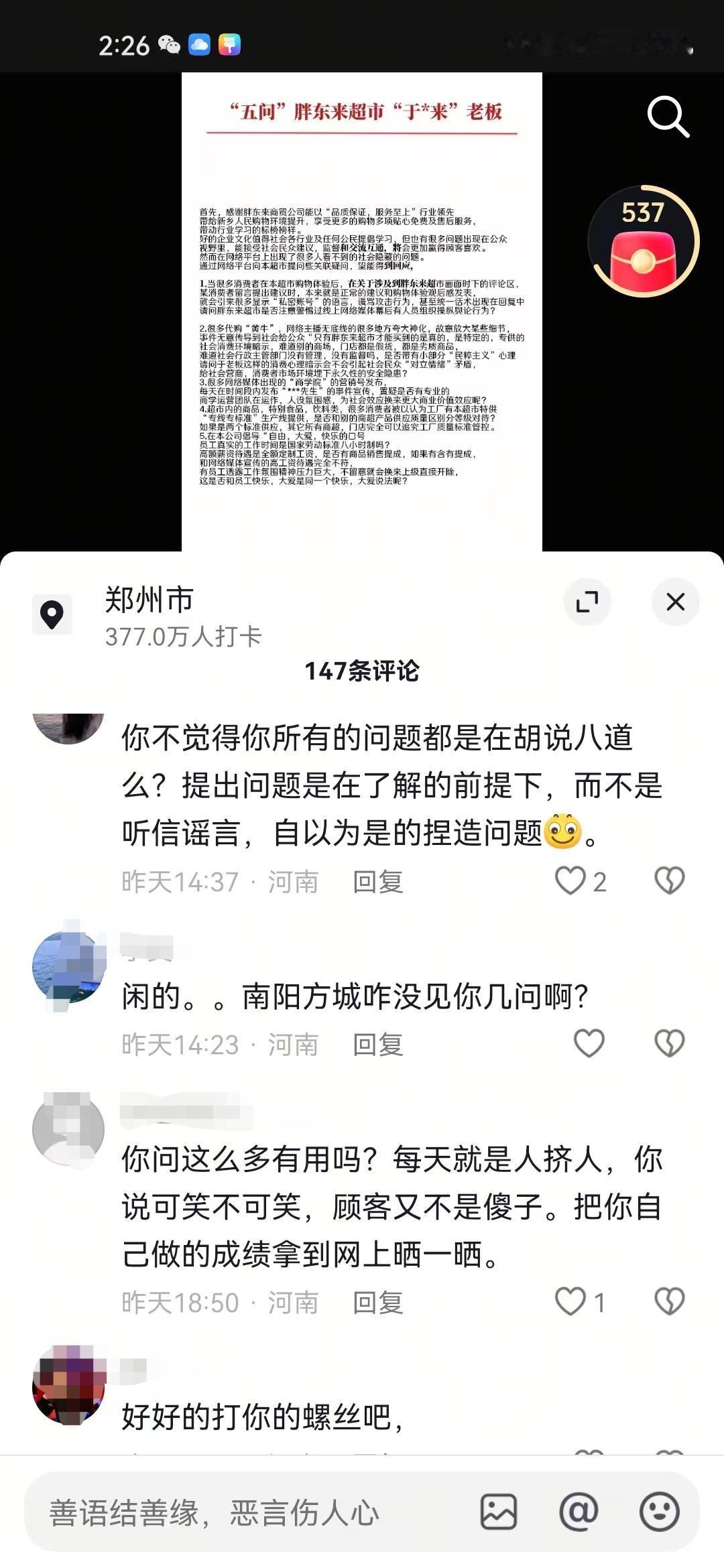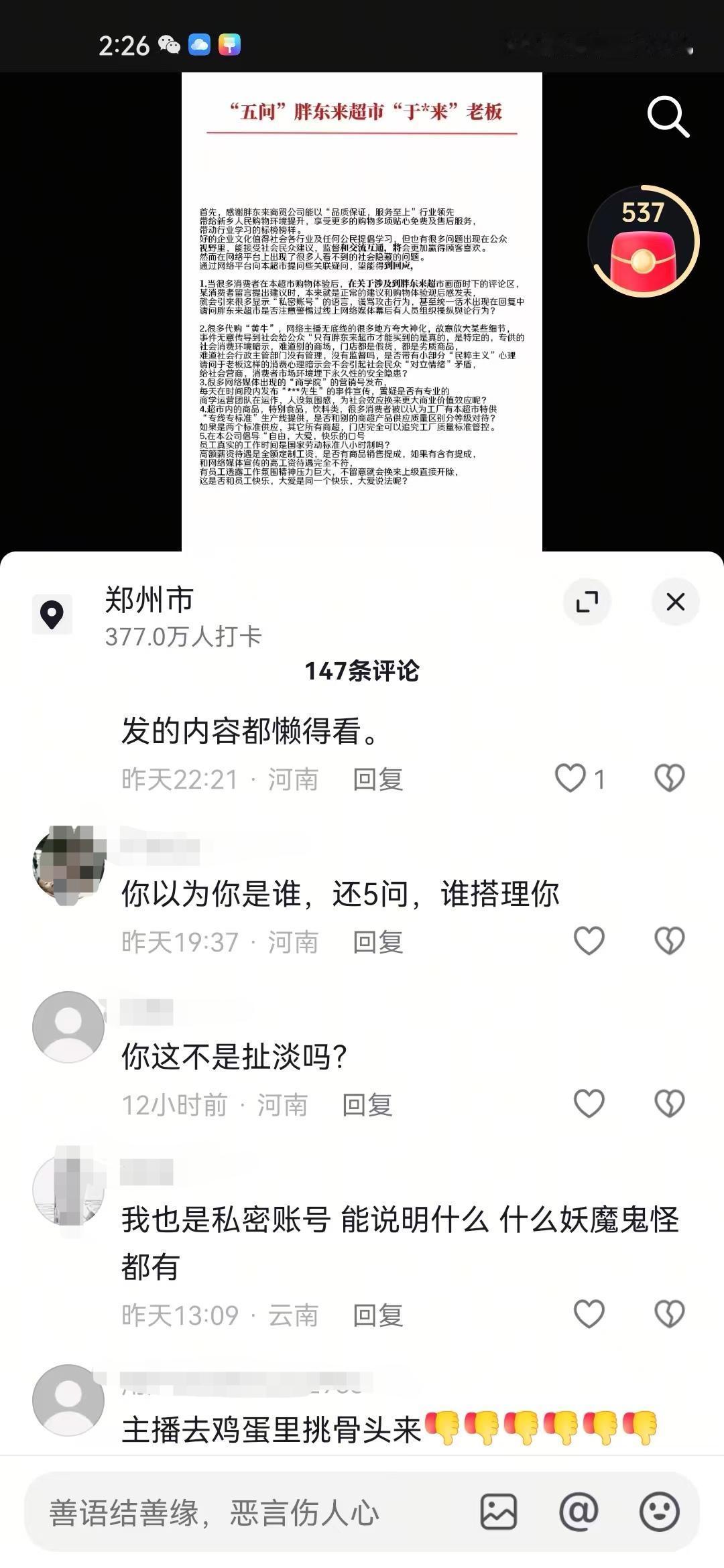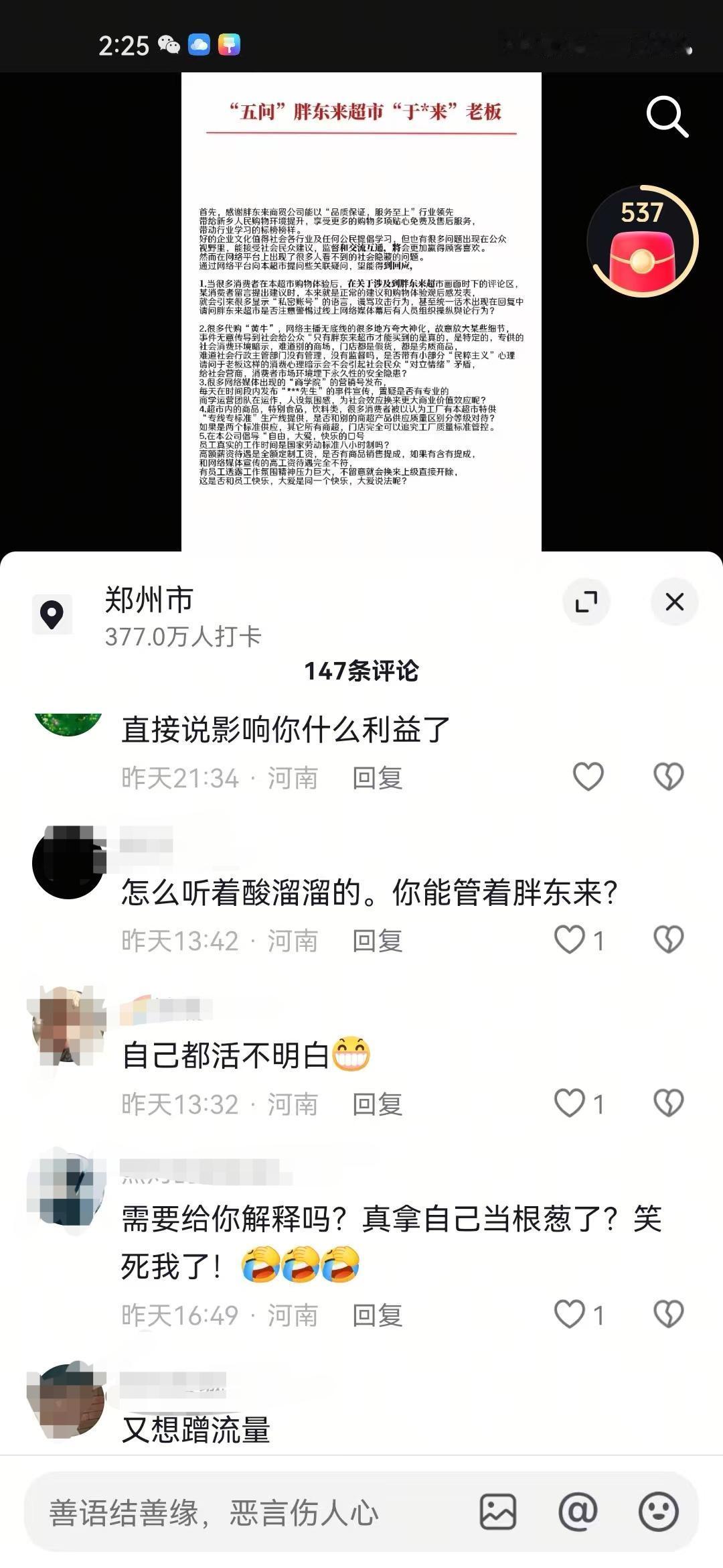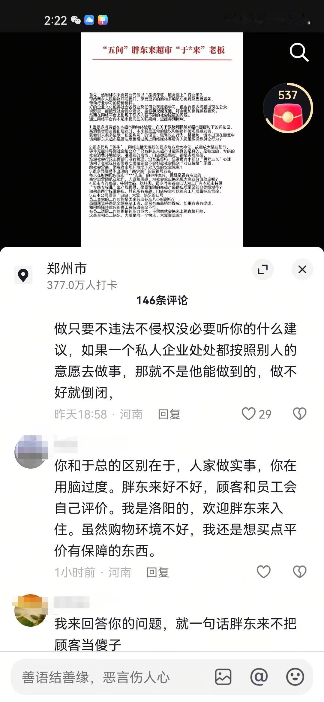 有网友在网上给胖东来提出五条疑问,说实话这五条疑问并没有太大不妥,也是不少网友的疑问,然而胖东来粉丝就不乐意了,直接将这个网友打成“黑子”“柴怼怼”之类标签的。 在网上看到有不少这位网友五条疑问中的事情,有不少网友就是单纯的把自己在胖东来买到的,出问题的商品发到了网上,结果被一堆当地IP的人说是“黑子”,什么“柴怼怼”“内裤姐”评论都来了。 还有不少代购和研学,每天发的视频基本上都是夸大宣传,什么胖东来的豆芽不用洗,怕自来水把豆芽洗脏了,什么胖东来韭菜都是自己买地荒废6年时间种的,诸如此类的。 另外说胖东来的商品都是开专线生产的评论也很常见,胖东来自营果汁单独开专线,胖东来自营油单独开专线,还有的说胖东来非自营的也会单独开专线。 个人认为这位网友提出的5条疑问并没有什么问题,网上对于胖东来视频底下的评论很常见,当地IP的人在网上也是极力维护胖东来,容不得半点不好的评论,就连这个网友的视频底下,也都是这种评论。