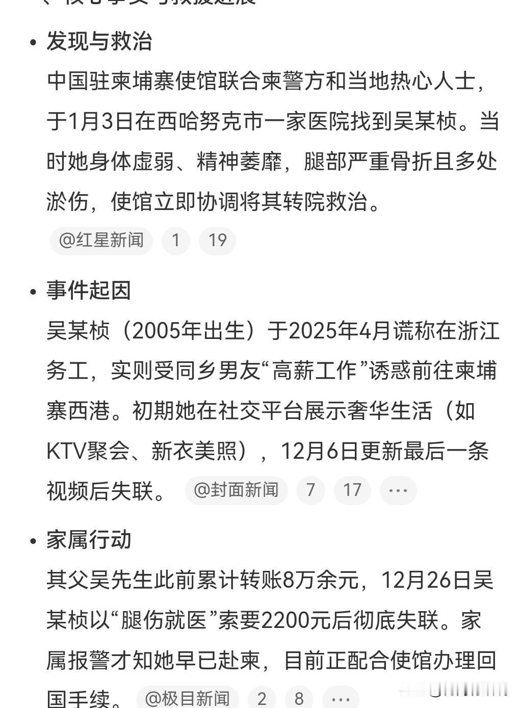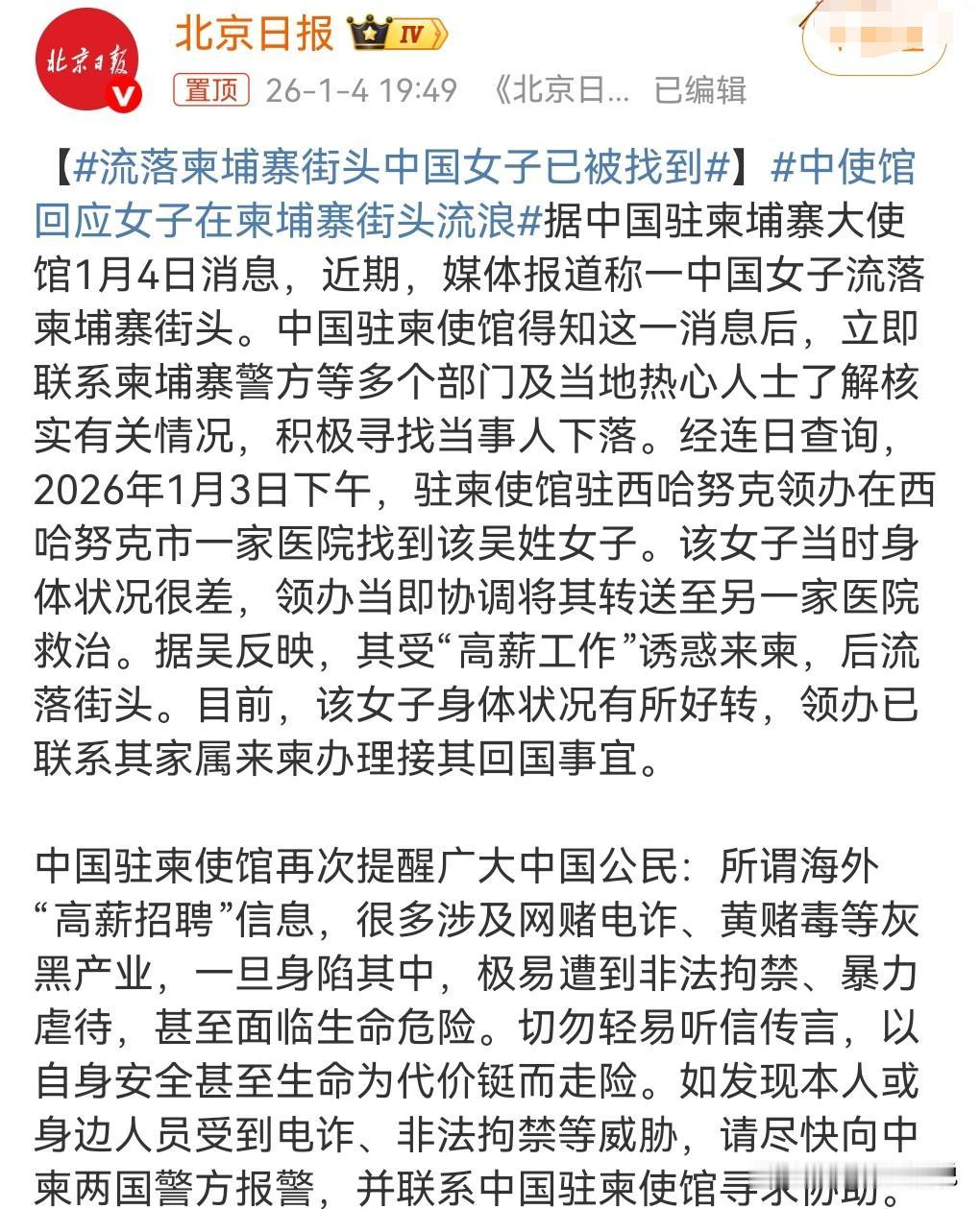 要谨慎出国,不要轻易相信他人。 流落柬埔寨街头中国女子已被找到,经过医院的救治状态也是慢慢的好起来了。 多亏经过了媒体的报道,要不然这女孩儿绝对会更惨。 所以别再去什么柬埔寨、缅甸这样的国家啦。 毕竟骗子太多了。 那帮坏人都是没人性的,有的被骗者甚至失去生命。