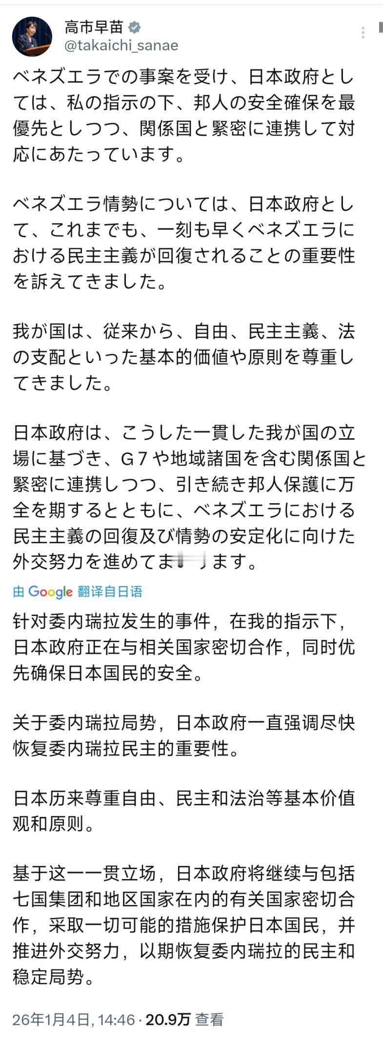 高市早苗今天(1月4日)谈到美军越境抓捕委内瑞拉总统马杜罗。高市早苗的推文写道:“针对委内瑞拉发生的事件,在我的指示下,日本政府正在与相关国家密切合作,同时优先确保日本国民的安全。关于委内瑞拉局势,日本政府一直强调尽快恢复委内瑞拉民主的重要性。 高市早苗1月4日针对美军越境抓捕马杜罗的推文,看似是常规的外交表态,实则处处透着其一贯的政治底色与日本对美依附的外交惯性,每一句表述都能在其过往执政轨迹和日美关系现实中找到对应落点。 作为日本历史上首位女性首相,高市早苗自2025年10月上台以来,就以坚定的右翼立场和对美紧跟姿态示人,这次针对委内瑞拉局势的发声,本质上是其借国际热点巩固对美同盟、彰显自身执政权威的一次精准操作。 先看她文中“在我的指示下”这句表述,看似霸气的权力宣示,实则暴露了她急于强化执政合法性的心态,要知道她上台之初就因与公明党决裂陷入政治困境,后续靠着与日本维新会联合执政才勉强稳住局面,而这种“指示政府”的表述,多少是想借外交议题塑造强势领导人形象,毕竟在她过往的政治履历中,从总务大臣到经济安全保障担当大臣,每一次晋升都离不开对保守派立场的坚守和对美国政策的呼应。 再看“日本政府正在与相关国家密切合作,同时优先确保日本国民的安全”这一说法,表面上是务实的国民利益考量,实则暗藏对美同步的深层逻辑。 回顾2025年12月高市早苗政府力推的80万亿日元对美投资计划,涵盖能源、AI、造船等多个领域,协议条款苛刻到日本需等美国产生160万亿日元收益才能收回本金,后续90%利润还归美国所有,这种近乎“输血式”的合作早已说明,日本所谓的“相关国家”核心就是美国。 而确保国民安全的表述更像是一句空话,当前日本国内核心CPI已连续43个月高于央行目标,大米价格暴涨40%,民众实际工资连续8个月下滑,普通家庭连燃气电费涨价都难以承受,高市政府对这些民生困境视而不见,却在远隔重洋的委内瑞拉局势上大谈国民安全,难免让人觉得是避重就轻。 更值得玩味的是,日本在委内瑞拉的侨民数量不足千人,投资规模也仅占其海外投资总额的0.3%,所谓的安全风险本就微乎其微,这种过度反应恰恰说明其表态的核心不是国民安全,而是紧跟美国步伐的政治正确。 高市早苗强调的“尽快恢复委内瑞拉民主”“尊重自由、民主和法治等基本价值观”,更是站在美式价值观阵营的明确表态,这与其一贯的右翼政治主张一脉相承。 作为被公认的日本政坛极右翼政治家,她不仅多次参拜靖国神社,还否认侵略历史,甚至试图修改和平宪法第九条将自卫队改为“国防军”,这种在国内否定历史正义、挑战和平秩序的政客,却在国际上大谈民主法治,本身就充满了表演色彩。 再结合美国对委内瑞拉的长期制裁背景来看,自2017年以来美国已对委内瑞拉实施1039项单边强制措施,涵盖石油行业、金融领域等关键板块,导致委内瑞拉国家石油公司损失2320亿美元,五年内对国内生产总值的影响高达6420亿美元,而这些制裁的借口恰恰也是“推动民主”。 高市早苗此时重提这一论调,无疑是在呼应美国的对委政策,毕竟她上台后推动的诸多外交举措,从干涉台湾问题到强化日美安保合作,都是以紧跟美国为核心导向,这次也不例外,本质上是将日本的外交立场完全绑定在美国的价值观战车之上。 至于“将与包括G7和地区国家在内的有关国家密切合作”的表述,则清晰暴露了日本试图借G7框架巩固自身国际地位的考量。 高市早苗政府上台后,一直试图通过参与国际多边机制提升日本的话语权,但这种参与始终是以对美依附为前提的。 此前在G7峰会上,日本就曾积极配合美国提出的多项针对其他国家的制裁提案,甚至主动牵头推动相关议题,而这次针对委内瑞拉局势,再次强调与G7合作,就是想借助这一平台强化对美同盟的同时,拉拢其他盟友提升自身影响力。 但从实际效果来看,日本的这种跟跑式外交并没有带来太多实质性收益,反而因过度配合美国导致与多个国家的关系恶化,比如2025年11月其就台湾问题发表挑衅言论后,不仅遭到中、韩、俄、朝四国的强烈批评,连美国前总统特朗普都公开与其划清界限,国内旅游业、零售业也因中国游客减少面临年损失1.79万亿日元的困境。 更讽刺的是,高市政府一边拿出80万亿日元对美“输血”,一边对国内民生困境吝啬投入,这种“外厚内薄”的政策选择,让其所谓的“保护日本国民”显得格外苍白,而这次借委内瑞拉局势的表态,更像是一场转移国内矛盾、巩固对美关系的政治表演,毕竟在其执政根基尚不稳固的情况下,紧跟美国、借国际议题发声,远比解决国内民生难题要容易得多。