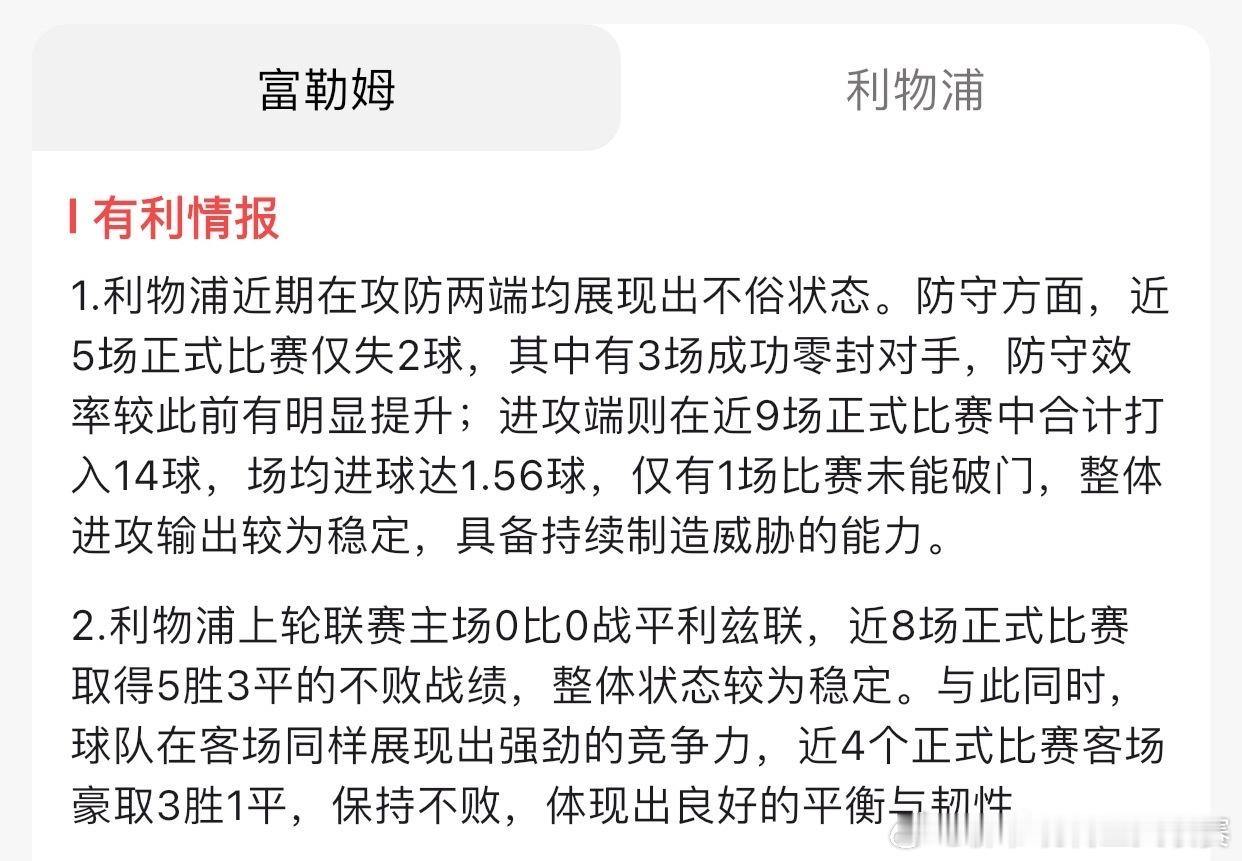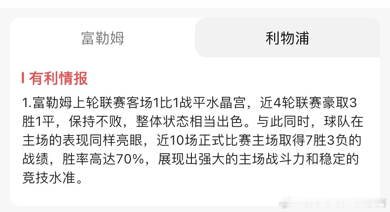 011英超 富勒姆vs利物浦胜平负推荐:负/双平比分推荐:0-1 0-2 1-2进球数:2/3球主队:富勒姆本赛季在马尔科·席尔瓦的调教下,防守质量有了质的飞跃,19轮联赛仅丢18球,是英超失球数第4少的球队。主场战绩尤为强悍,9个主场取得5胜3平1负,打入14球仅丢6球,场均控球率虽只有42%,但反击效率极高。球队近期状态稳定,上轮客场1-1逼平水晶宫,中场核心威尔逊送出助攻,连续三场比赛参与进球。然而,球队面临进攻端的人员荒,主力前锋米特罗维奇因膝伤继续缺阵,这名塞尔维亚射手本赛季已打入8球,他的缺阵让球队前场支点作用丧失。此外,替补前锋穆尼斯状态起伏大,门前把握机会能力差。防守端,主力中卫阿达拉比奥尤累计黄牌停赛,这对防线的出球能力是打击,老将里姆将顶替其位置,面对利物浦的高压逼抢,转身速度将面临严峻考验。客队:利物浦本赛季目标直指冠军,球队的客场战斗力极强,9个客场取得7胜2平保持不败,打入23球丢失9球,客场进球数英超第一。进攻体系依赖萨拉赫、努涅斯和迪亚斯的三叉戟组合,三人合计打入25球,但近期世俱杯的密集赛程让主力体能透支。球队在世俱杯决赛中暴露了防守端的隐患,面对维尼修斯和姆巴佩的冲击,边后卫阿诺德身后的空当被反复利用。阵容方面,主力中卫范戴克因累计黄牌本场停赛,这对防线的统领作用是巨大损失,替补中卫科纳特需与马蒂普搭档,但后者也是玻璃人体质,出勤率不稳定。好在中场核心麦卡利斯特伤愈复出,他的覆盖能力能有效保护后防。球队急需一场胜利来紧咬曼城,此役面对富勒姆,斯洛特大概率会要求前场高位逼抢,限制主队的出球,利用快速传递撕开防线。分析:从过往交锋记录来看,利物浦占据绝对优势,心理层面占据上风。综合各方面因素,利物浦在整体实力、战术素养和比赛经验上都远超富勒姆。尽管富勒姆主场作战会全力以赴,但面对强大的利物浦,想要爆冷取胜难度极大。预计利物浦将掌控比赛节奏,凭借出色的进攻和稳固的防守,在客场取得胜利,延续良好状态。