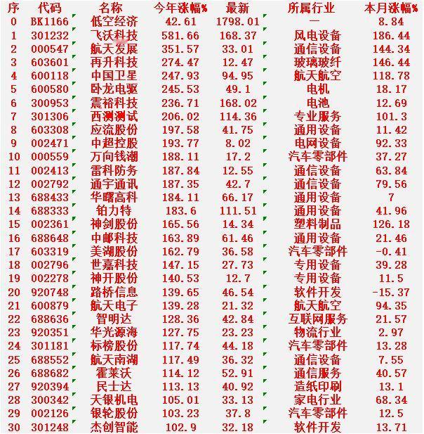 低空经济概念,2025年以来涨幅最多的30名单 低空经济:今年涨幅 +42.61%,本月涨幅 +8.84% 飞沃科技:今年涨幅 +581.66%,所属行业 风电设备,本月涨幅 +186.44% 航天发展:今年涨幅 +351.57%,所属行业 通信设备,本月涨幅 +144.34% 再升科技:今年涨幅 +274.47%,所属行业 玻璃玻纤,本月涨幅 +146.44% 中国卫星:今年涨幅 +247.93%,所属行业 航天航空,本月涨幅 +118.78% 卧龙电驱:今年涨幅 +245.53%,所属行业 电机,本月涨幅 +18.17% 震裕科技:今年涨幅 +236.71%,所属行业 电池,本月涨幅 +12.69% 西测测试:今年涨幅 +206.02%,所属行业 专业服务,本月涨幅 +101.30% 应流股份:今年涨幅 +197.58%,所属行业 通用设备,本月涨幅 +11.42% 中超控股:今年涨幅 +193.77%,所属行业 电网设备,本月涨幅 +92.33% 万向钱潮:今年涨幅 +188.11%,所属行业 汽车零部件,本月涨幅 +37.27% 雷科防务:今年涨幅 +187.84%,所属行业 通信设备,本月涨幅 +63.84% 通宇通讯:今年涨幅 +187.35%,所属行业 通信设备,本月涨幅 +79.56% 华曙高科:今年涨幅 +184.11%,所属行业 通用设备,本月涨幅 +7.00% 铂力特:今年涨幅 +183.60%,所属行业 通用设备,本月涨幅 +41.96% 神剑股份:今年涨幅 +165.56%,所属行业 塑料制品,本月涨幅 +126.18%