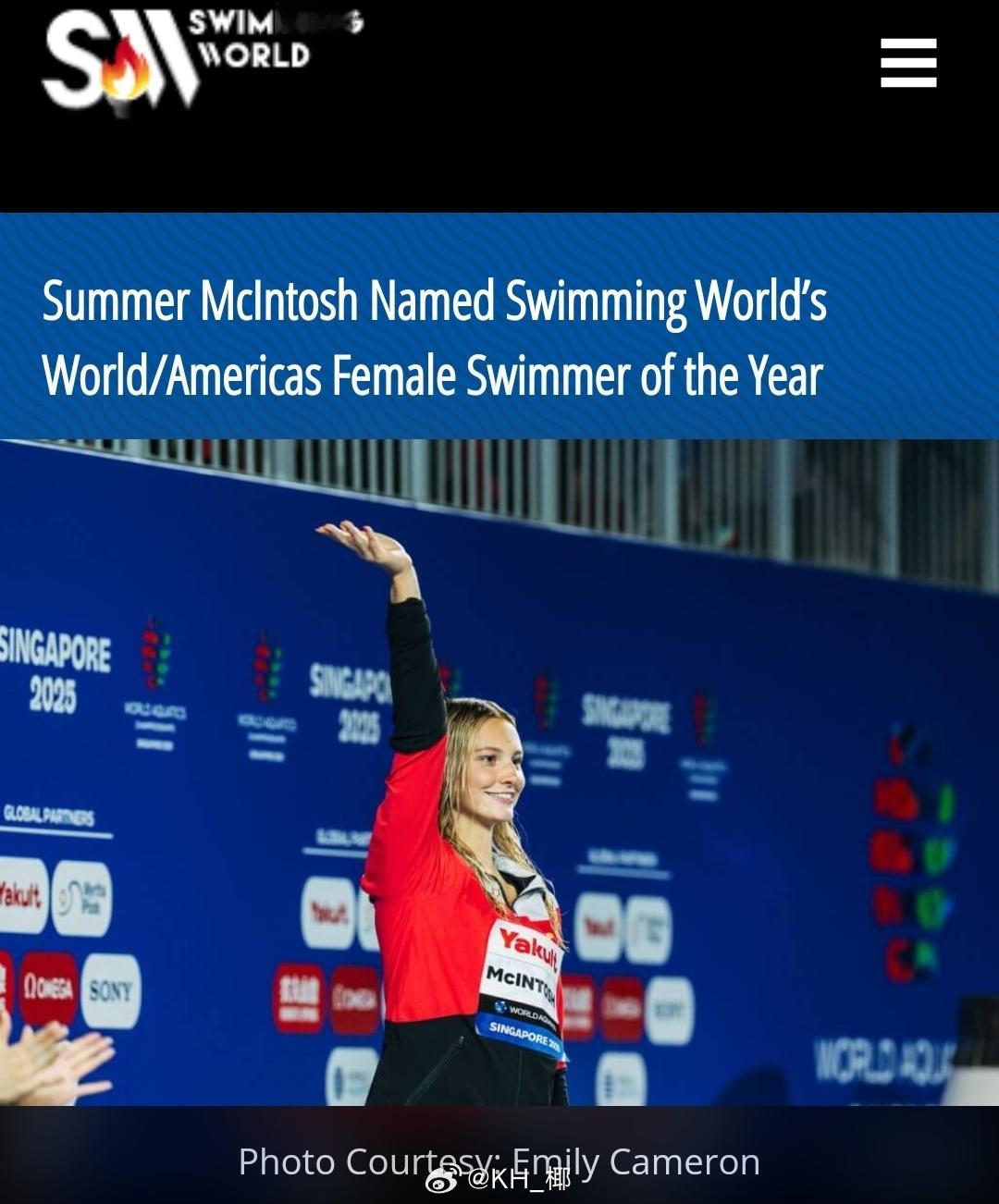《游泳世界》评选2025年度最佳男/女游泳运动员🇫🇷Leon Marchand & 🇨🇦Summer McIntosh法国弟也是连续第三年获评该奖项