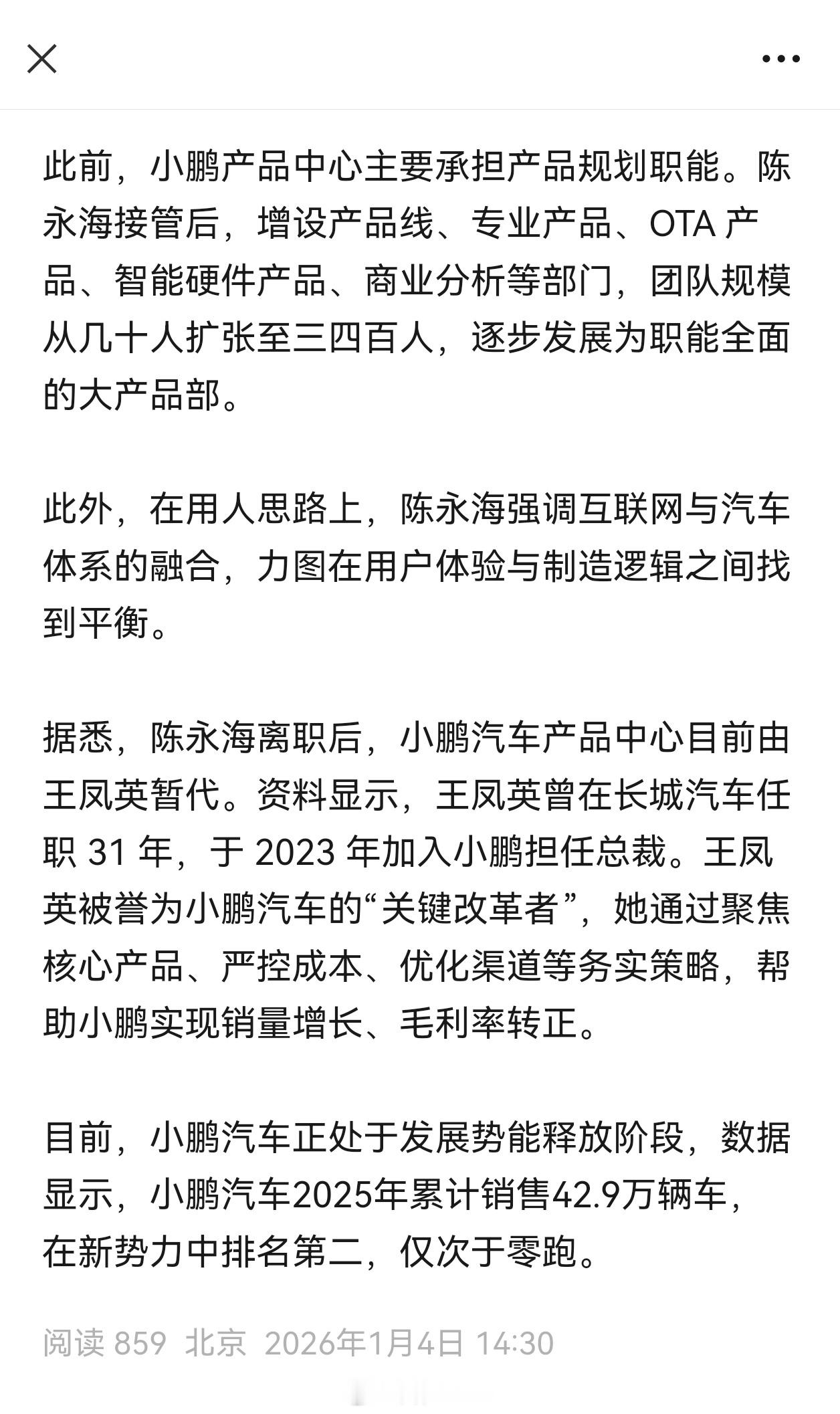 既然很多人在聊小鹏的过去和未来,那我再展开说说。小鹏的问题,有两点:1、缺少一个足够出圈的故事;2、至少在某一项关键技术上,需要在国际领域崭露头角。我有个观察,我们对濒死过一次的人/物,是有天然的敬畏感,是向往的。所以我们有常山赵子龙单骑救主,有凤凰涅槃重生。小鹏是濒临死过一次的,至少在2023年前后,很多人认为小鹏已经退出蔚小理朋友圈。在当时,普遍认为小鹏的困境在外部。至于内部,新势力肯定没有老牌车企的那些盘根错节,阻力应该还不算大。很多人低估了内部杀伤。当小鹏开始整顿内务,祭出MONA M03时,小鹏好像突然活了。其实看看小鹏那段时间的调整,好像并没有特别的新技术出来,但就是整出了一台超强性价比,颜值还不赖,科技感还挺好的轿车。但有一说一,自古内务整顿这种故事并不出彩。即便有铁娘子万凤英的力挽狂澜故事,但在悲壮层面还是差了点火后。是的。那种因为外部巨大冲击差点死亡,最终成功活下来的故事,才最吸引人。比如中国几家老牌车企,你会发现或多或少有这样的故事。或许小鹏还需要真正意义上再死一次?哈哈。当然,这是在夸小鹏了,至少说明小鹏在当下环境下,还没受到技术层面的毁灭式打击。那是不是说,小鹏已经解决第二个问题了?某种程度来说,就小鹏这个体量的公司,能做到当下这样已经非常不错了。他们有AI,有机器人,有飞行汽车。而且都已经量产或者无限接近量产。只不过在小鹏同样路径下,还有特斯拉。技术这东西很奇怪,大家只认第一,不认第二。第一的商业价值可以是老二到老十的总和。当然,你要说小鹏IRON其实比特斯拉Optimus更强,我也是认同的。至少行走姿态方面,IRON的猫步展示出惊人的仿生学特征,特斯拉Optimus步态稳健但略显机械。但这些距离普罗大众还尚有距离,如果今天是2035年,或许我们就不需要讨论这些。所以回过来,小鹏其实要解决的是在汽车领域,至少有那么一项顶尖技术深入人心。P7+是一个不错的尝试,至少在上海,我还没有在路上看到的比它更蒸汽朋克的车。但这些总归还是弱了一些。或许L3的商用是一个不错的触发线,按照工信部的规划,2026年的工作重心应该就是就这儿了。总而言之。小鹏不错,这家企业甚至在2023年那会,我认为都没有要真正被摧毁的时刻。但或许也是这样,小鹏还缺少一次绝对危机的时刻。可能在那时,小鹏才会迸发最大能量。小鹏汽车