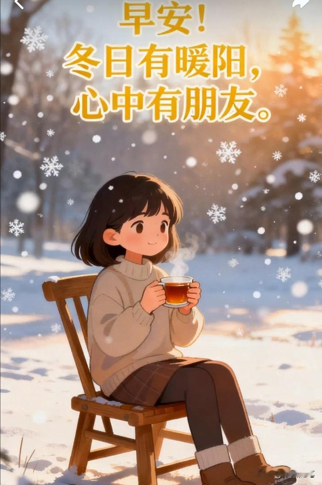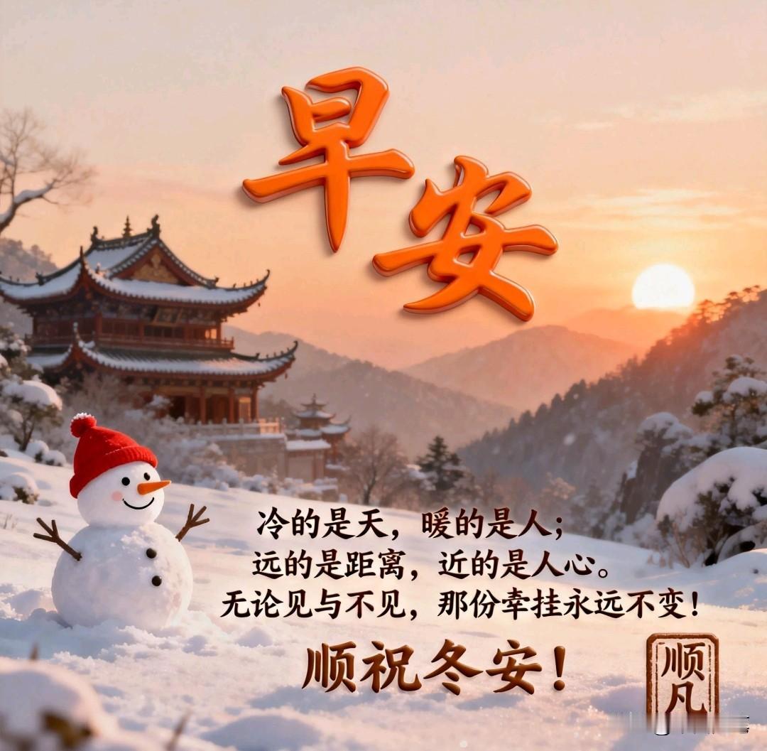 冬日问候语图图:愿笑迎寒冬怀期许,静候花开万物荣。早上好! 1. 雪花纷飞映寒夜,炉火正暖慰岁长,愿温柔抚平岁月痕,安康常伴共此冬。早上好! 2. 寒风凛冽凝霜色,思念如阳暖襟怀,愿问候化拥抱驱寒,心暖长存伴君安。早上好! 3. 热茶氤氲融冷雾,霜天遥望寄情长,愿冬静好常相守,平安喜乐万事昌。早上好! 4. 冰凝窗棂雕玉色,霜花绽笑映梅香,愿每缕冬意藏吉兆,岁岁春熙伴君旁。早上好! 5. 冬阳虽薄蕴希望,暖炭生烟渐佳境,愿心向光明无惧冷,岁暖如春福满庭。早上好! 6. 冰凌垂落待消融,春溪流淌报佳音,愿笑迎寒冬怀期许,静候花开万物荣。早上好! 7. 围巾轻绕护风霜,牵挂绵长暖岁寒,愿冬意皆化温柔伴,步履安然度此年。早上好! 8. 梅香暗涌破冬寂,春近深藏蓄暖阳,愿心怀希冀无惧凛,万物新生待君赏。早上好! 9. 冬夜虽长星未眠,暖意沉淀待重逢,愿此岁静好蓄春意,来年与君共暖风。早上好。! 10. 冬为春序藏力量,雪融即与春风舞,愿凛冽中积蓬勃志,笑待花开万物苏。早上好! (图片AI制作来自网络) 冬日祝福语 冬日早安祝福语 冬季首句祝福 冬日暖心句