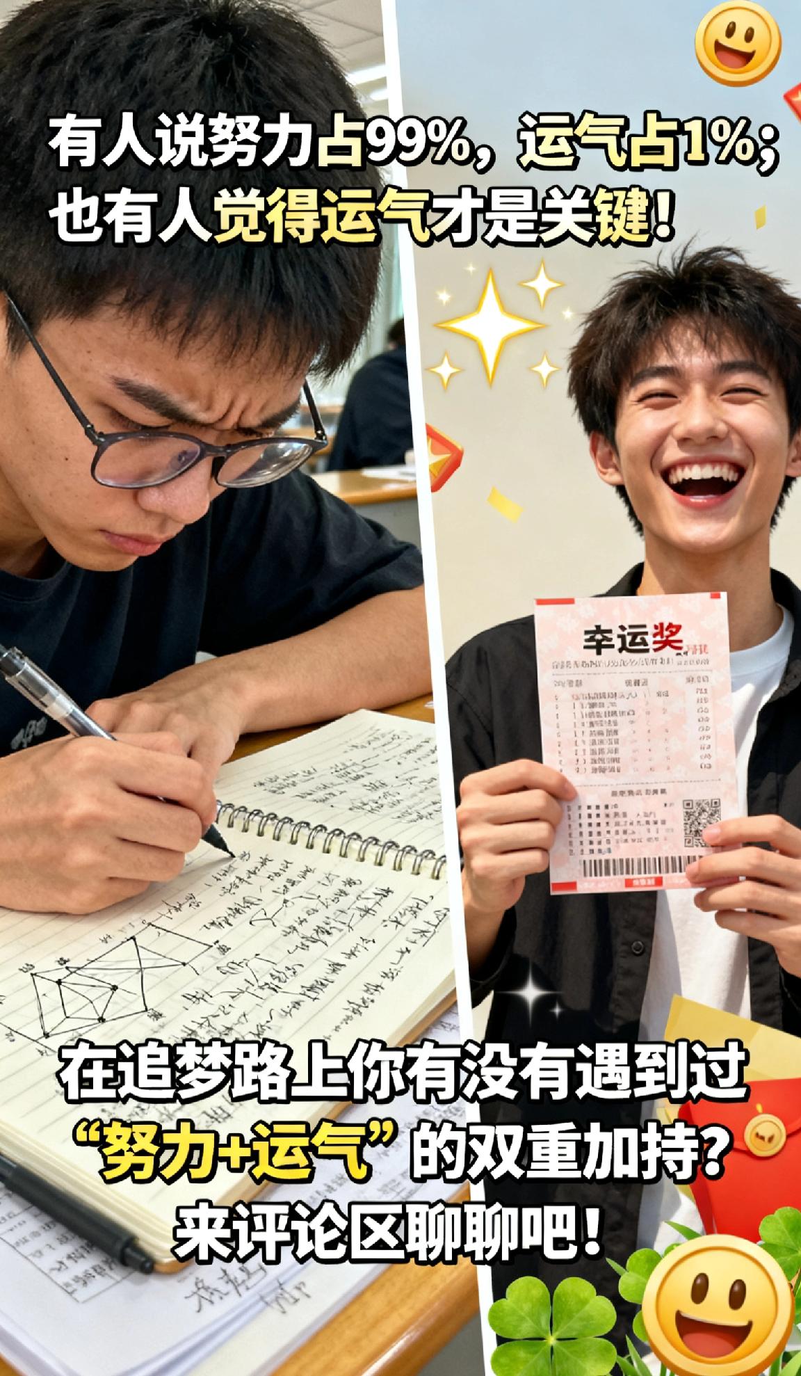 有人说努力占99%,运气占1%;也有人觉得运气才是关键!你在追梦路上,有没有遇到过“努力+运气”的双重加持?来评论区聊聊~命运靠自己努力 运气变好小技巧