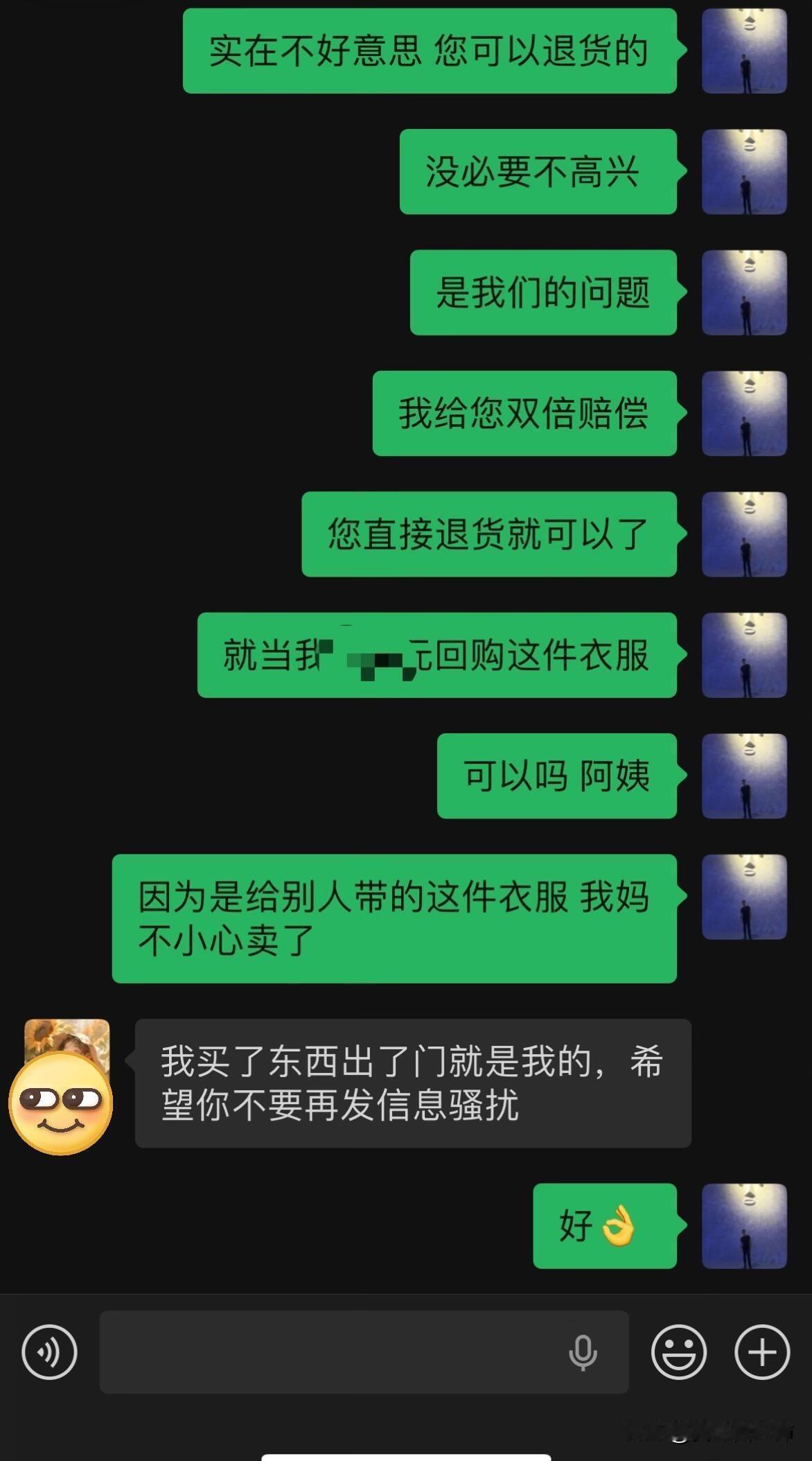 今天让我母亲临时看一会店 遇到一个客人80块钱买了一件拉夫劳伦的红色毛衣 我加上联系方式 说明我是服装店老板 家里老人把衣服价格弄错了 对方马上屏蔽我朋友圈 然后说我骚扰 我说明情况 老人临时帮忙看一会店报错价了,她妈妈用她的微信回复我 说我是黑店 涨价 (我们是有醒目标价的,而且我都没提补钱,我就是说报错价而已!)店里冬天没有任何一个商品是80元,冬天我们卖的围脖都是獭兔毛的零售200多,客人是有朋友来我们店里买过衣服的,所以也清楚我们的商品大概都是些什么,我想表达的很简单,客人是知道报错价了的) 而且还在我说我是服装店老板后屏蔽我了(没加说之前是看得到朋友圈的,我们还有共同朋友,我是通过客人进入我们的粉丝群看到的共同朋友,知道衣服卖错了我就截图了客人的微信我怕被拉黑,加上了之后 我说我是服装店老板衣服价格报错了,她一句话都不说,应该是想拉黑完事了,于是我发截图表示我们有共同朋友,就开始打字说我是黑店了,直接暴击我 做生意看到的世界就是这么残酷因为一点小便宜就可以对别人恶语相向 哪怕是陌生人也不至于说敌意这么大吧 就好比去超市买一包烟市场价格100元 老板出去上厕所了 店里一个老年人说10元钱 你买了之后还提前把认识你朋友的超市老板屏蔽 老天爷告诉我大部分人都会这样做的 我真的接受不了 可能因为小时候社会的毒打经历的少