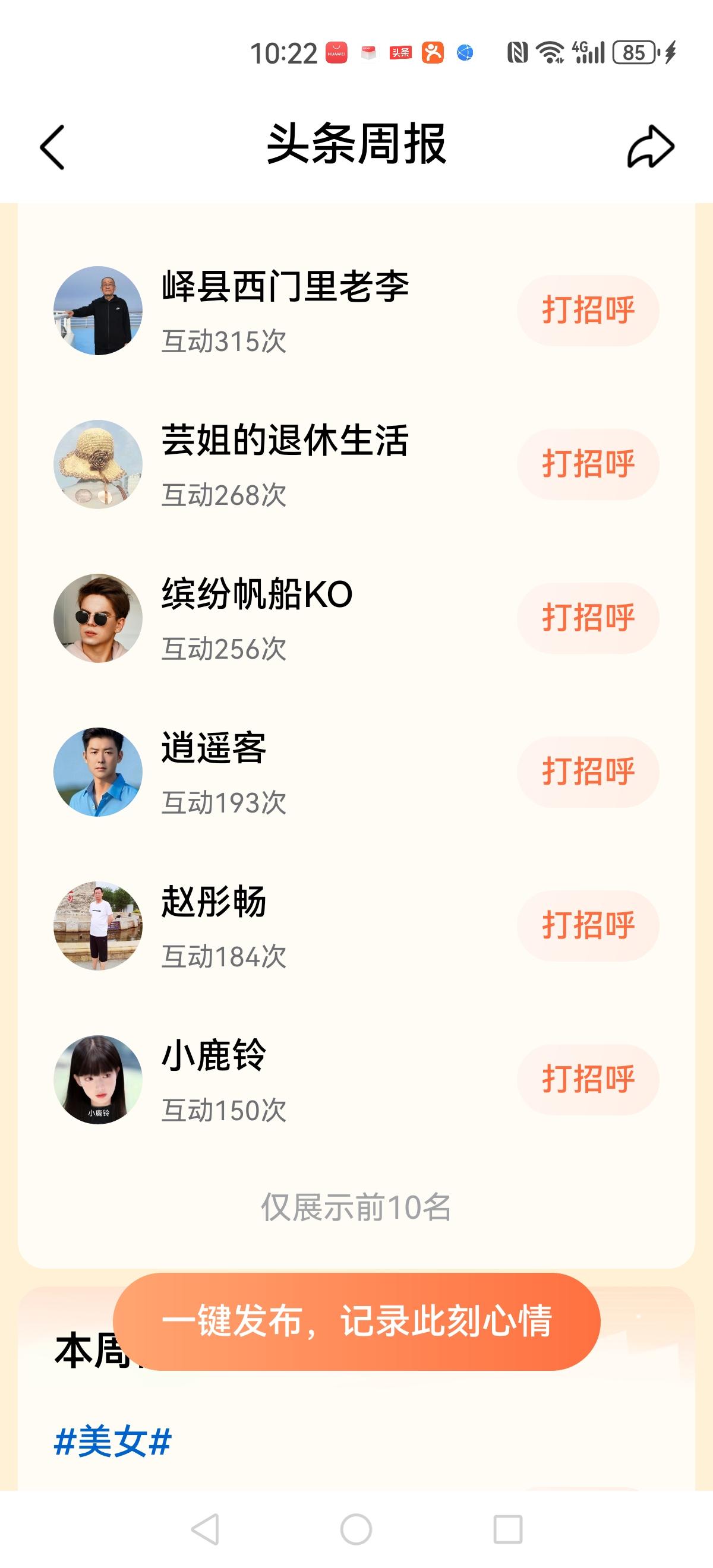新的头条周报又出炉了!与我热情互动的前10名小伙伴,恭喜祝福你们榜上有名。有了大家的陪伴,我的头条之旅更加有趣![祈祷][祈祷][福][福][玫瑰][玫瑰][给力][给力]