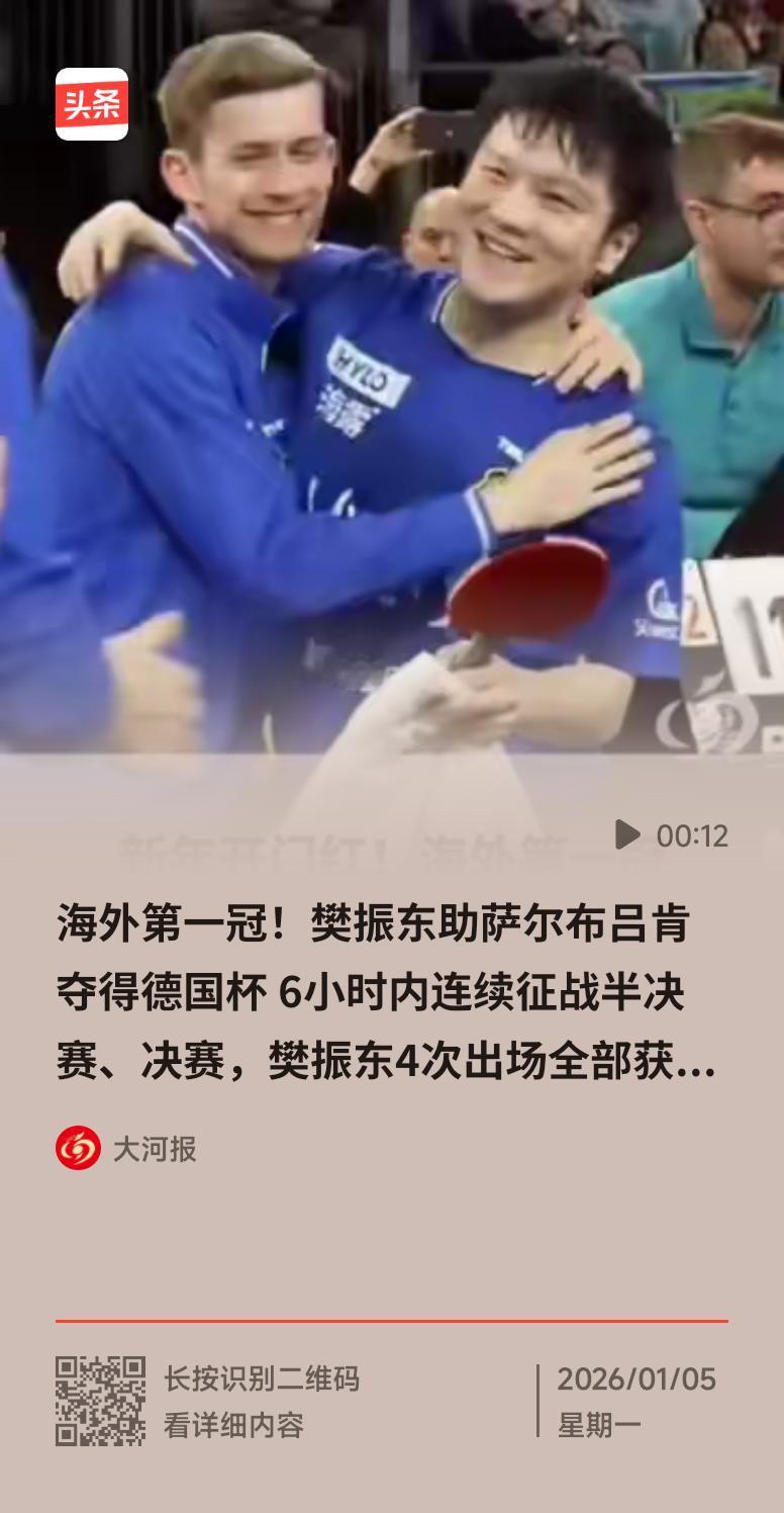 樊振东6小时4战全胜荣获德国杯MVP樊振东在德国杯6小时内连打4场且全胜,助萨尔布吕肯俱乐部夺冠并拿下MVP,拿下海外赛场首冠。高强度作战下的完美发挥,尽显国乒核心的超强实力与抗压韧性。