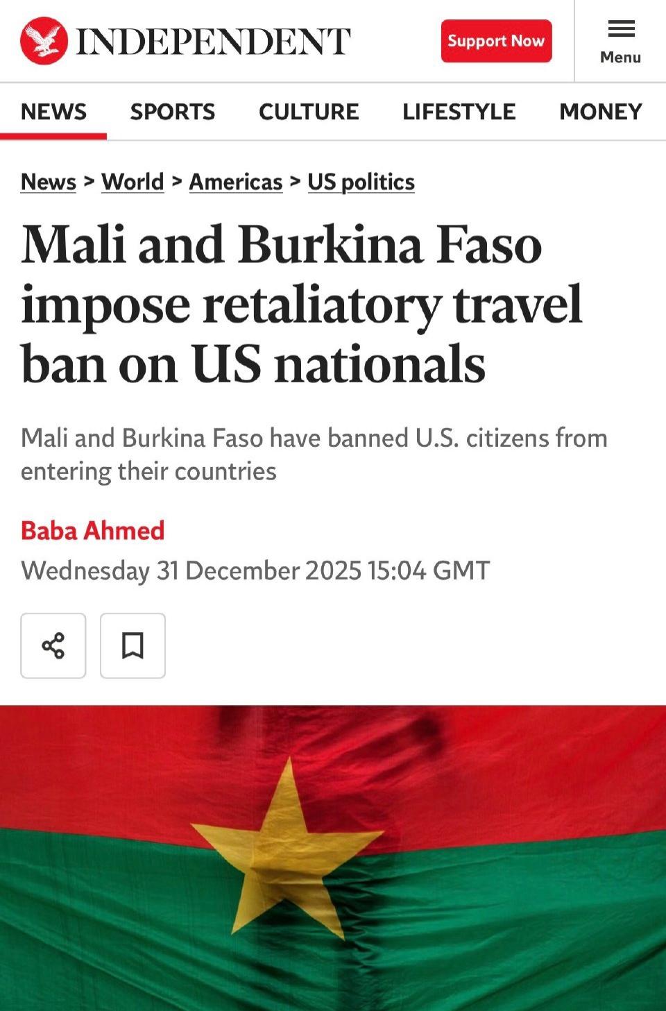 马里和布基纳法索两个非洲国家宣布,他们将禁止美国公民进入本国,以报复美国总统特朗普禁止马里和布基纳法索公民入境美国的决定。 12月16日,特朗普将先前的旅行限制扩展到另外20个国家,其中包括由军政府统治并从区域组织西非国家经济共同体中脱离出来的马里、布基纳法索和尼日尔。