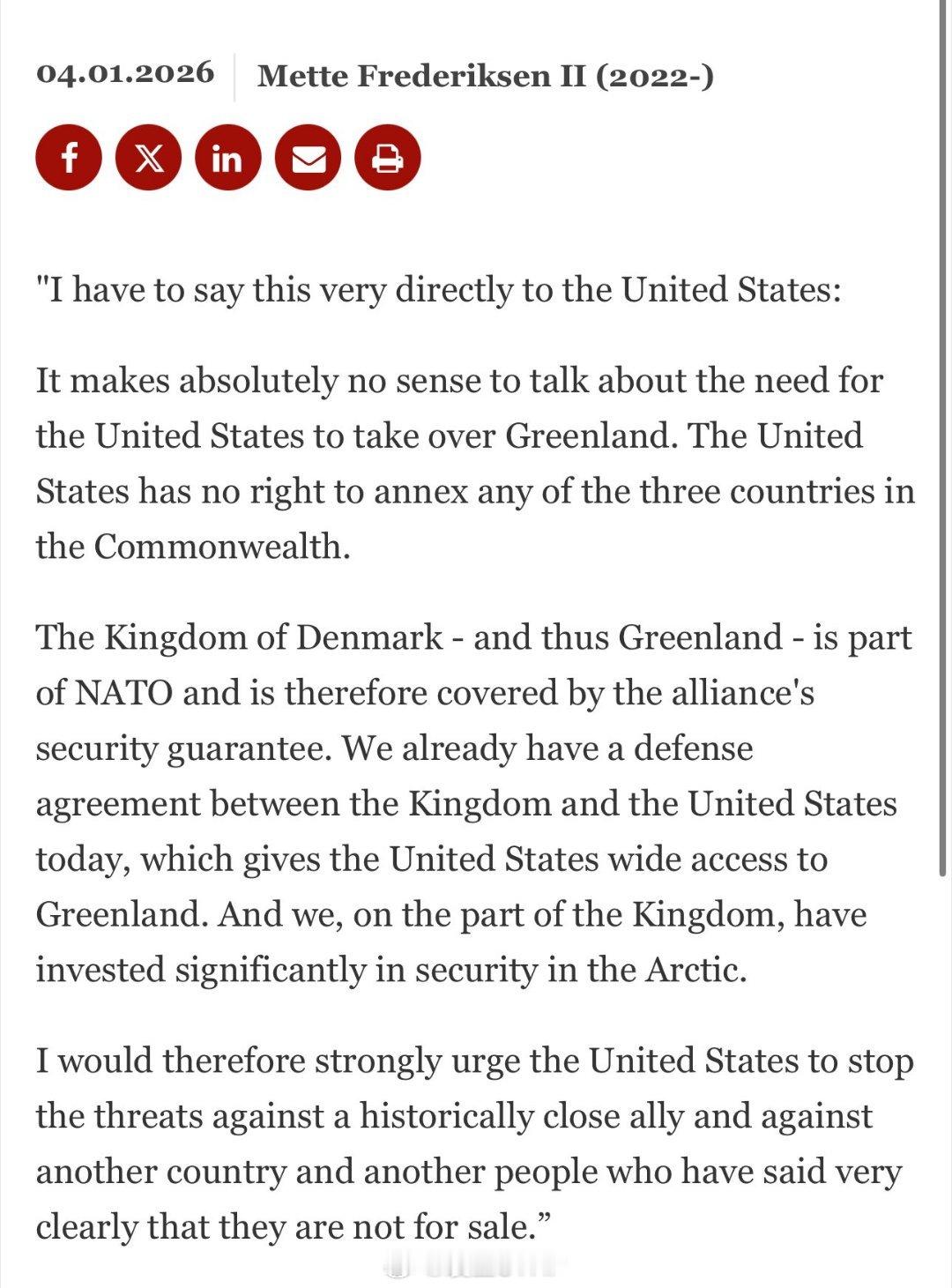 特朗普说绝对需要格陵兰岛丹麦首相要求美方停止威胁丹麦:美国无权吞并格陵兰岛丹麦首相弗雷泽里克森表示,我必须非常直接地向美国表明:谈论美国需要接管格陵兰岛这种说法完全没有意义。美国无权吞并王国中的任何一个成员国。丹麦王国——包括格陵兰——是北约的一部分,因此受到联盟安全担保的保护。如今我们王国与美国之间已经存在防务协议,该协议给予美国在格陵兰的广泛权限。而我们王国方面也已对北极安全进行了大量投入。因此我强烈敦促美国停止威胁这个历史上亲密的盟友,停止威胁另一个国家及其人民——他们已经非常明确地表示:他们不是用来买卖的。