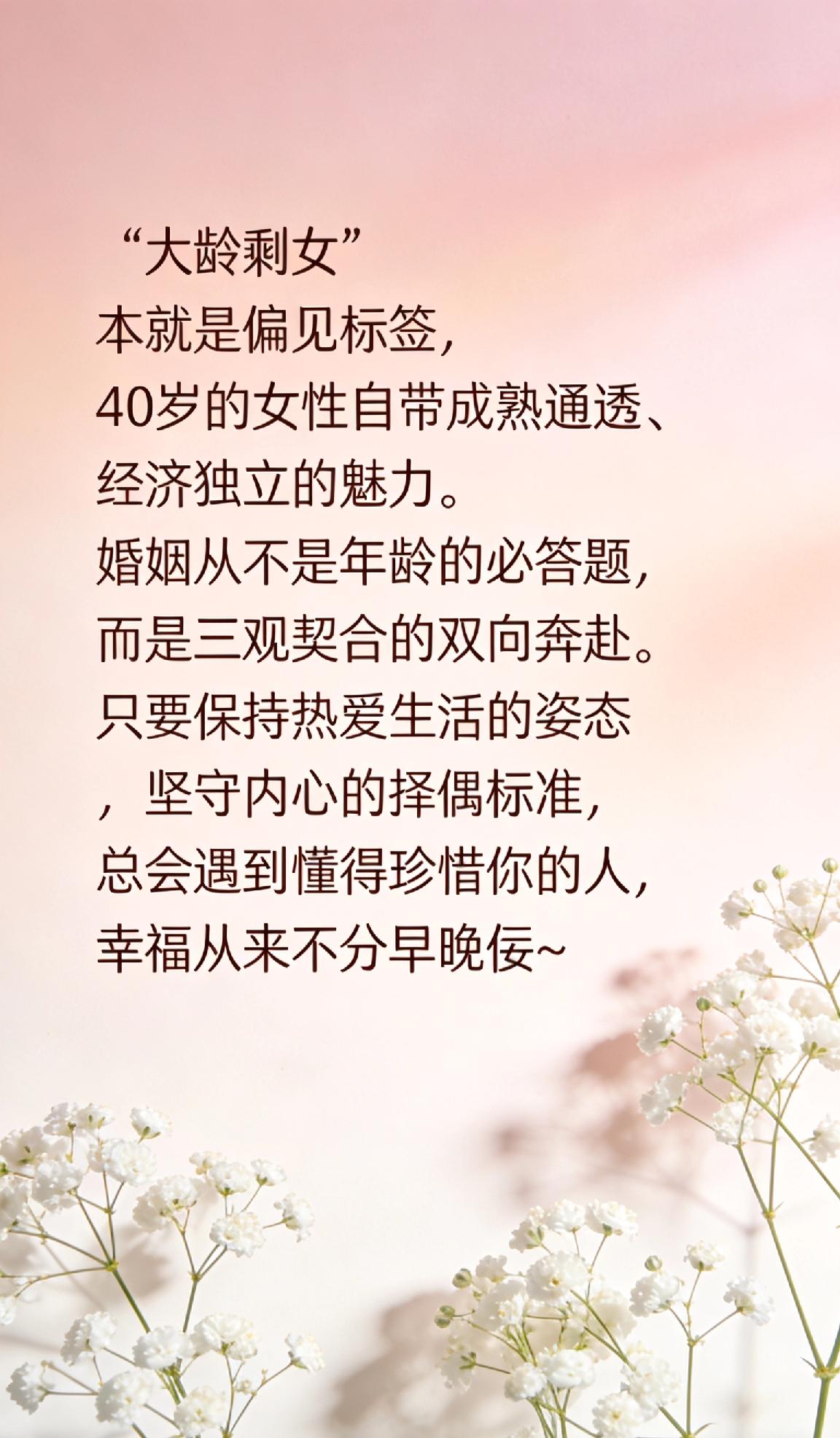 40岁的大龄剩女,会有人娶吗?“大龄剩女”本就是偏见标签,40岁的女性自带成熟通透、经济独立的魅力。婚姻从不是年龄的必答题,而是三观契合的双向奔赴。只要保持热爱生活的姿态,坚守内心的择偶标准,总会遇到懂得珍惜你的人,幸福从来不分早晚~
