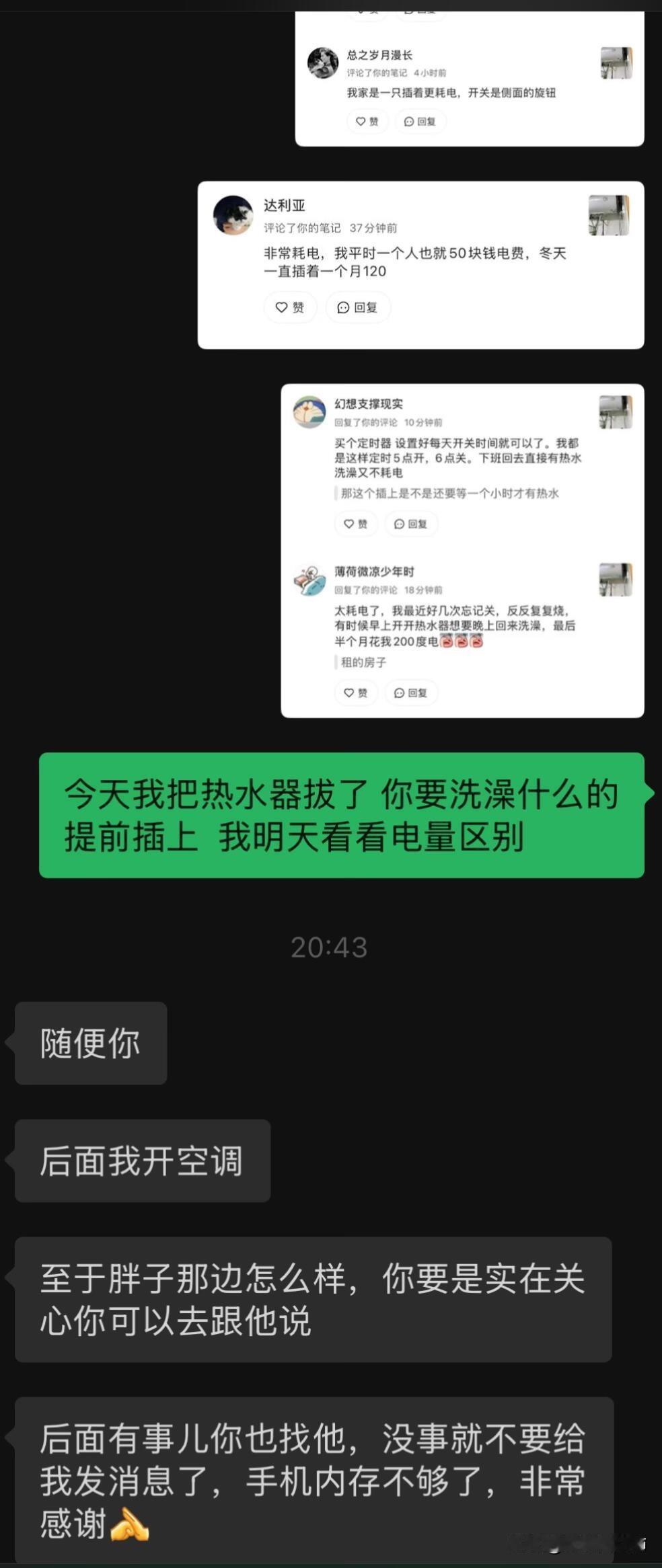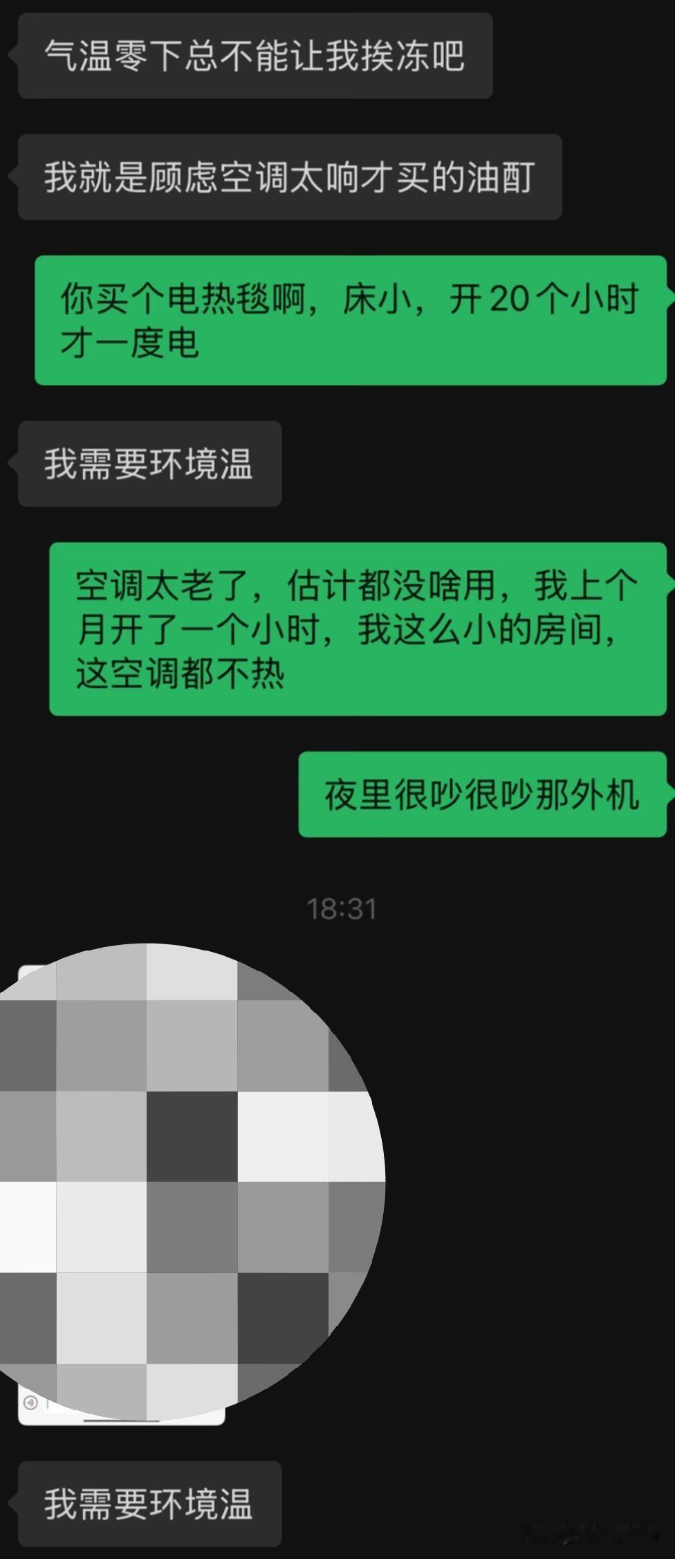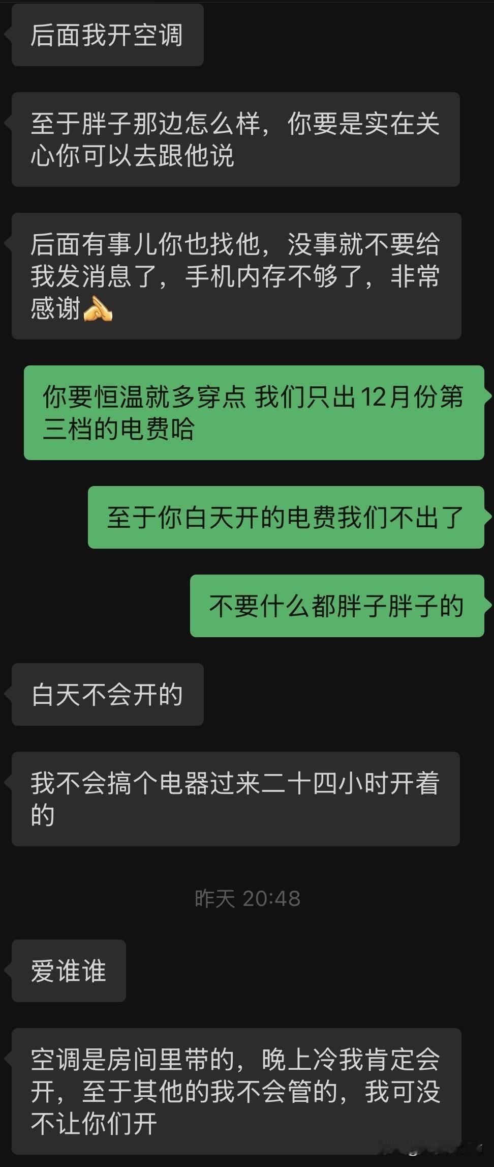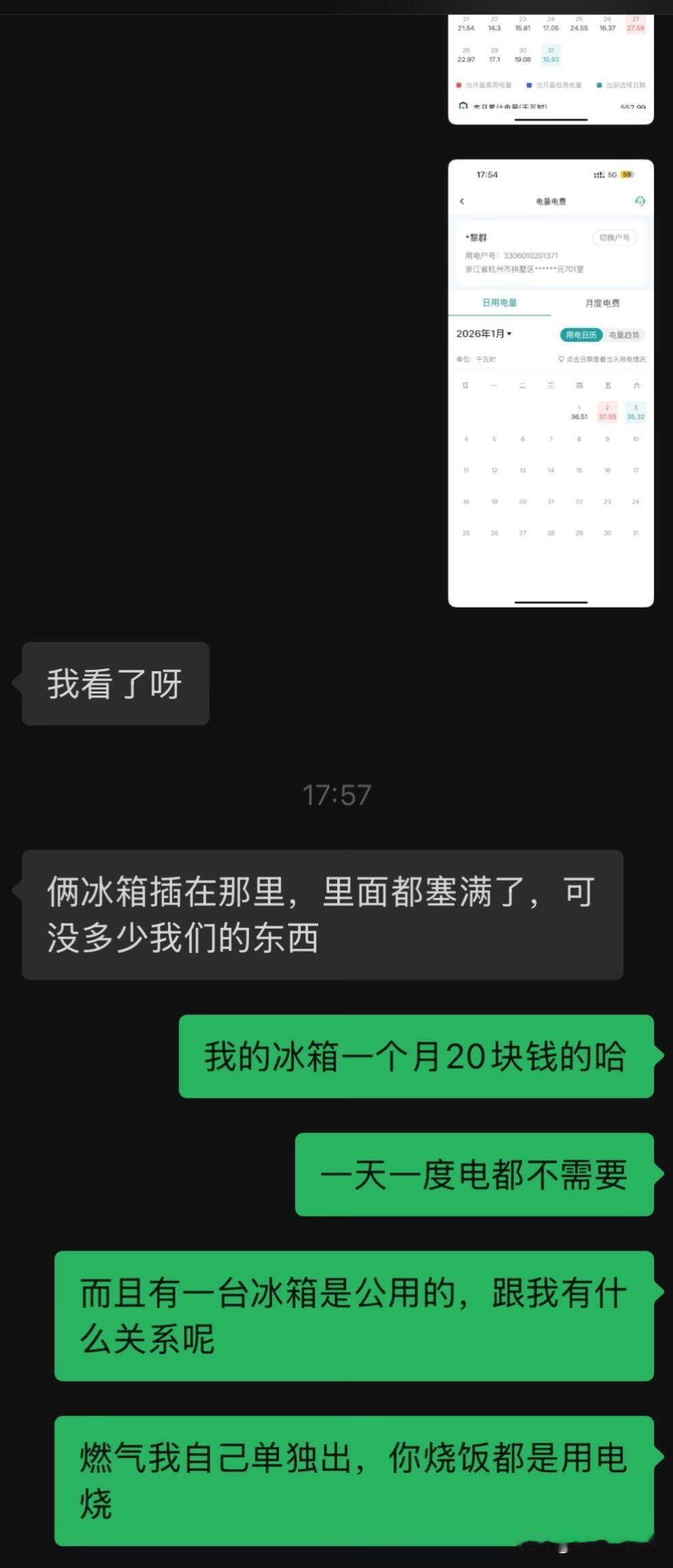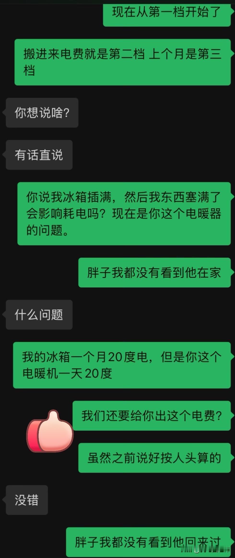 再也不合租了 一人享受 大家买单 之前是说好按人头算水电费的 12月8我买了个冷冻柜搬进来 耗能是0.42一天 看了下用电量没什么区别 再不准确耗电一个月也就20 这个月他买了电暖气开着 这几天用电量多了好多 然后我问他 他就说到我冰箱的事情了 我一个月冰箱20度电 他电暖气一天20度电还不是全天开 过年他不回家 我们都要回家 还要给他分摊水电费 我让他买电热毯 他说他需要环境温度 房间里穿那么少 一年四季就那条被子 春夏秋冬都用同一条被子 不冷才怪 房租都是我朋友给他垫付的 欠我朋友那么多还没还 还不去上班 一天待家里开暖气 我们就晚上回去洗漱下躺床上玩会儿手机睡觉了 每天早上八点之前就上班去了 根本用不到啥电 前几天晚上点了个外卖 外卖小哥忘记看我备注了 11点多按了一下门铃 我还怕这个门铃影响到他了 很不好意思 拿完外卖我就设置了晚上按门铃不响的功能 但是第二天我睡醒看到他直接给我门铃拆了 真神经一样