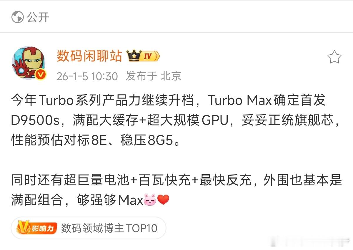 没想到新年的第一款机器居然是Turbo5Max,这代产品力升级有点猛,而且Max倒影下来是啥?首先你从产品序列上看,这代升级到了Max,参考小米汽车的定位,Max肯定要配置和价格都会涨,我觉得可能要贵个200-300。天玑9500s芯片也算是9400+的小升级,性能也非常能打,绝对是旗舰体验。现在内存涨价特别狠,所以于厂家来讲其实就两个选择,要么配置涨上去涨价,要么减配不涨价,小米很明显是选择前者,因为产品体验才是最重要的。这台手机预估价位应该在2500元左右,大家觉得如何?